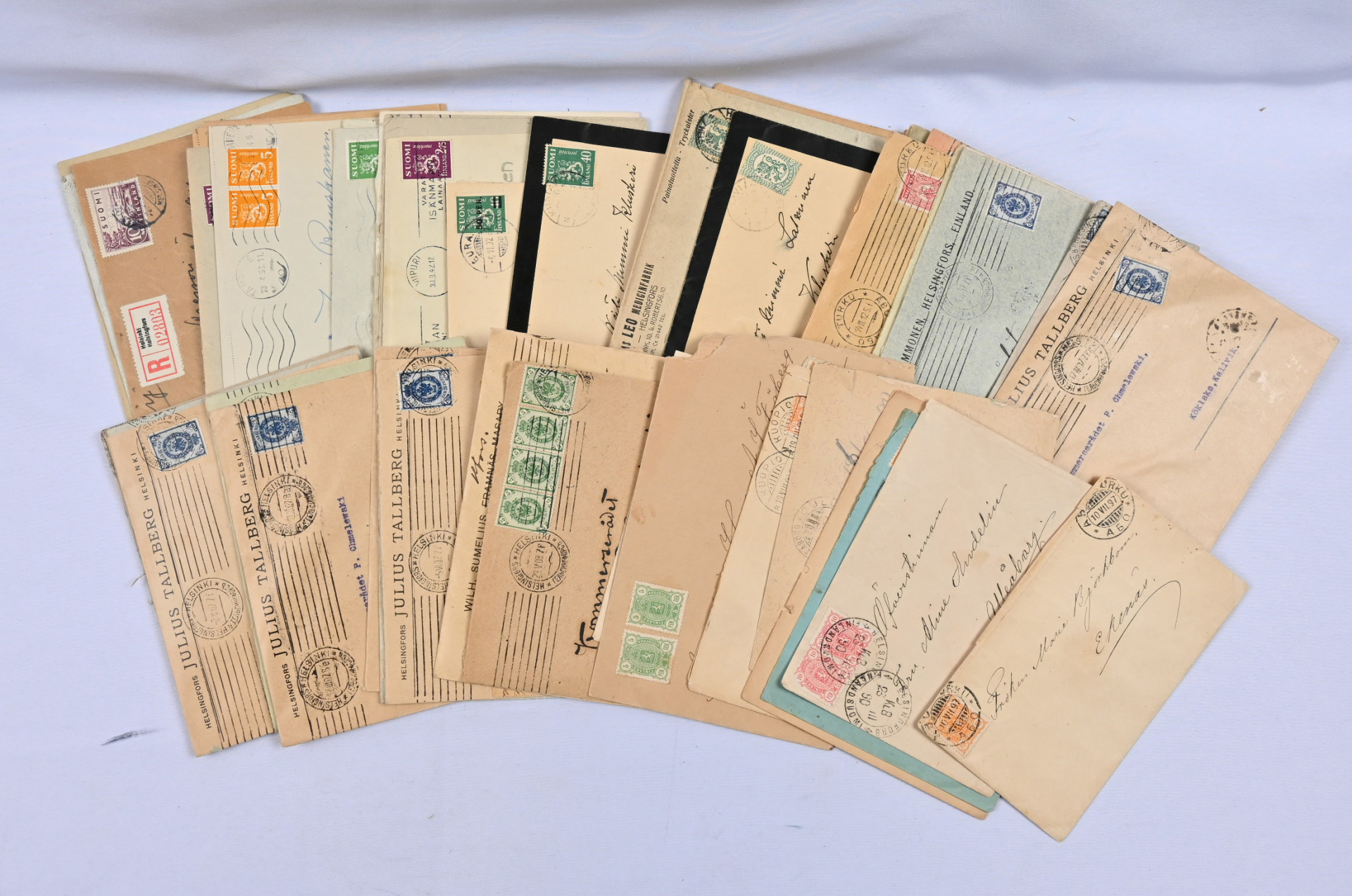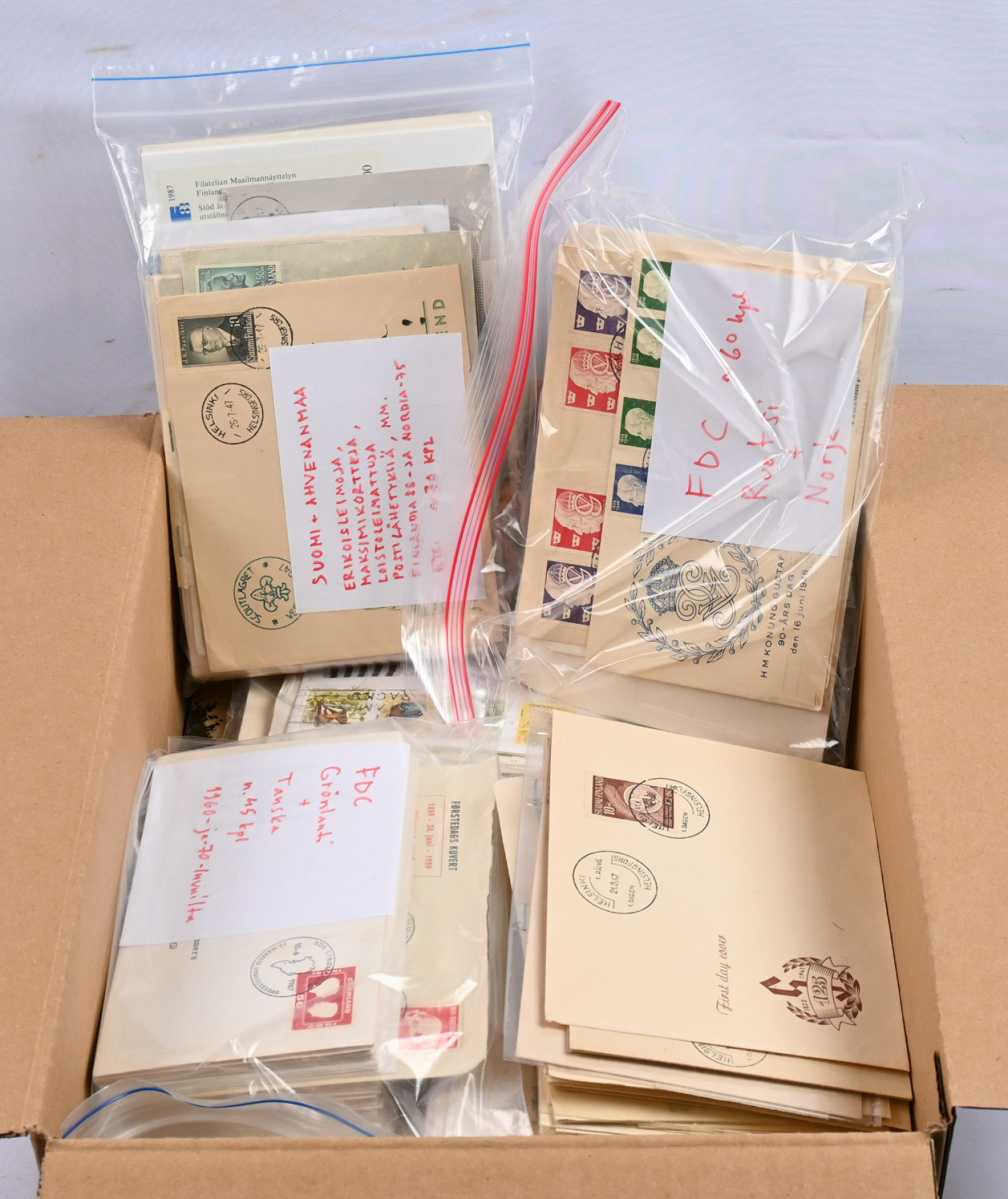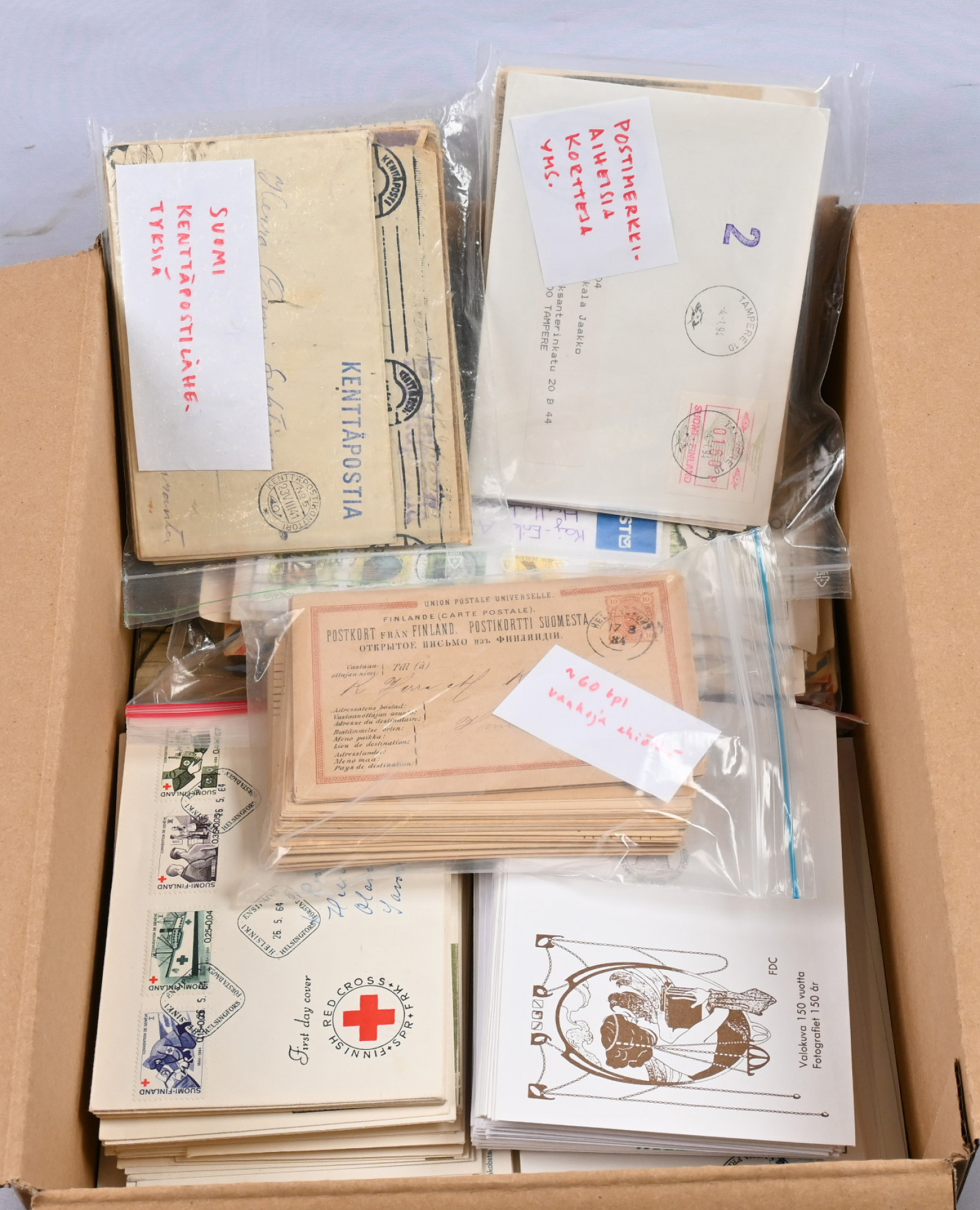 Suomen ja ulkomaiden/Suomeen tulleita lähetyksiä noin 5,5 KG laatikollinen. Vanhaa ja uutta, ehiöitä, kenttäpostia, FDC-kuoria (Suomi ja Pohjoismaat) ym. tutkittavaa