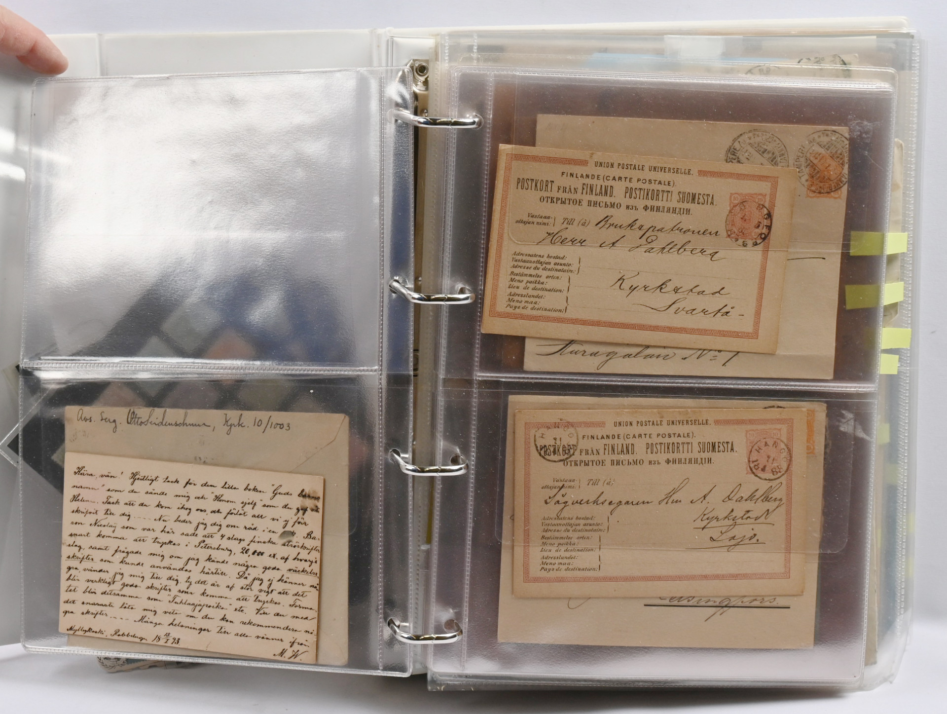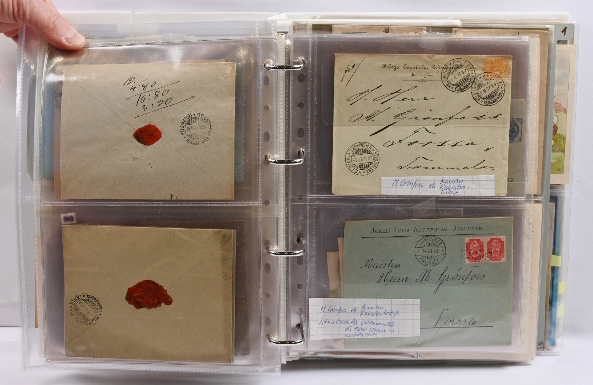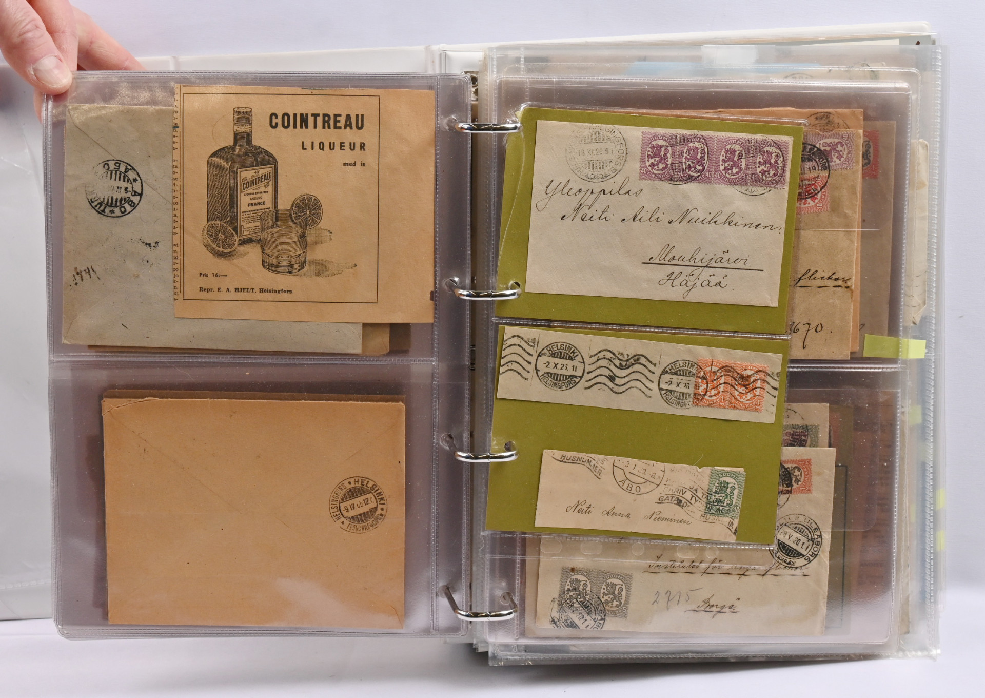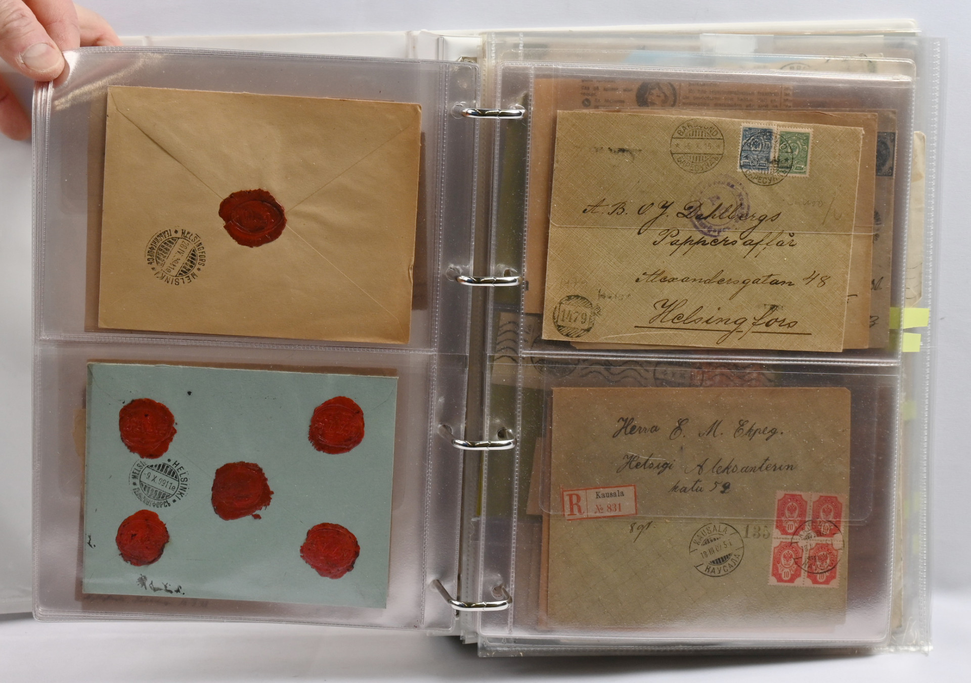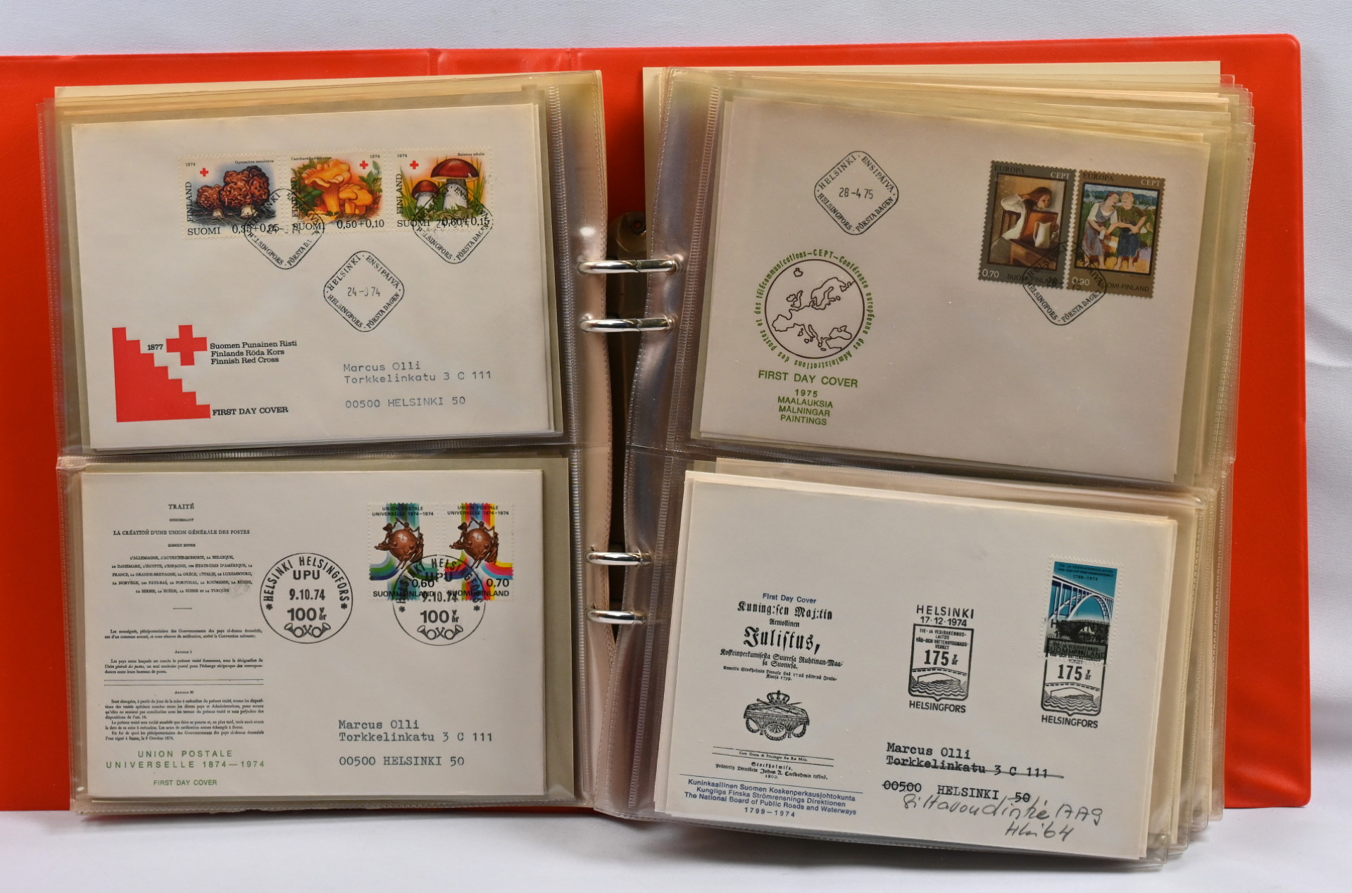 Paksussa mapissa erä vanhempia ja uudempia lähetyksiä ja vähän muutakin materiaalia. Mm. 1889 - 1901 firmakuoria, kirjattuja ym Lisäksi 1974 - 1984 FDC-kokoelma kahdessa kuorikansiossa