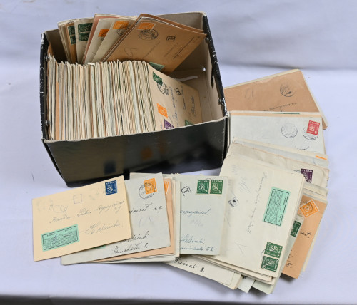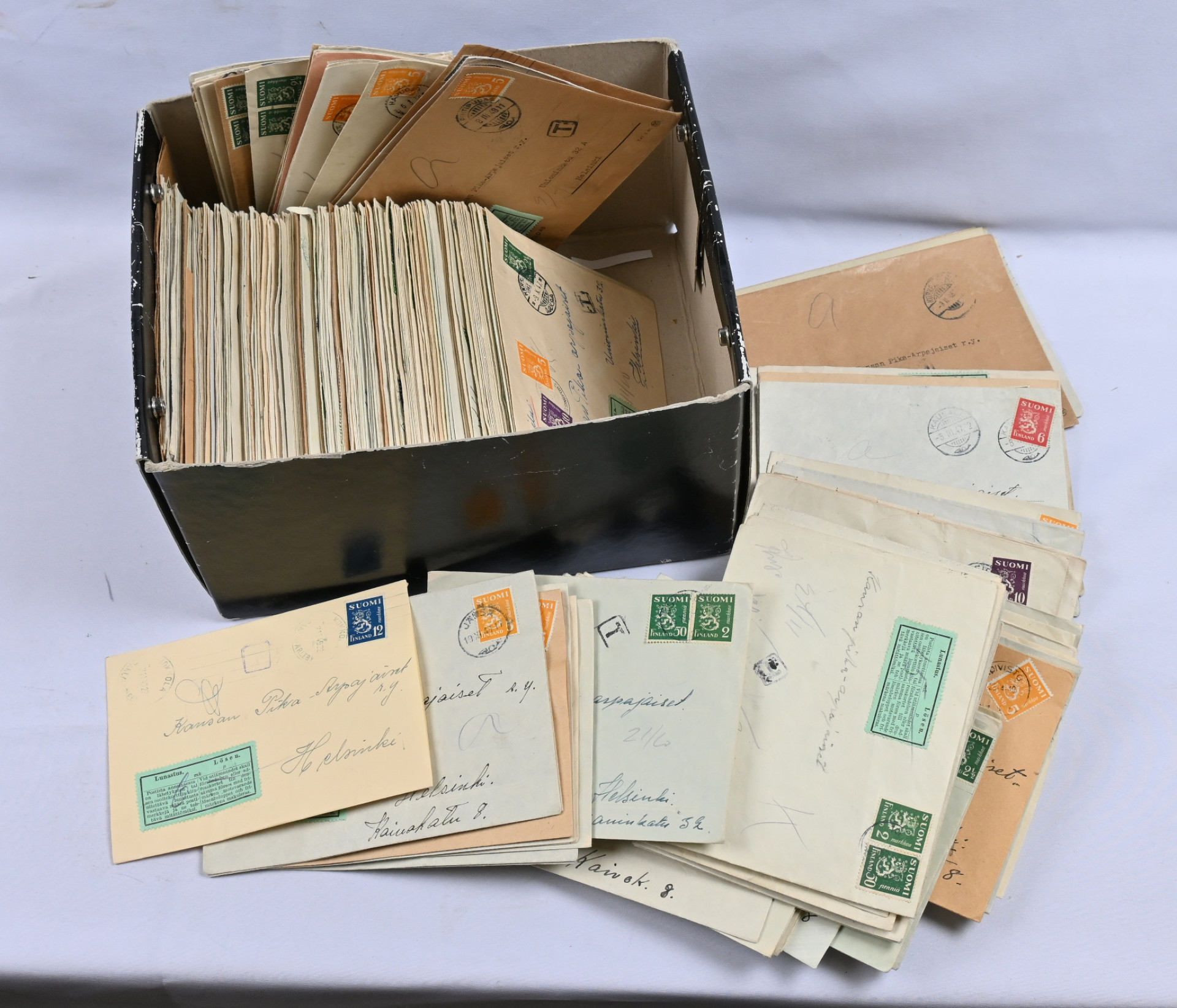 M/1930 lunastuslähetyksiä noin 1,4 KG laatikossa, noin 300 kappaletta. Lähinnä vastauslähetyksiä 1940-luvun loppupuolelta. Paljon eri paikkakuntia