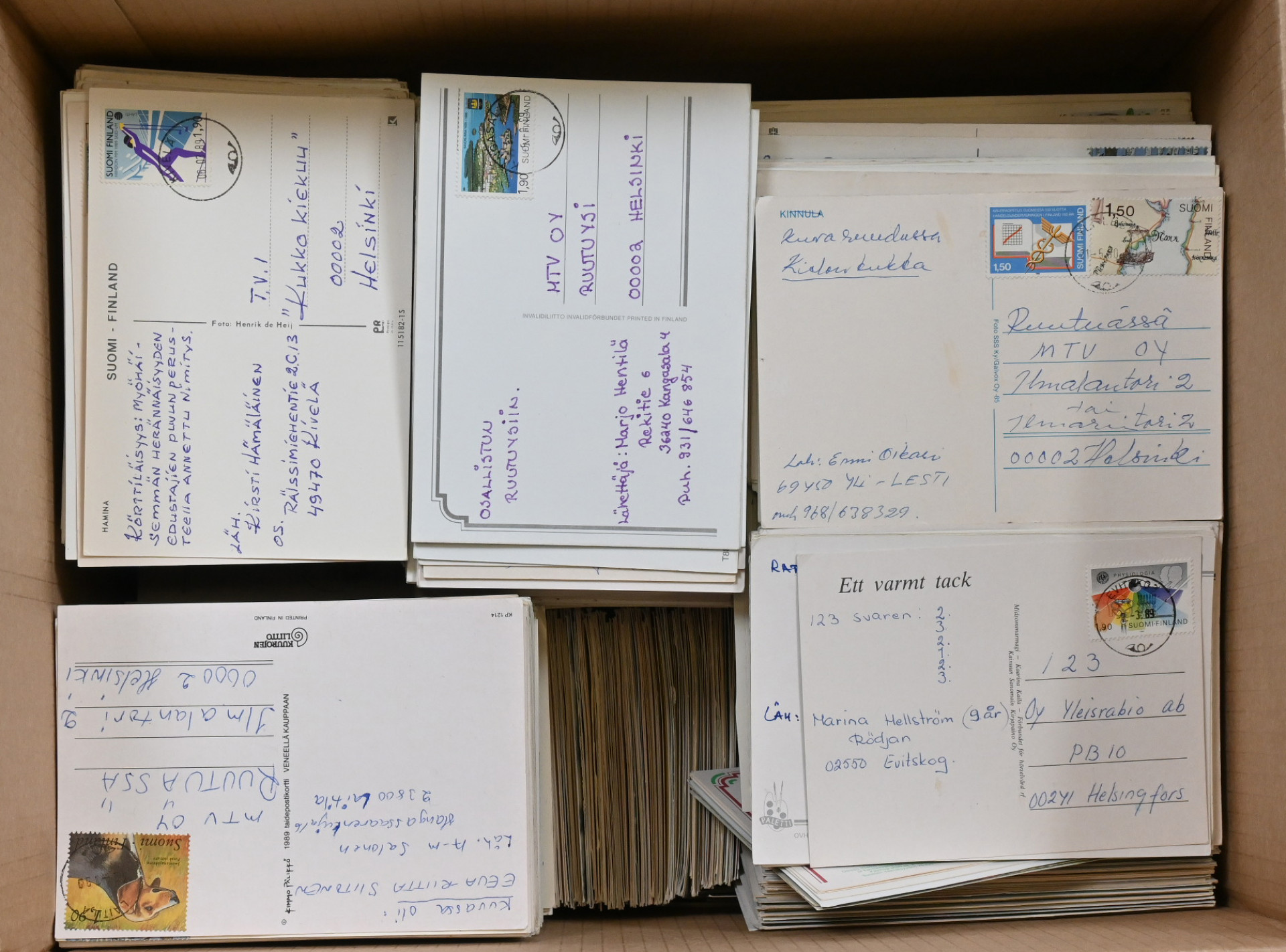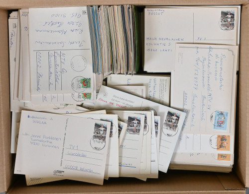 Kilpailuvastauskortteja kauniilla leimoilla erittäin iso erä 16 KG laatikossa. Pääasiassa vuosilta 1985 - 1993. Lähes kaikki kortit ovat lähes loisto - loisto - nappiloistoleimaisia, lähinnä pienempien paikkakuntien leimoilla. Tutkittavaa! .