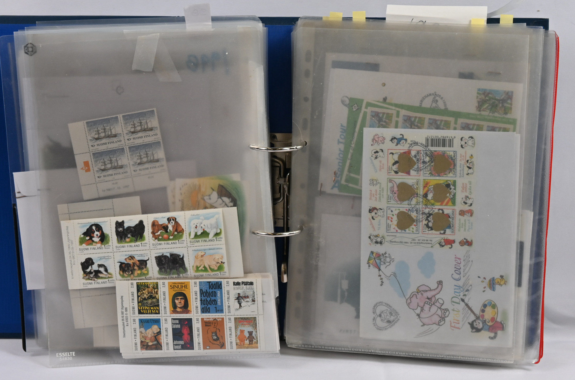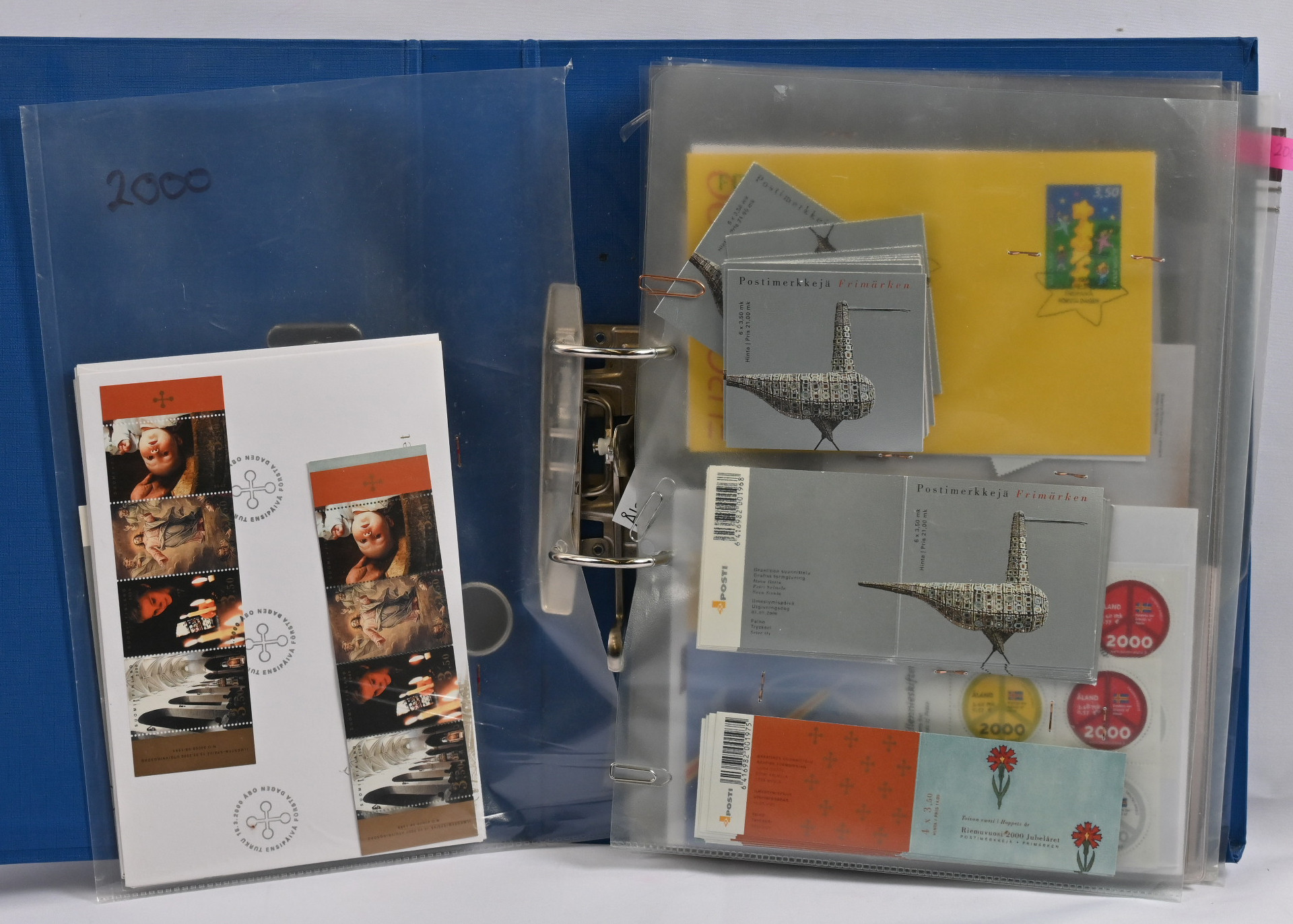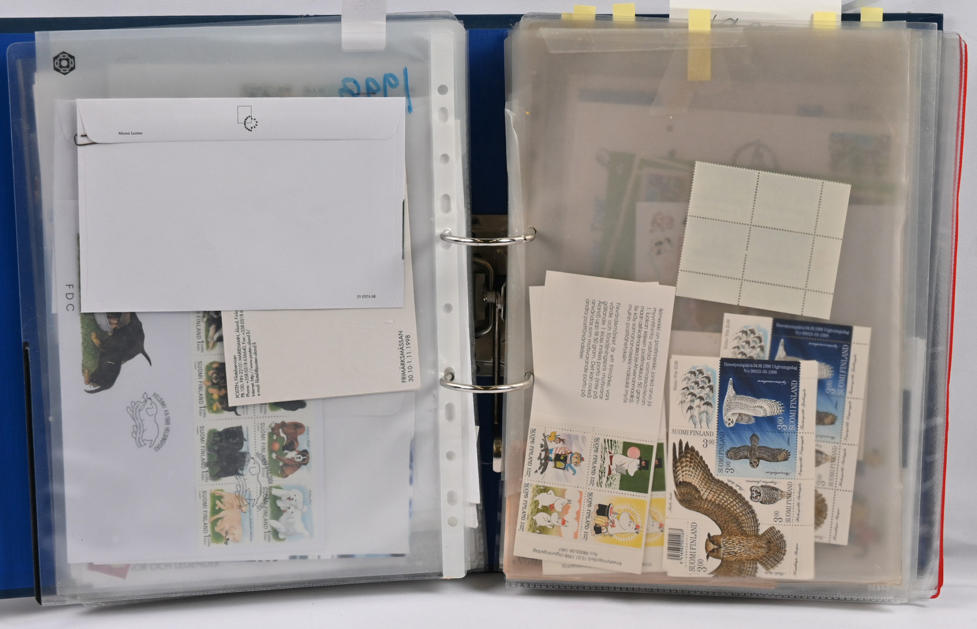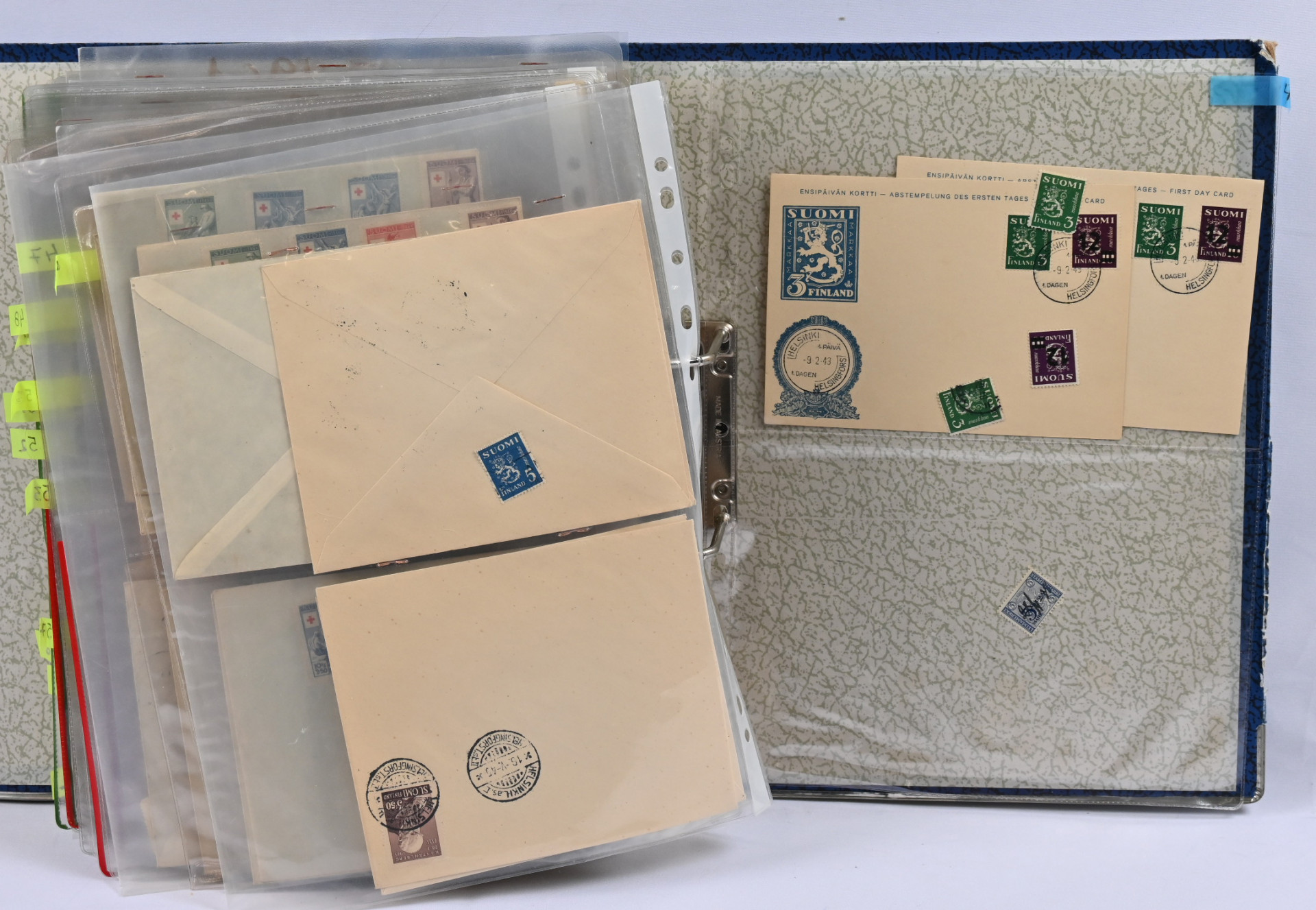 1940-luvulta 2000-luvulle iso FDC ja merkkivarasto kahdeksassa mapissa uudemmassa päässä mm. vihkoja ja pienoisarkkeja ** myös 1. luokan merkkejä! Vanhassa päässä pikku hyviä FDC:tä kuten m/30 leijonat 3 markkaa ja 12/10 markkaa, 1946 PR sarjaa useampi jne.