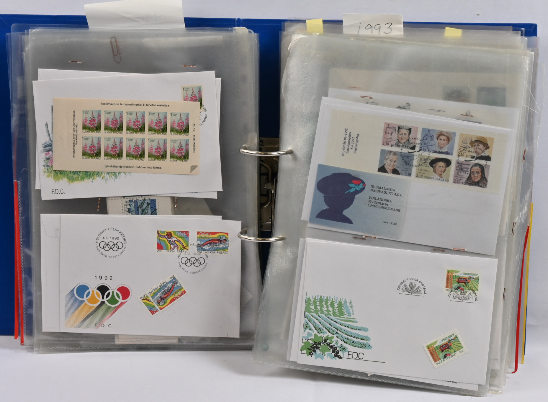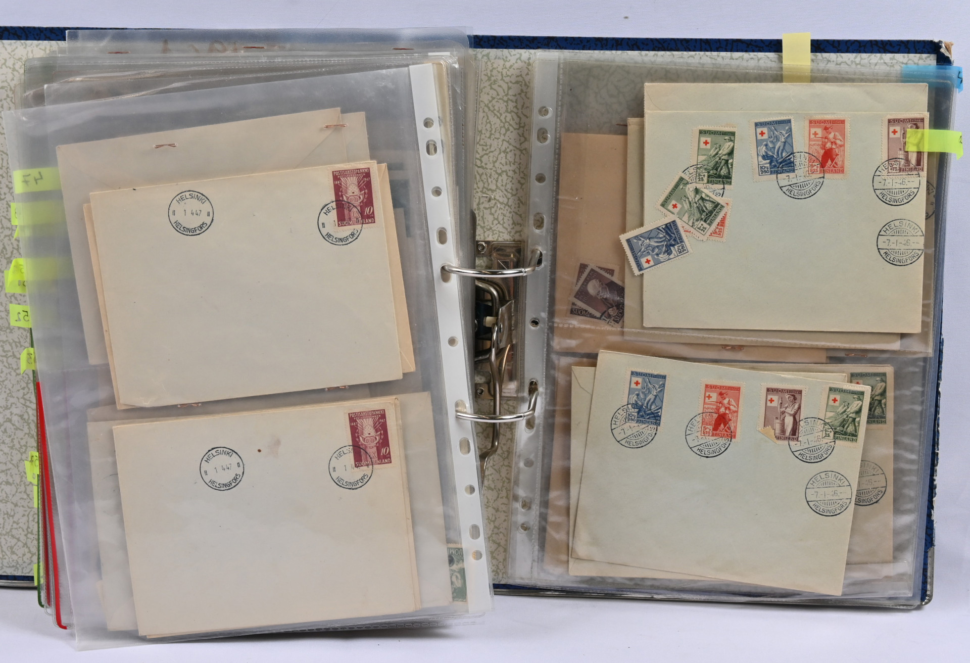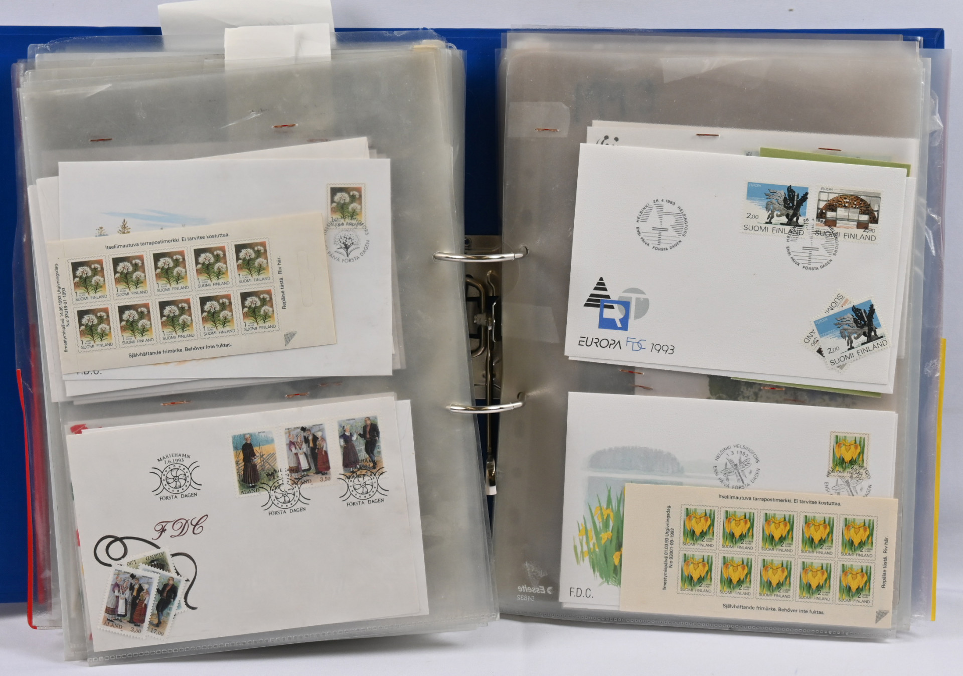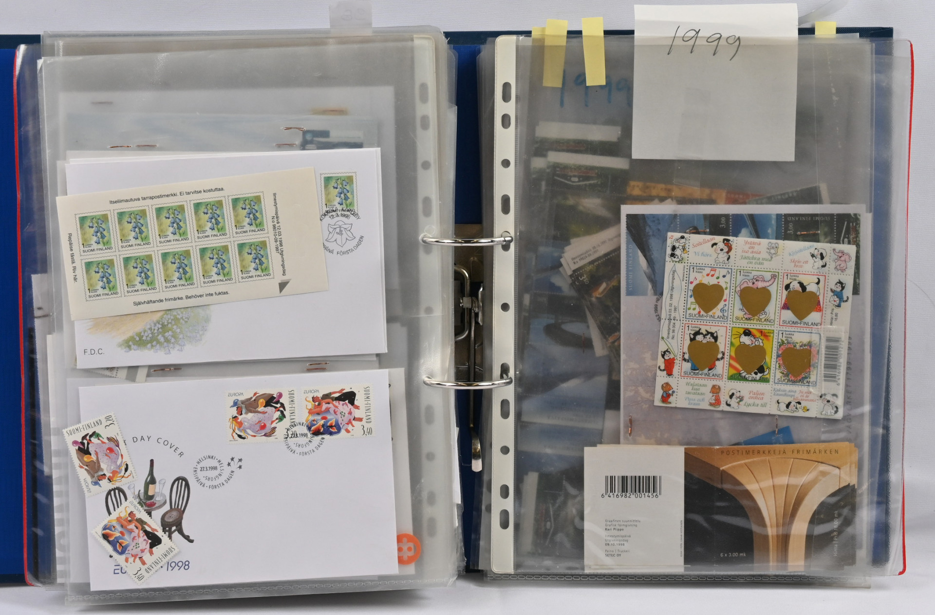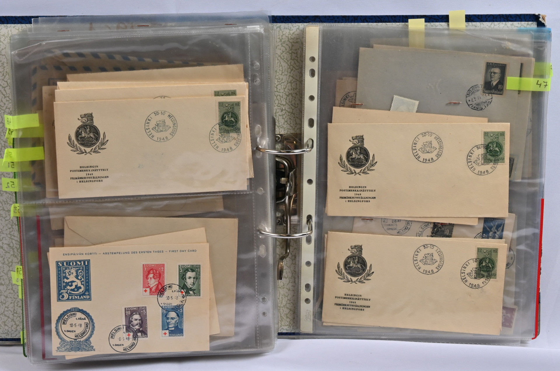 1940-luvulta 2000-luvulle iso FDC ja merkkivarasto kahdeksassa mapissa uudemmassa päässä mm. vihkoja ja pienoisarkkeja ** myös 1. luokan merkkejä! Vanhassa päässä pikku hyviä FDC:tä kuten m/30 leijonat 3 markkaa ja 12/10 markkaa, 1946 PR sarjaa useampi jne.