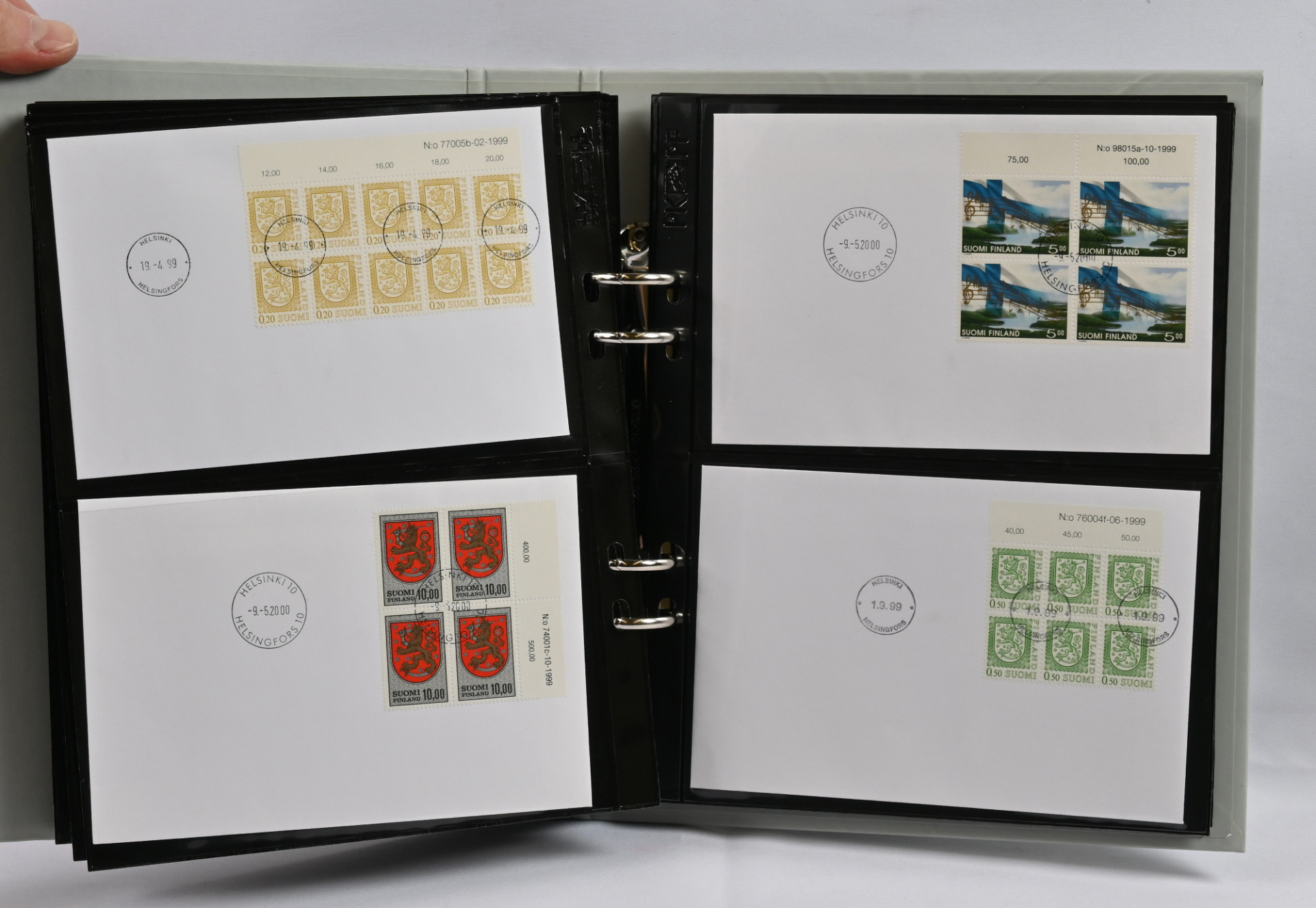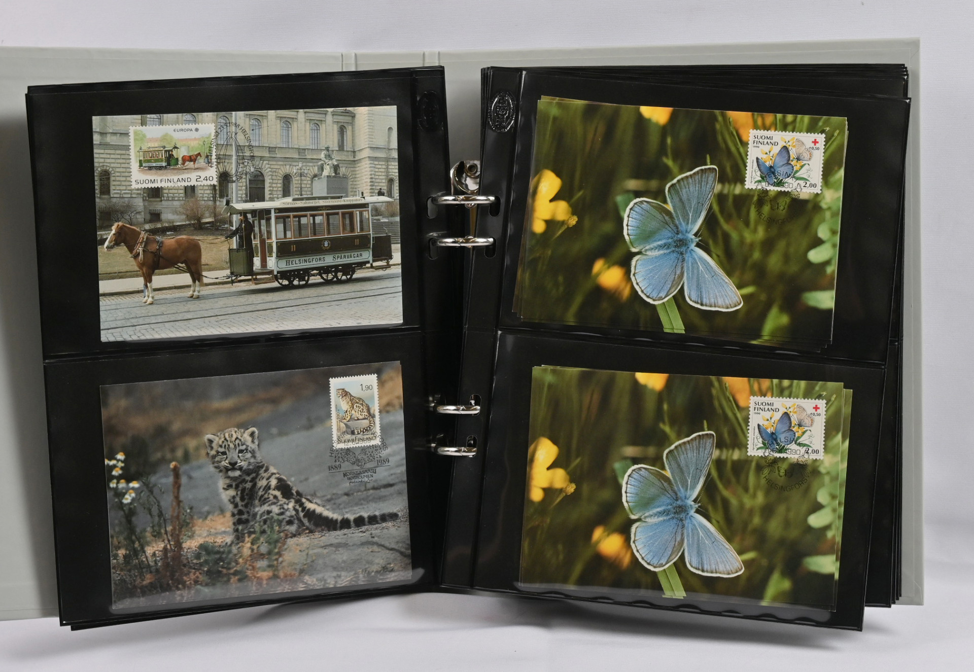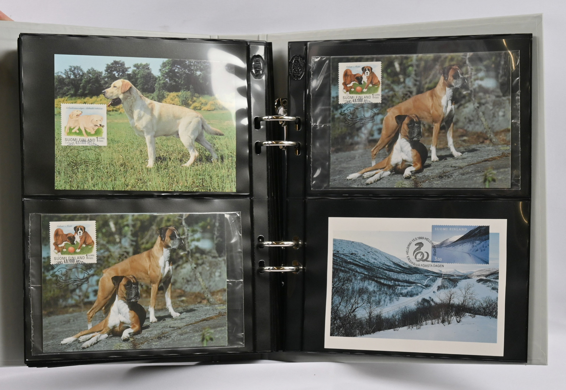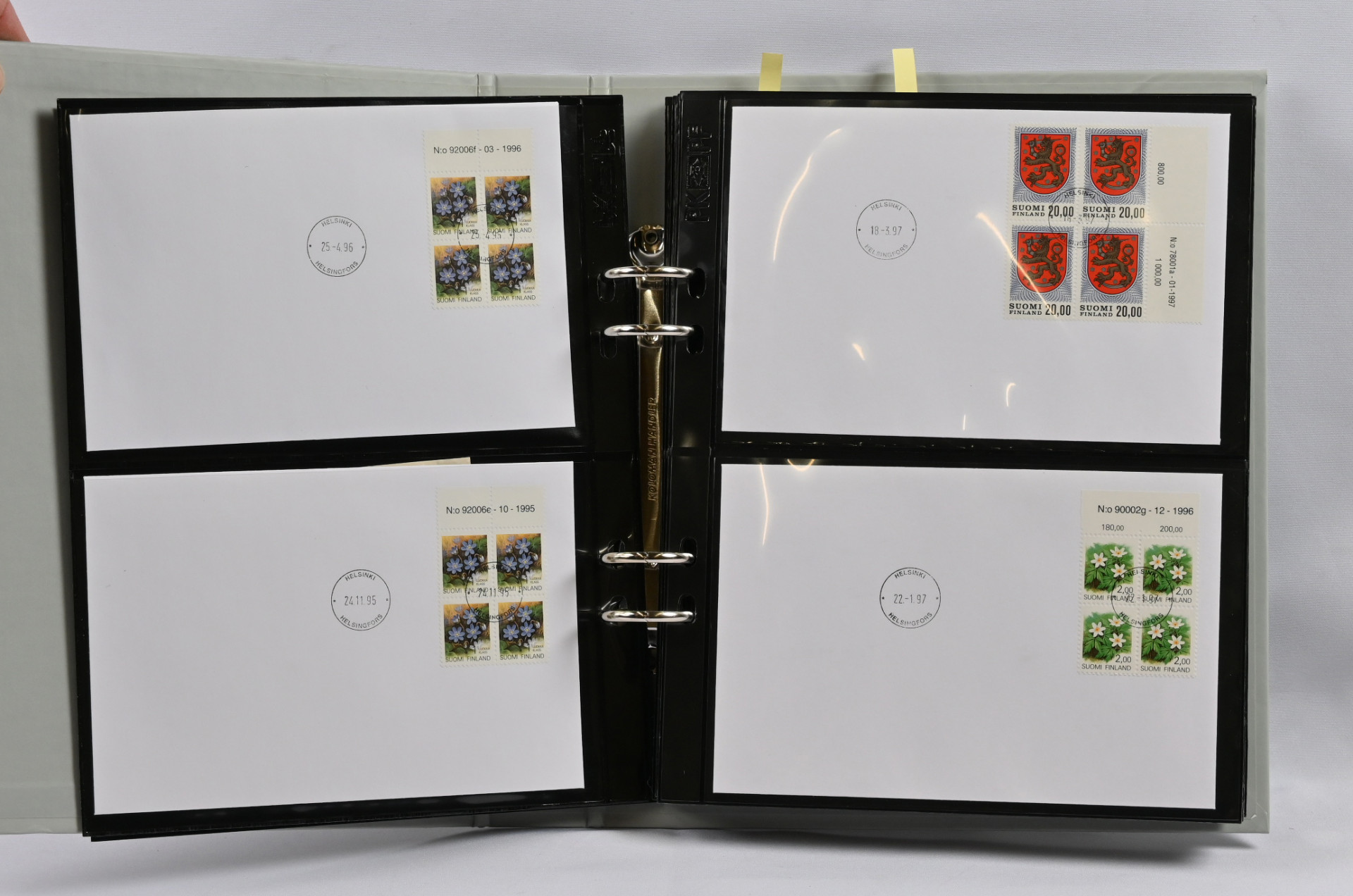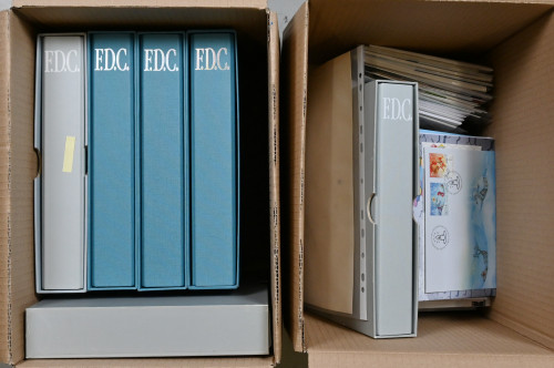 FDC-kokoelma 1984 - 2014 kahdessa laatikossa, yht. yli 11 KG. Vuodet 1984 - 1999 neljässä kuorialbumissa, lisäksi viidennessä kuorialbumissa maksikortteja ja kuudennessa albumissa m/1975 ja m/1990 myöhäisimpien painoerien FDC-kuoria - poikkeuksellista materiaalia. Vuosien 2000 - 2014 kuoria irrallaan sisältäen myös maksikortteja, näyttelykortteja ym.