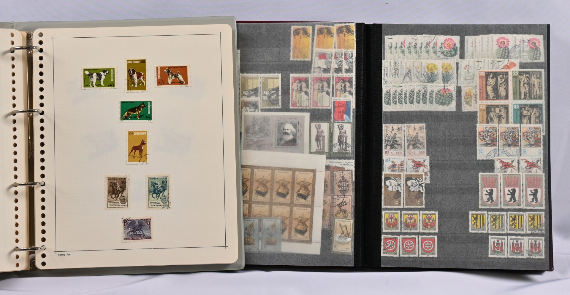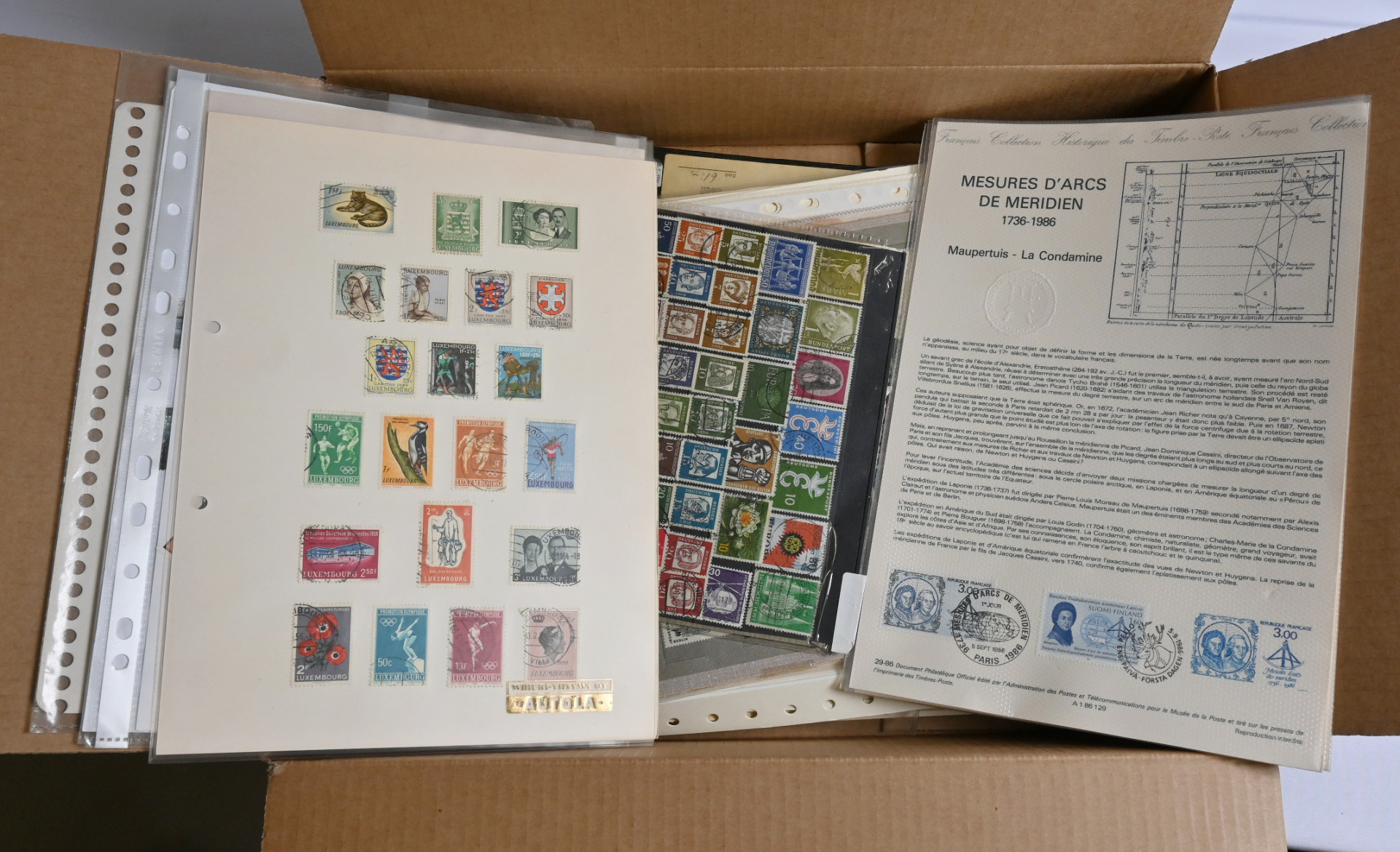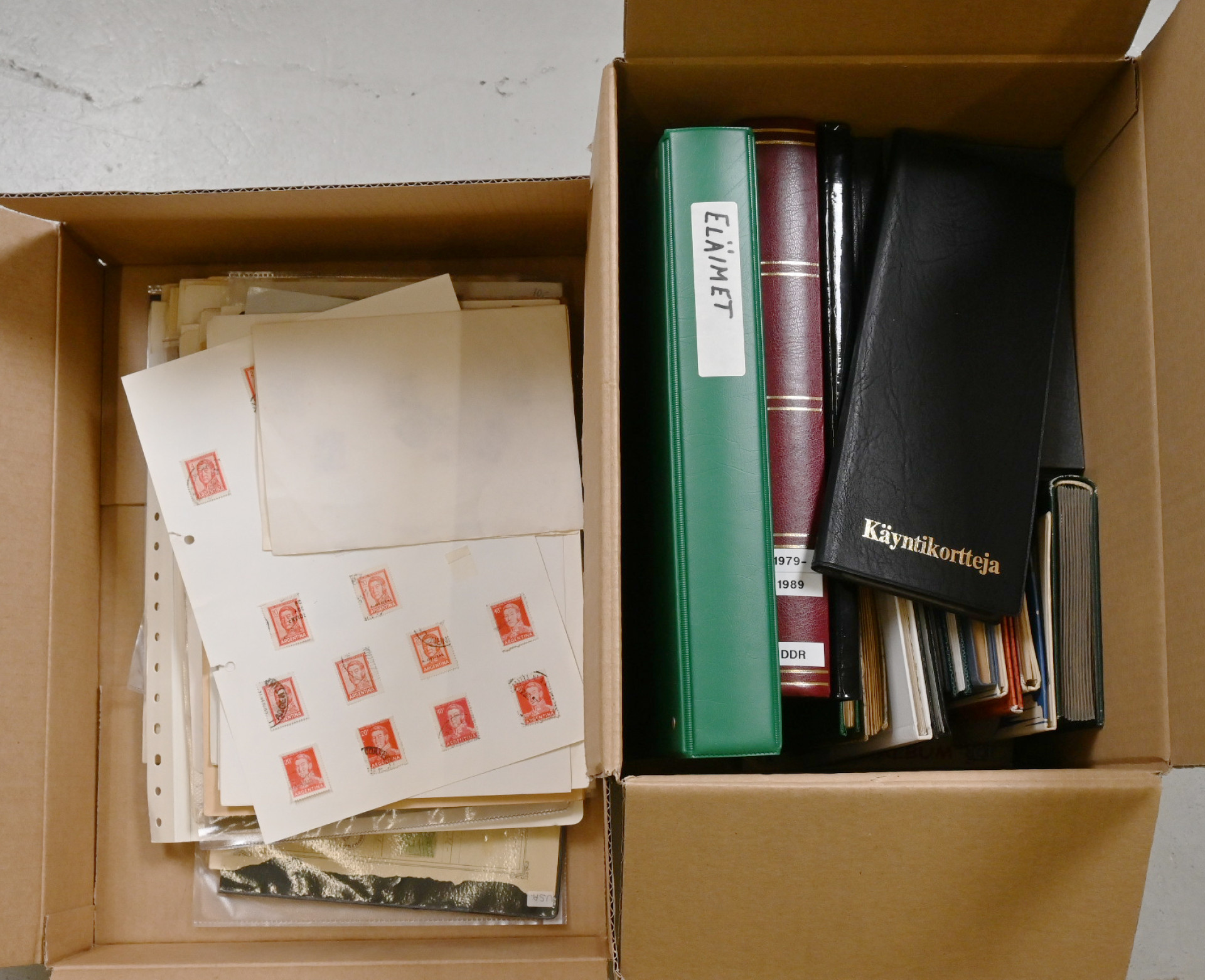 Massaerä kokomaailmaa kahdessa laatikossa, yhteensä yli 10 KG. Säilytyslehdillä, kansiosivuilla ja yli 20 pienessä säiliökirjassa ym.