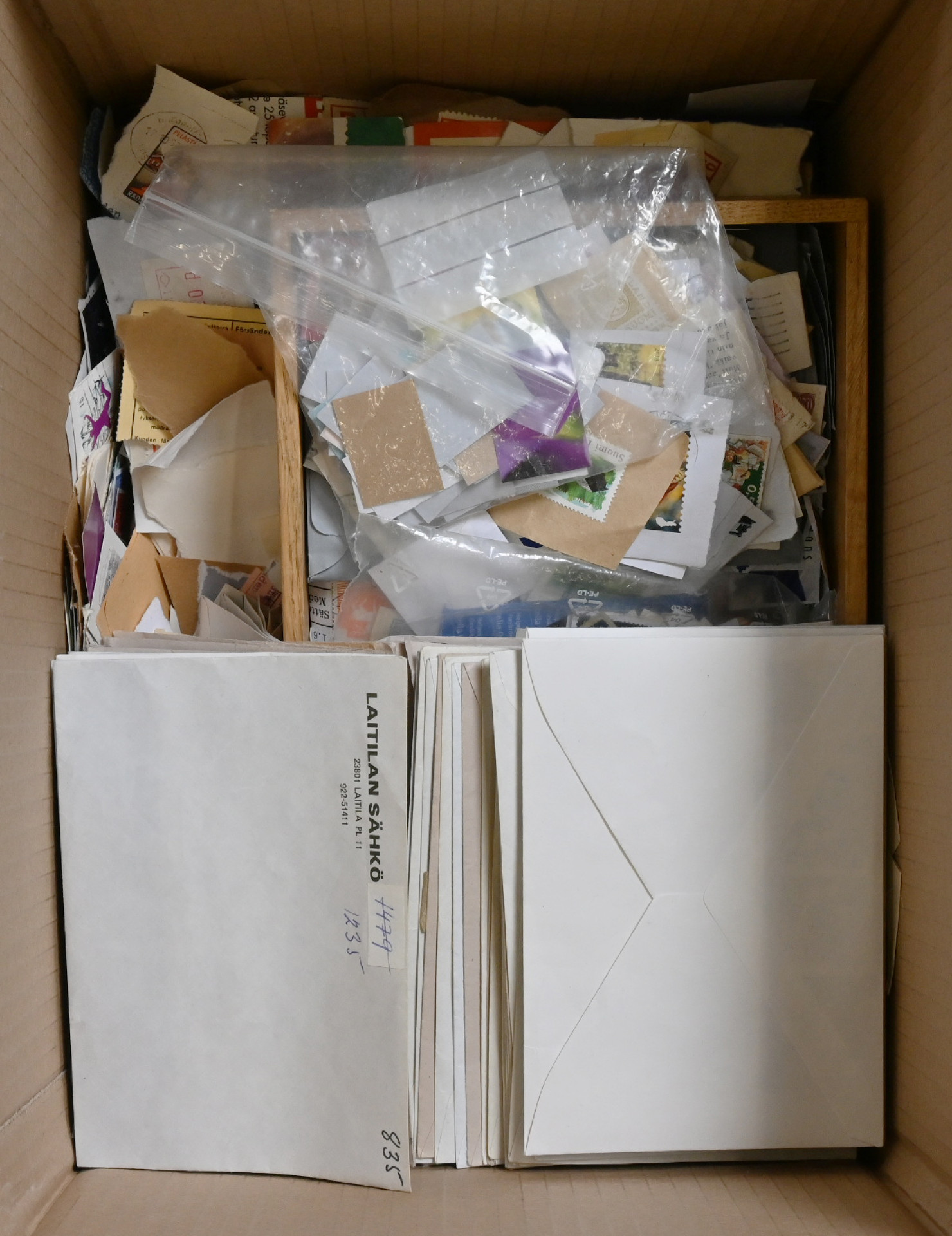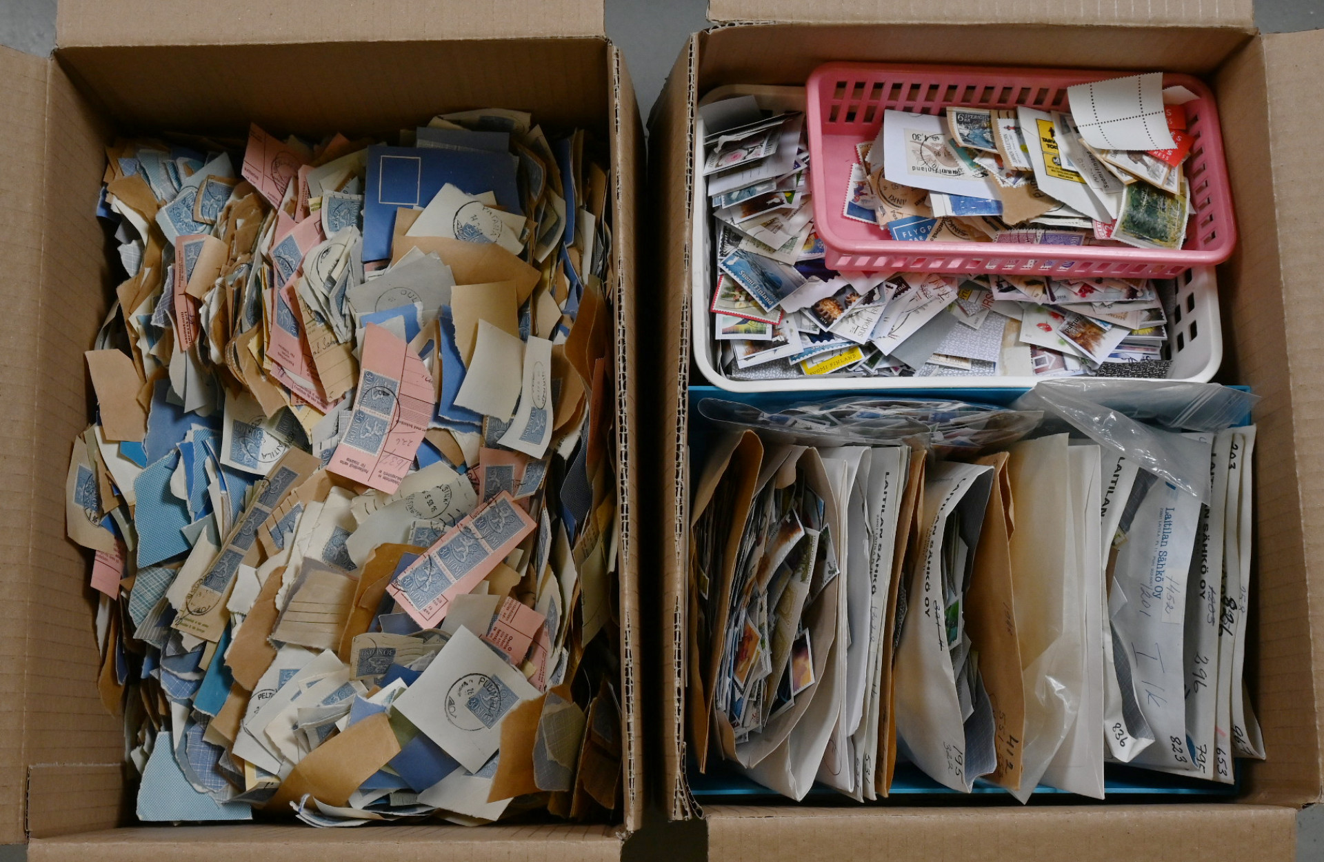 Massaleikettä eri ajoilta 4 KG laatikossa. Materiaalia pienissä laatikoissa ja kirjekuorissa, pusseissa ym. Paljon euroaikaista materiaalia, myös hiukan ulkomaita seassa sekä kirjeensulkijoita jne. Lisäksi m/54 30 markan leijonamerkkileikettä n. 2 KG