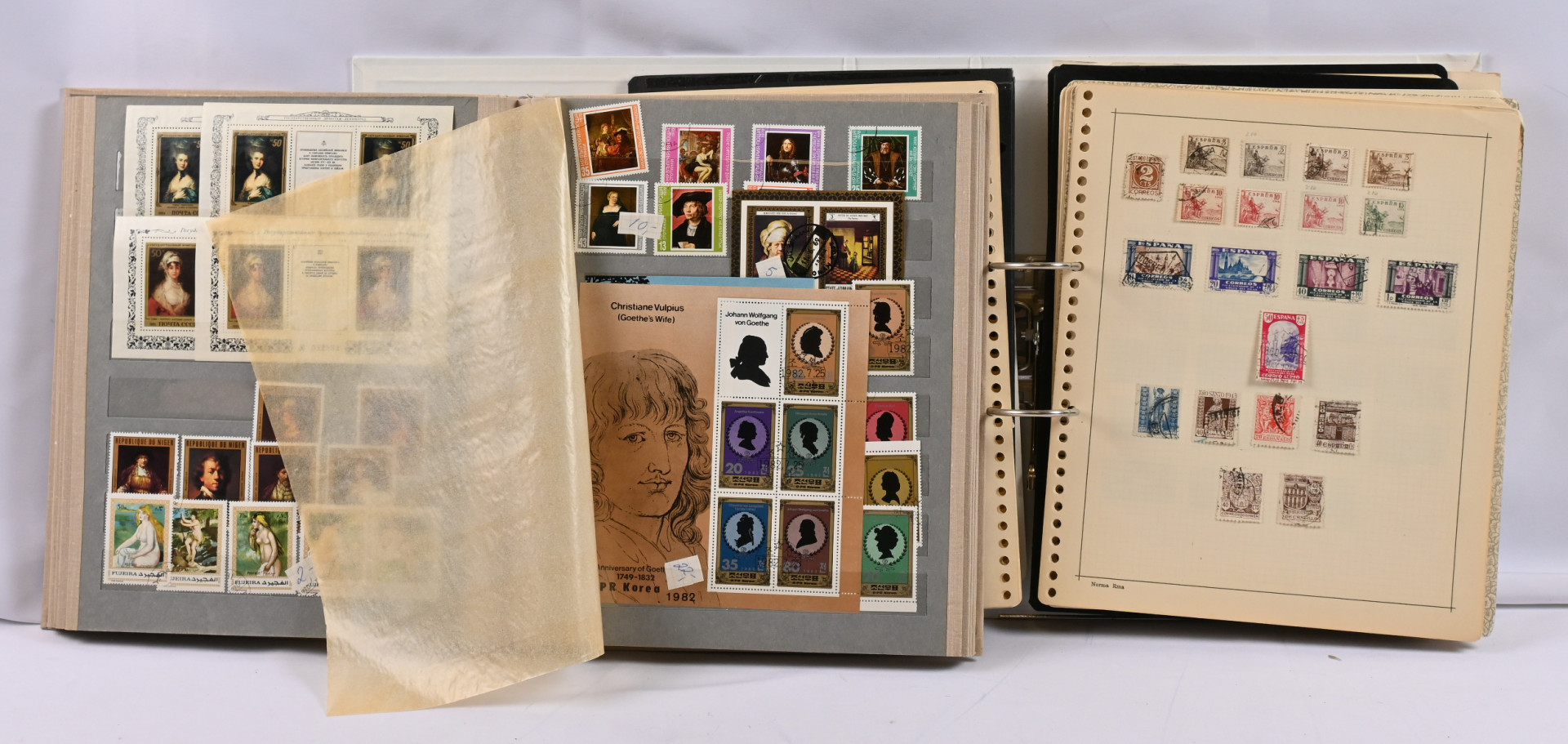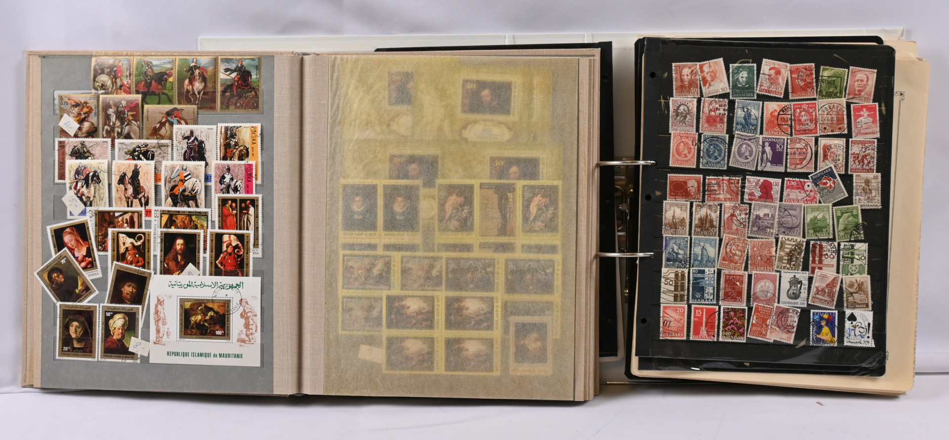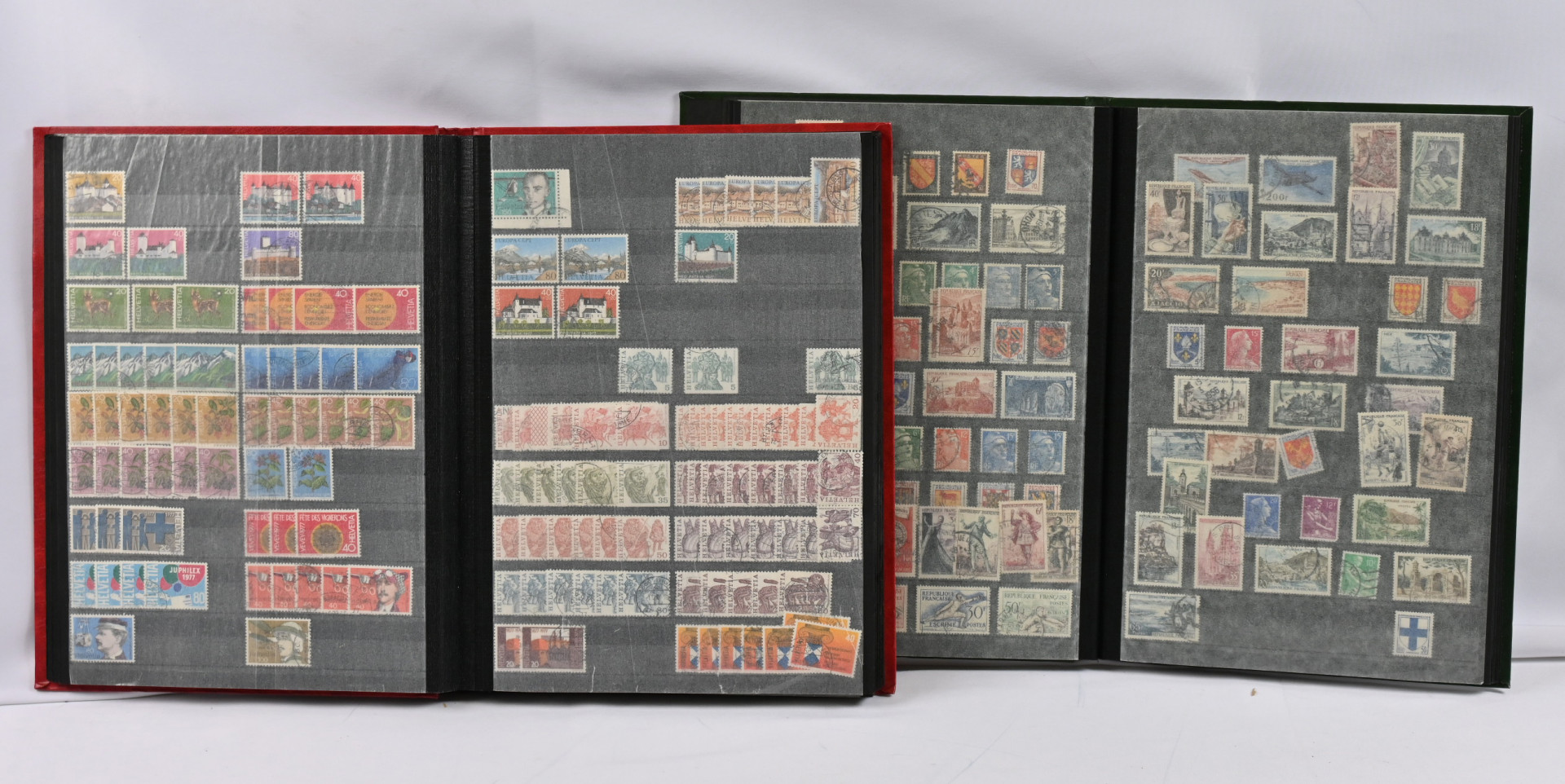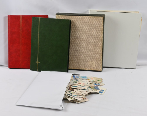 Ulkomaiden postimerkkejä kahdessa säiliökirjassa ja sivuilla mapissa. Sveitsiä, Itä-Eurooppaa ym. Myös vähän pestyä massaa