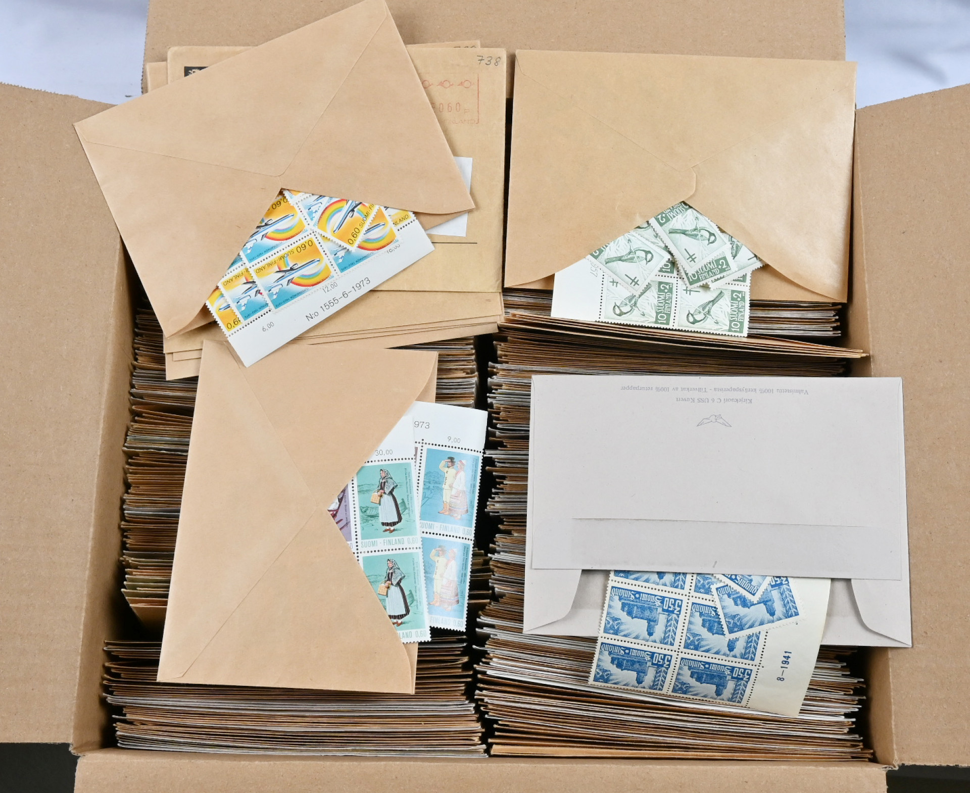 1929 - 1988 suuri postituore ** varastomateriaali laatikossa lajiteltuna kirjekuoriin, paljon Punaisen Ristin ja tuberkuloosin merkkejä, käyttösarjoja jne. Bruttopaino n. 3½ KG, hyvä erä!