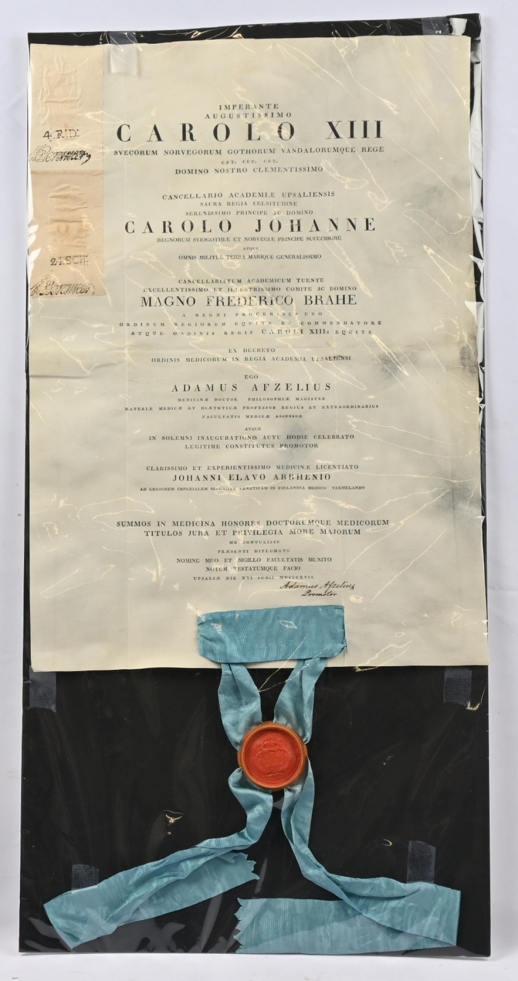 Lääkärin diplomi Johanni Elavo Arrhenio 1817. Upsalan Yliopistosta (toiminut sekä Loviisan että Porin provinsilääkärinä). Hieno pergamentti ja sinetti sekä asiaan kuuluvat leimaveron perinnän merkinnät. VAIN NOUTO