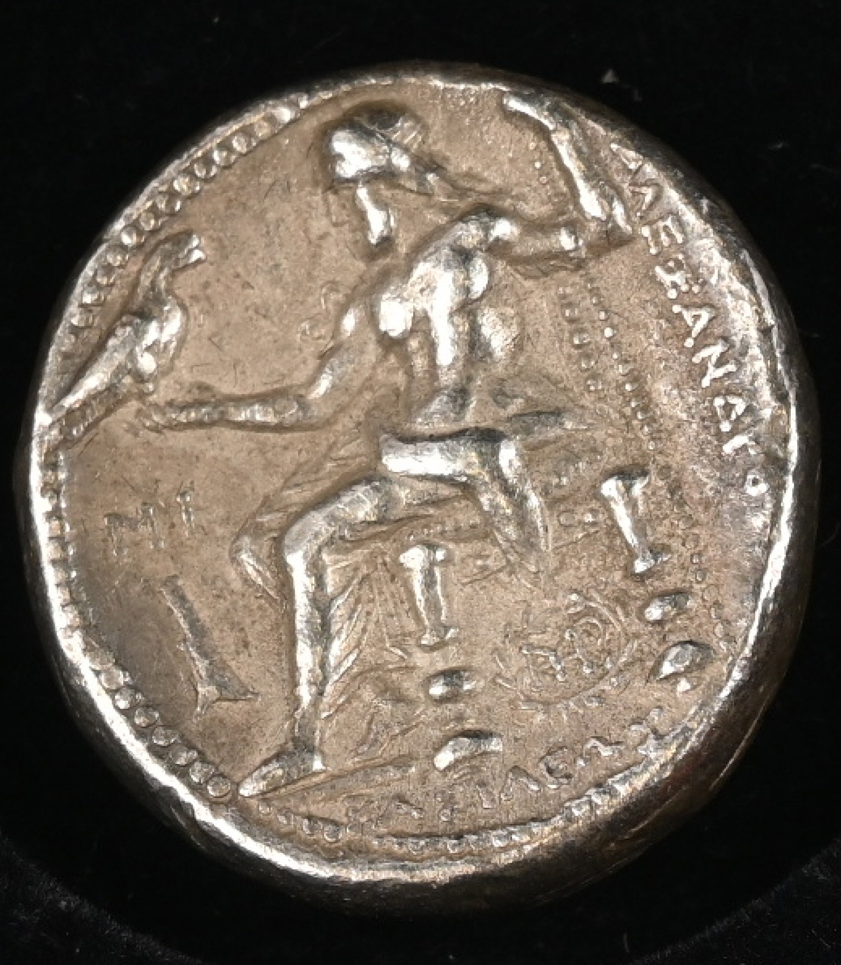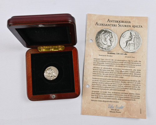 Antiikkinen hopeadrakhma Aleksanteri Suuren (336-323 eKr.) ajalta aitoustodistuksella puulaatikossa.