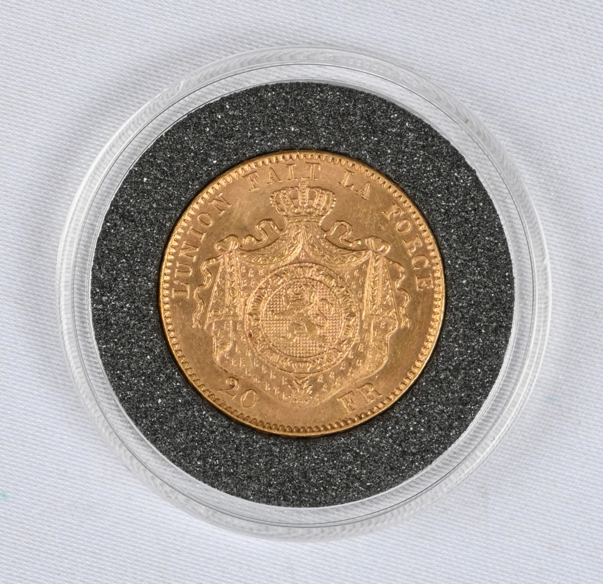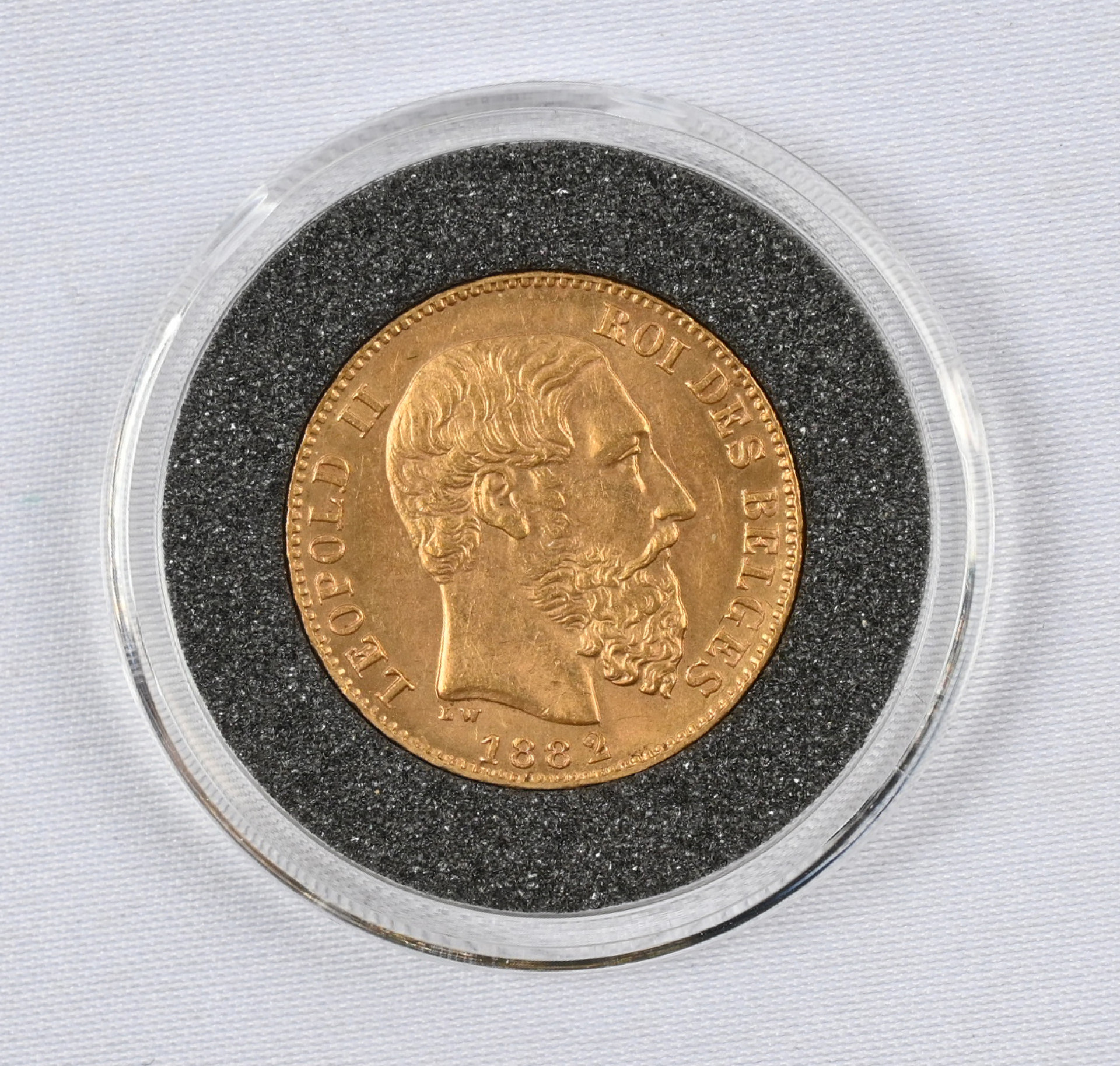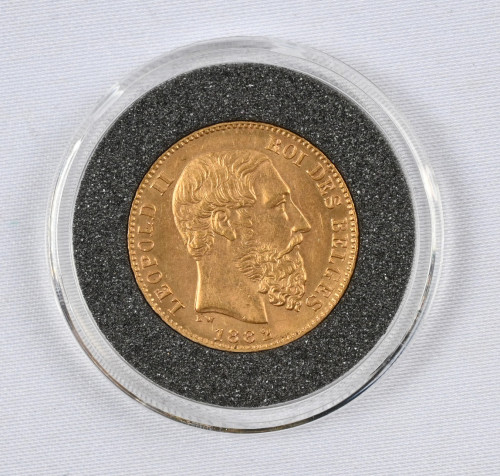 Belgia 1882 20 frangia kultaa (6,45 g - 0,900). Aitoustodistus