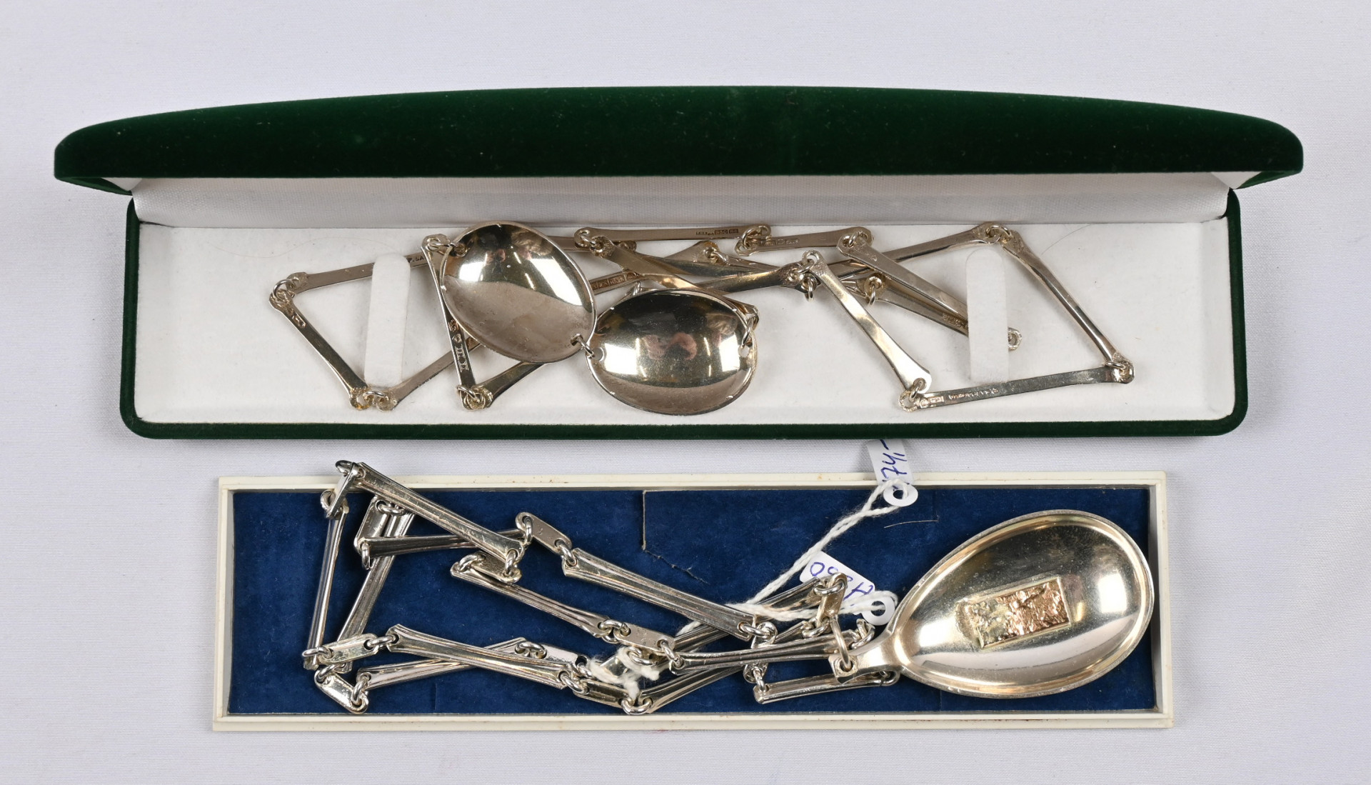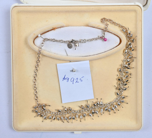 Hopeisia kaulakoruja erä viisi erilaista, joista yksi rintakoru