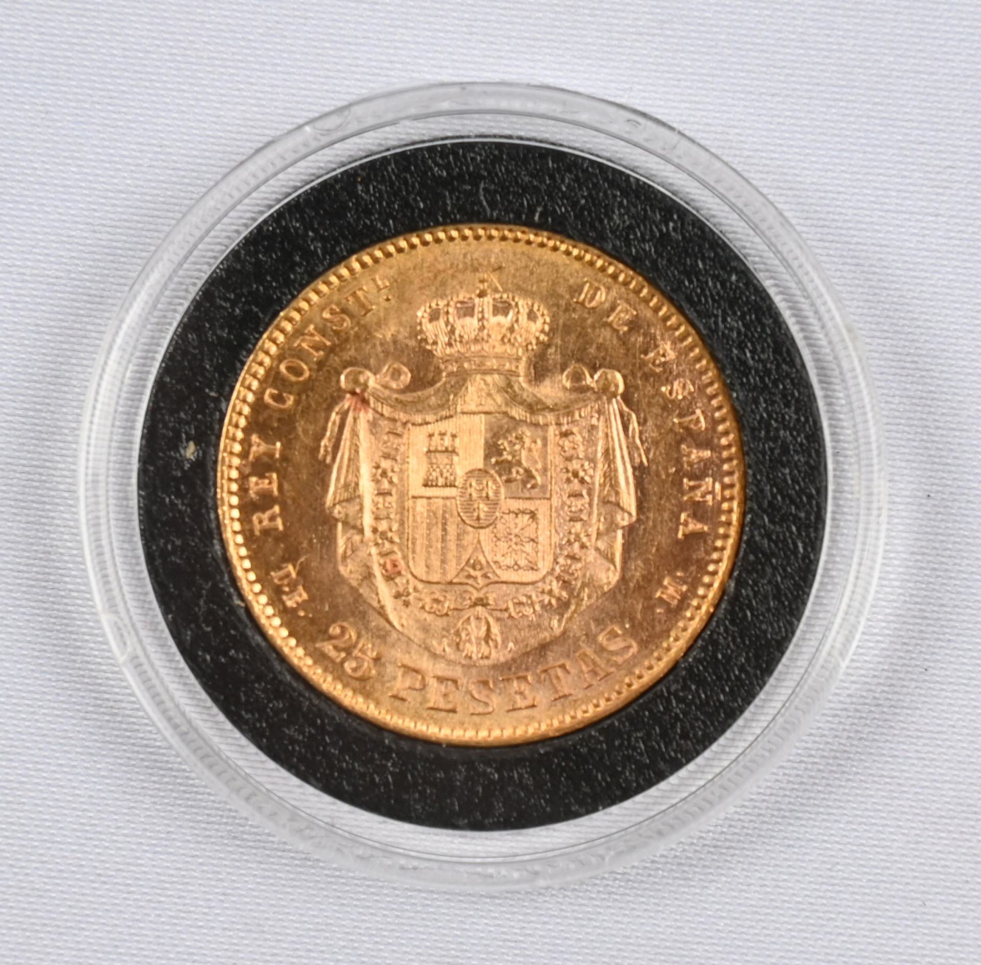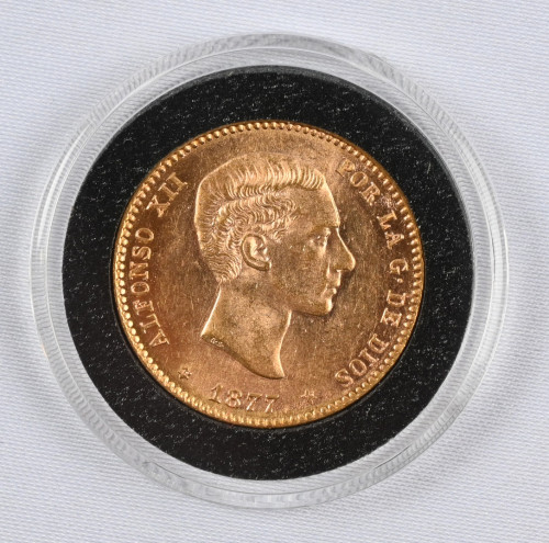Espanja 1877 25 pesetaa kultaa. Aitoustodistus