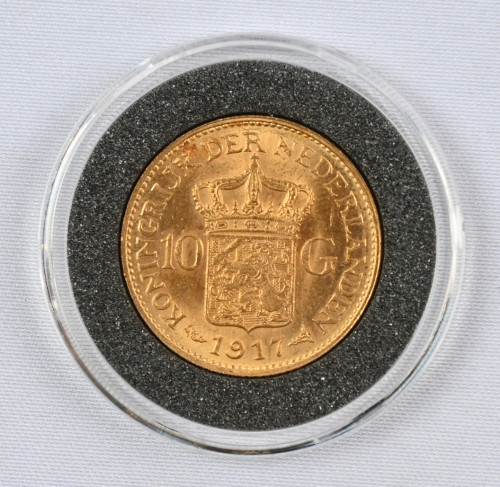 Hollanti 1917 10 guldenia kultaa (6,729 g - 0,900). Aitoustodistus