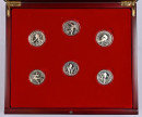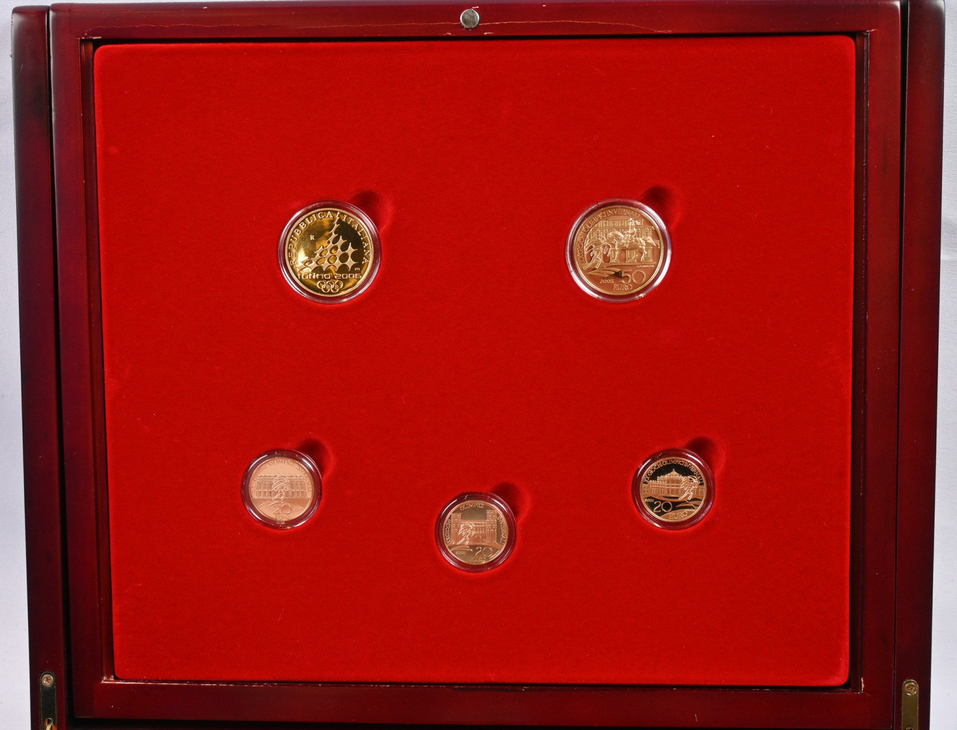 Italia 2006 Torinon Olympialaiset, upea kokoelma laatikossa. Kaksi kappaletta 50 euron (16,13 g) ja kolme kappaletta 20 euroa kultarahoja (900) sekä kuusi hopeakolikkoa. Kaikki aitoustodistuksin