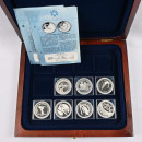 Kahdessa laatikossa hyvä erä hopeisia juhlarahoja. 13 kappaletta ”Viralliset hopeaeurot” kolikoita ja seitsemän Salt Lake Cityn olympiarahoja. Aitoustodistukset