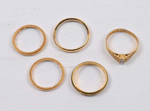 Kultasormuksia (750) viisi kappaletta. Paino yhteensä 13,3 g