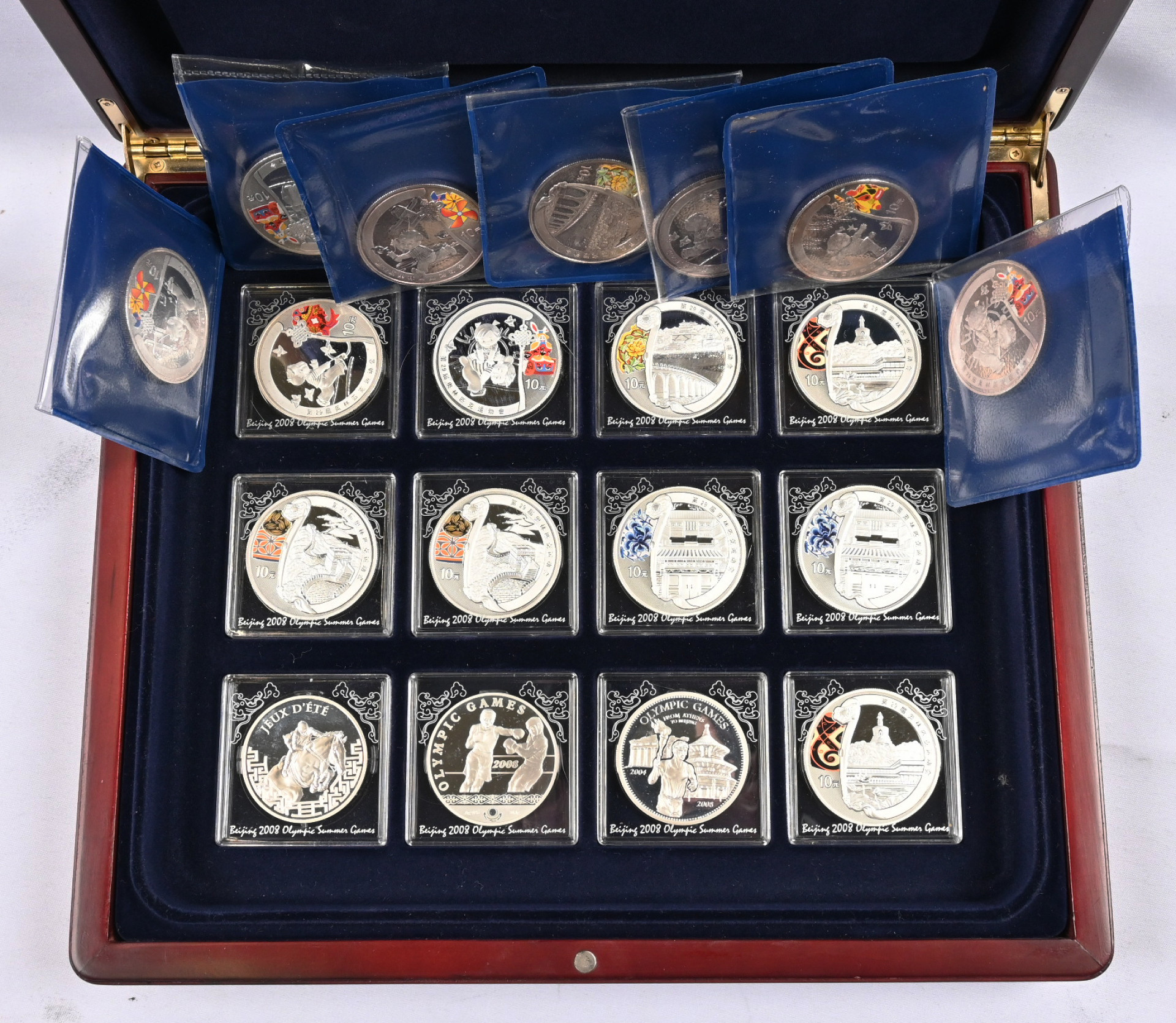Kiina 2006 - 2008 Pekingin olympialaiset, 16 kappaletta 10 Yuanin hopearahoja (31,1 g - 0,999) sekä muutama muun juhlaraha.