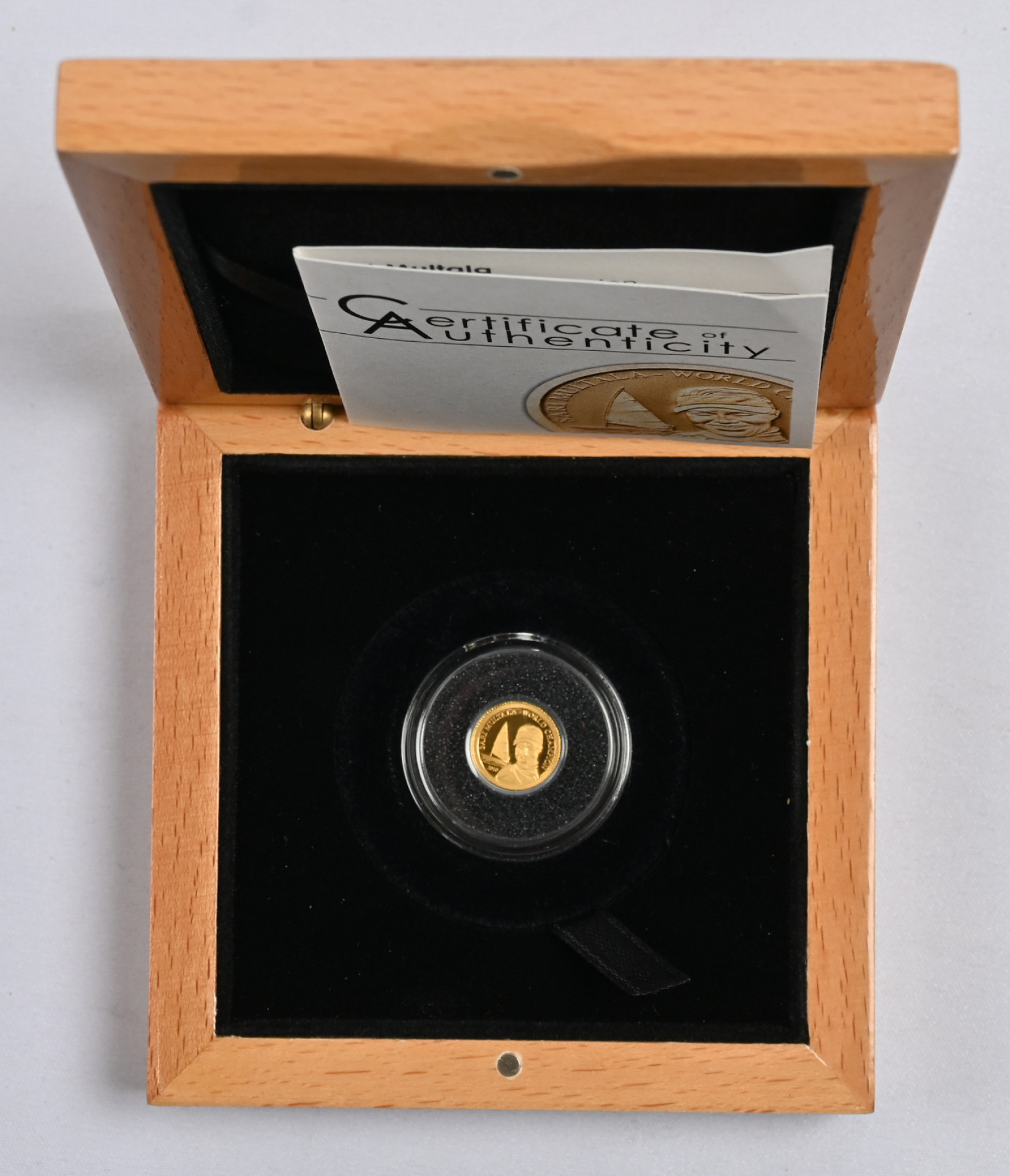 Kolme pientä kultarahaa: Viro 1995 ”Eesti Pank” (1,73 g - 0,900) ja Cook-saaret 2010 ”Sari Multala” 1$ (0,5g - 0,999) kaksi kappaletta (rasiassa ja rahakirjeessä)