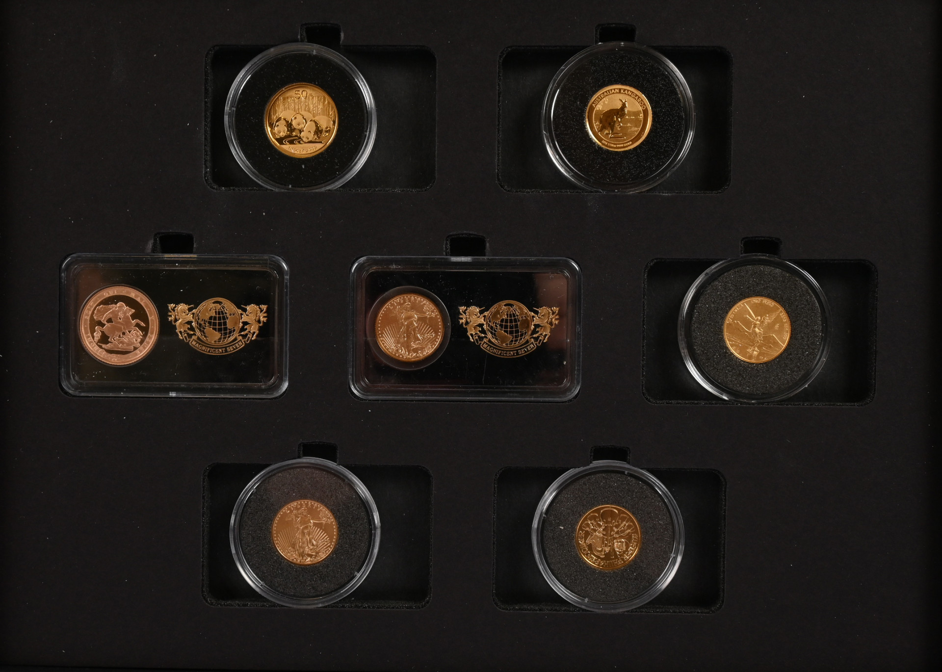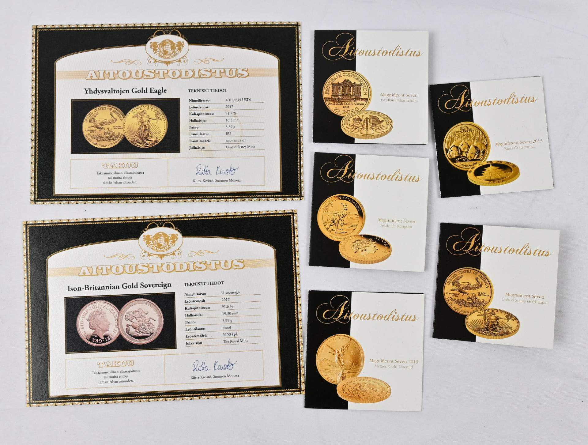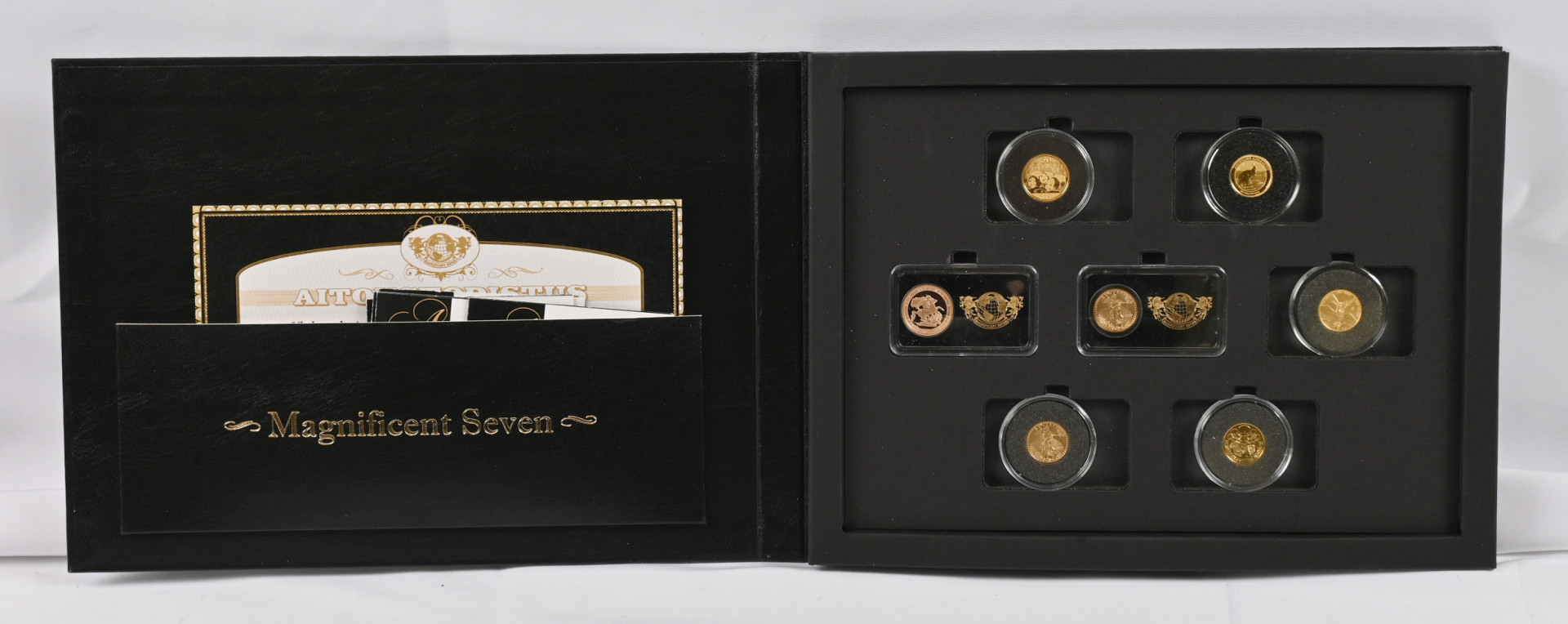 Magnificient Seven -kokoelma jossa seitsemän kultarahaa kapseleissa keräilykansiossa aitoustodistuksin. Hienoja keräilyrahoja, 24 ja 22 karaatin kultaa