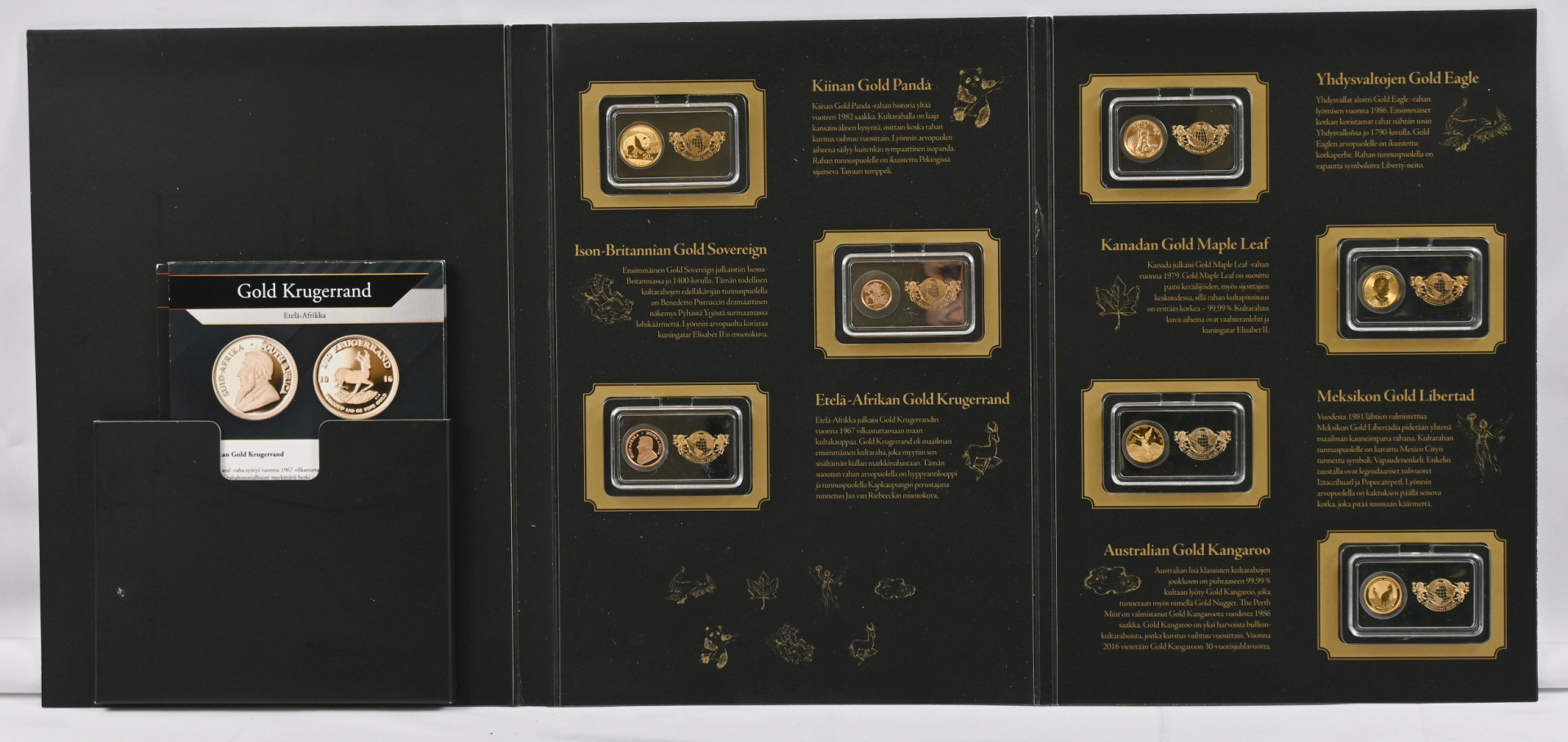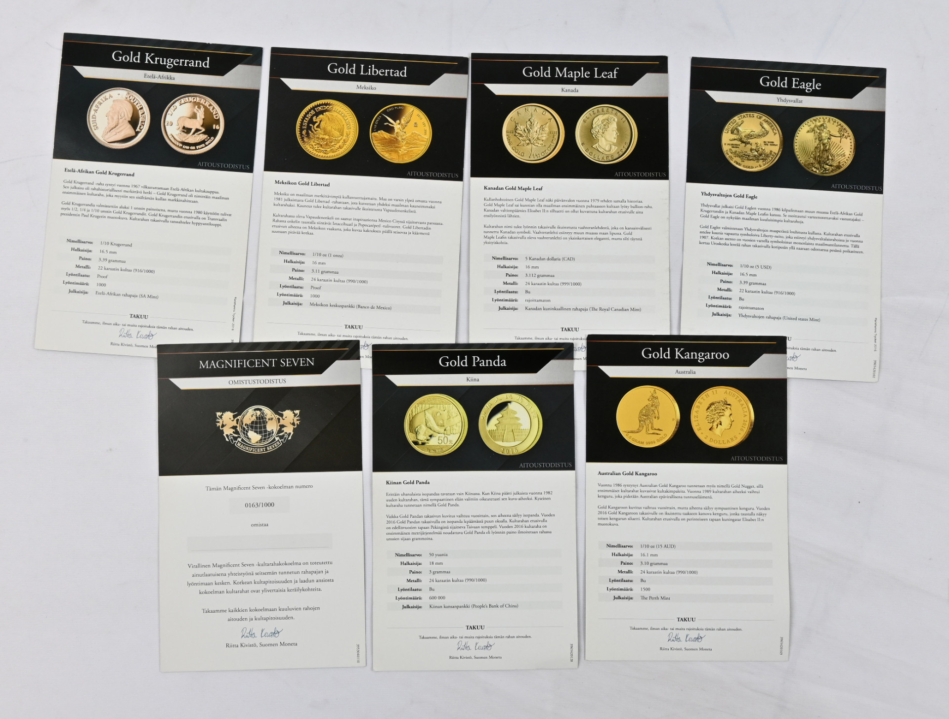 Magnificient Seven -kokoelma jossa seitsemän kultarahaa kapseleissa keräilykansiossa. Kuusi aitoustodistusta. Hienoja keräilyrahoja 24 ja 22 karaatin kultaa