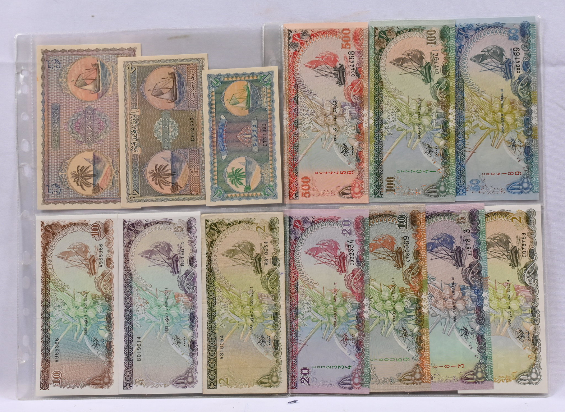 Malediivit, upea erä 15 erilaista seteliä. Harvinaiset 1960 1, 2, 5, 10, 50 ja 100 Rufiyaa UNC, 1983 2, 5 ja 10 Rufiyaa, sekä 1990 - 2000 2, 5, 10, 20, 50, 100 ja 500 Rufiyaa. Lisäksi 1995 YK 50 vuotta 250 R hopeakolikko (28,3g - 0,925) aitoustodistuksella