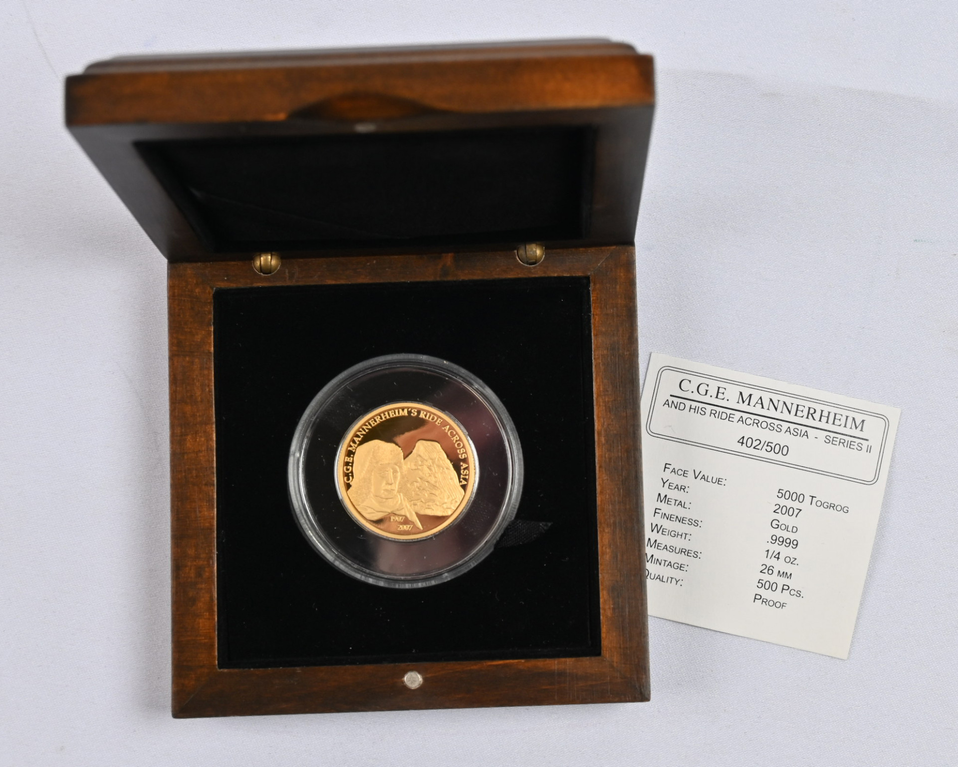 Mongolia 2007 ”Mannerheim” 5000 togrog kultaa (1/4 oz). Aitoustodistus