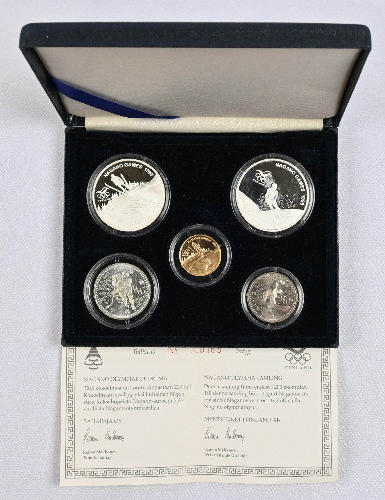 Naganon Olympialaiset-kokoelma, jossa kaksi virallista kolikkoa, kaksi hopeista Nagano-euroa sekä kultainen (8,7g - 0,750) Nagano 50 euron kolikko. Kokoelmaa tehty vain 200 kappaletta