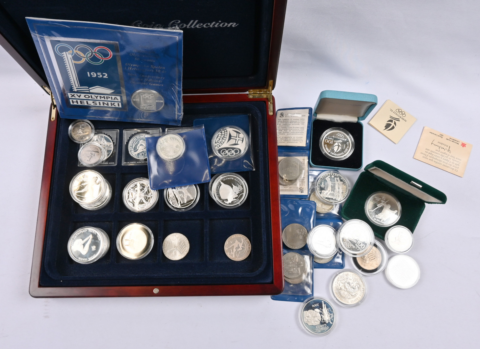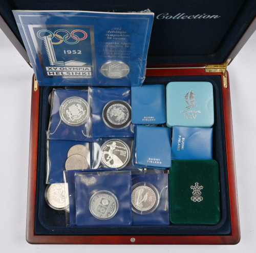 Olympialaiset, hieno erä yli 40 kappaletta juhlarahoja. Pääosin hopeaa, mutta muutama muukin. Monia painavia, isokokoisia hopearahoja. Tutkittavaa