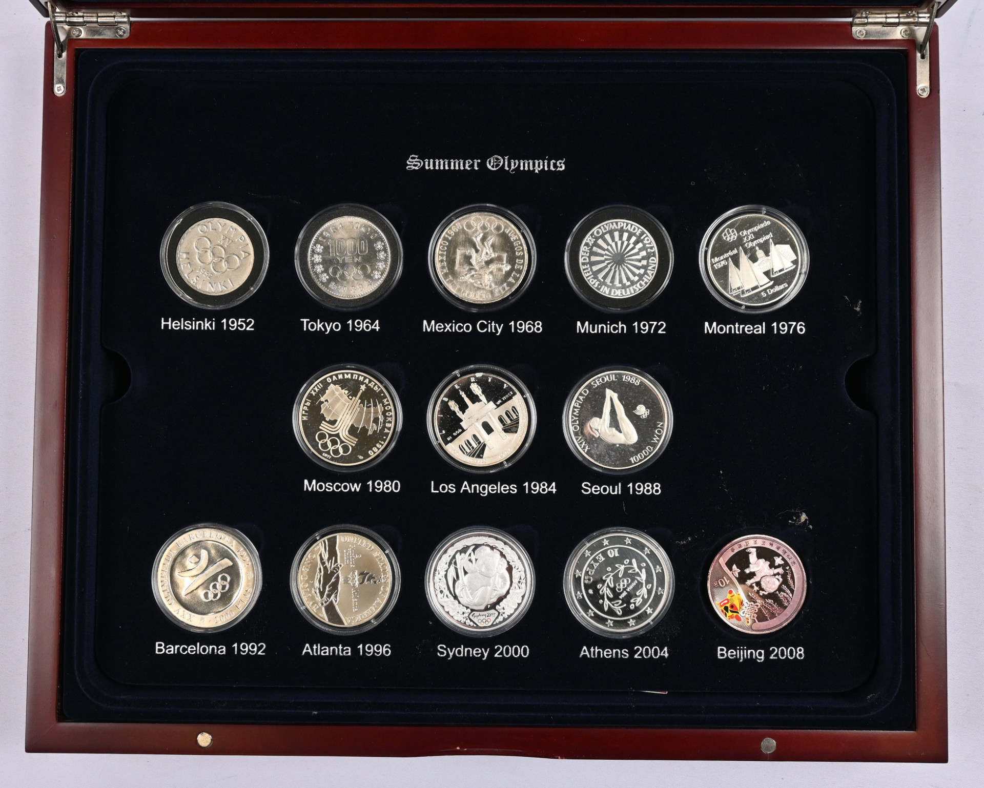 Olympic coin collection, 13 kappaletta 1952 - 2008 kesäolympialaisten hopeisia juhlarahoja puulaatikossa. Aitoustodistus.