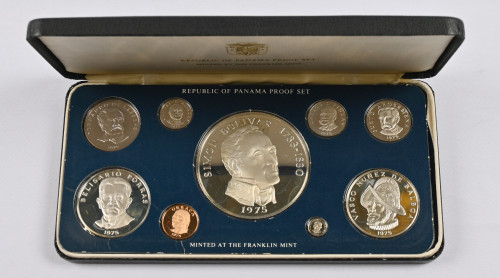 Panama 1975 proof set, yhdeksän hyvää kolikkoa, mm. painava 20 Balboaa (129,6g - 0,925)