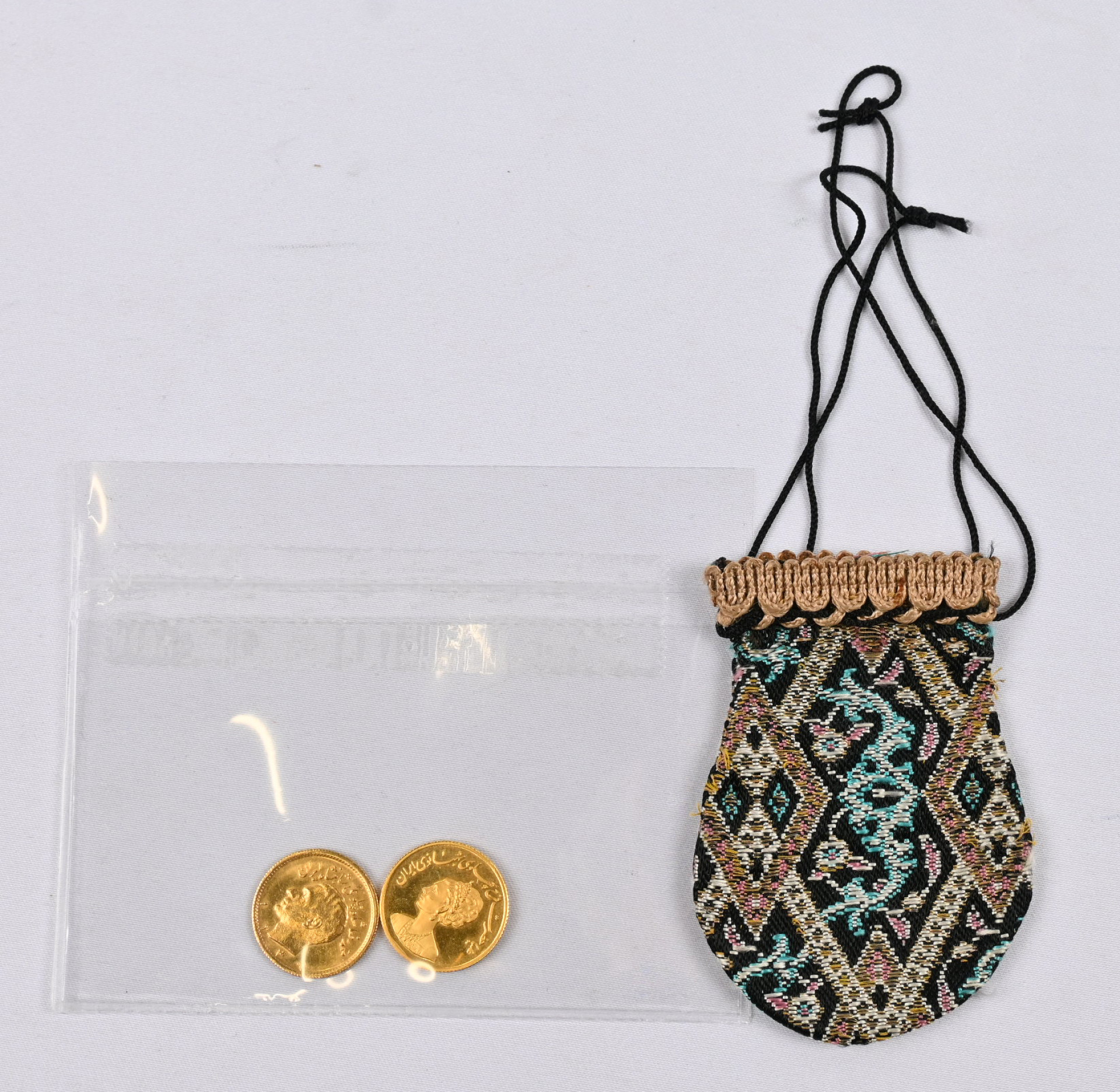 Persian imperiumin 2500-vuotisjuhlan kunniaksi Persepoliksessa juhlavieraille jaettu korukudottu pussi, jossa kaksi kultakolikkoa: Iran, kuningatar Farahin kruunajaismitali 1978 ja Iran ½ pahlavi vuodelta 1968