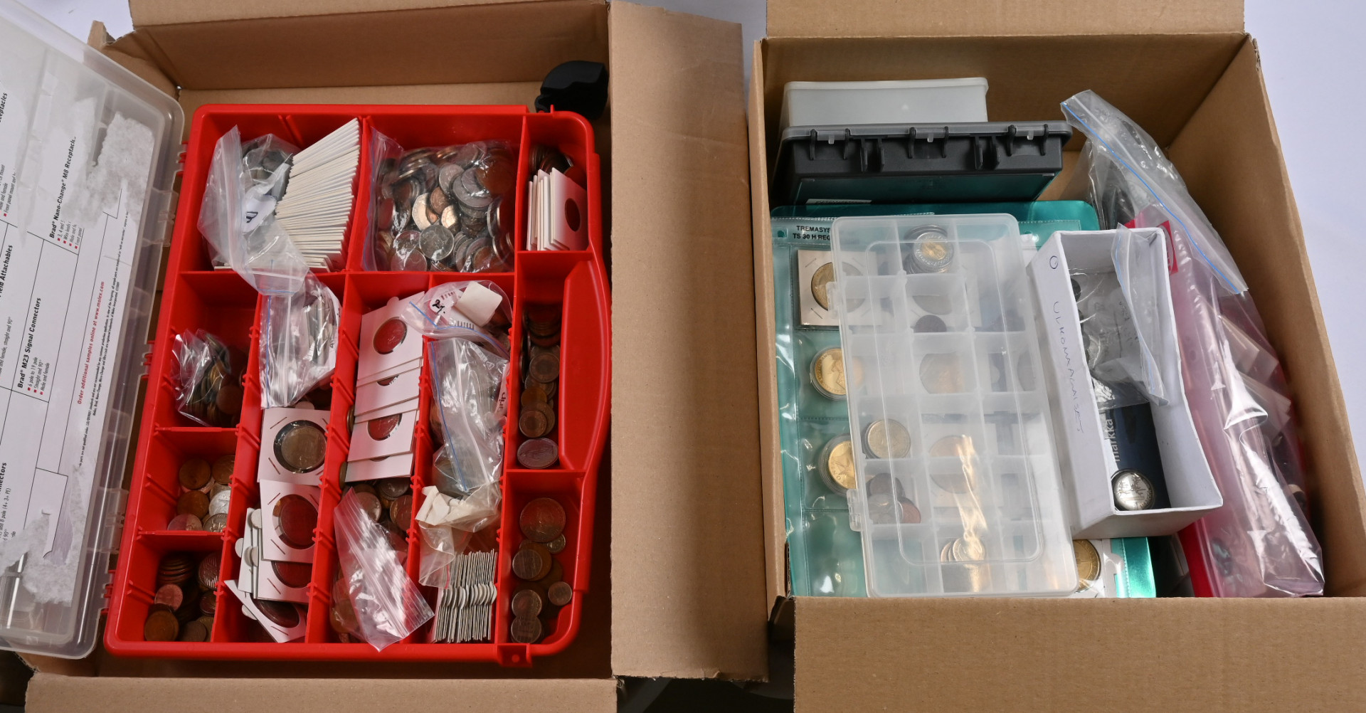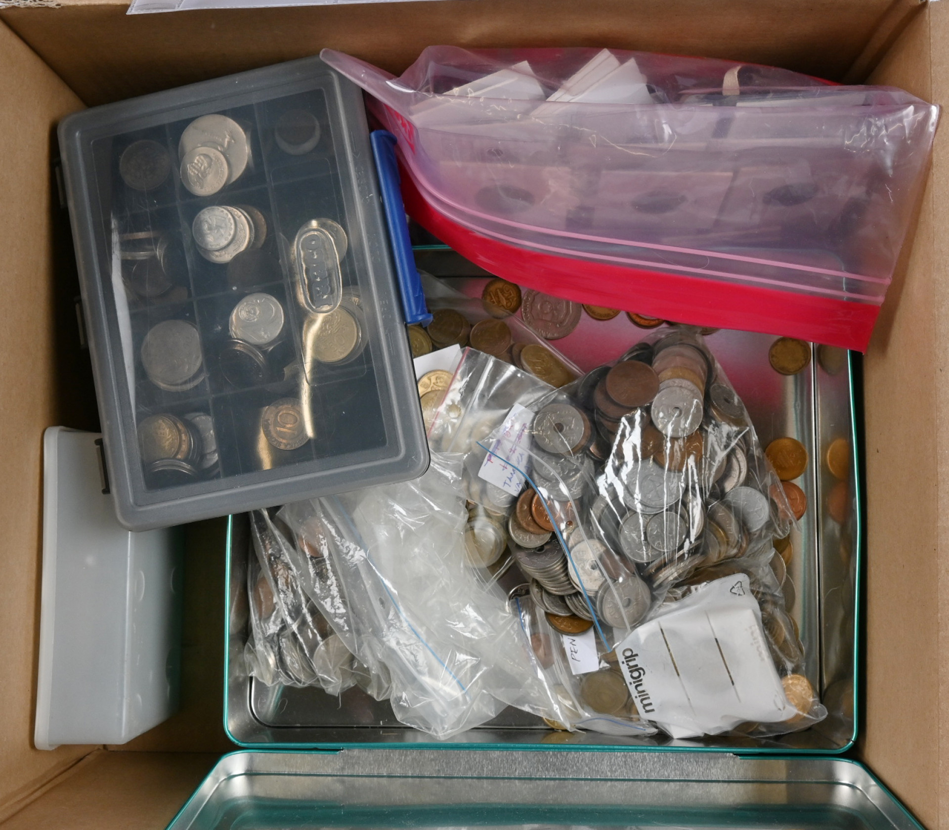 Sekalainen erä ulkomaiden kolikoita kahdessa laatikossa, yhteensä noin 13 KG