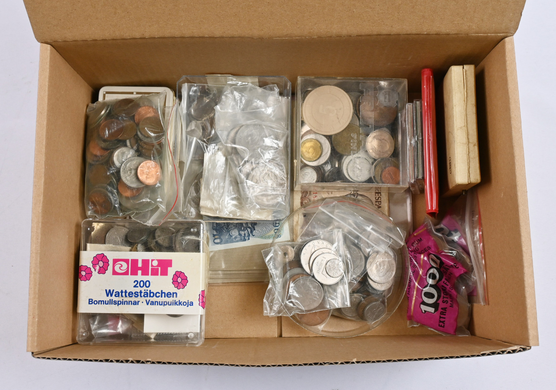 Ulkomaisia kolikoita ja seteleitä 3,5 KG laatikko. Monipuolisesti eri maista, eniten Saksaa, Venäjää ja USA:ta. Iso nippu saksalaisia 1920-luvun seteleitä, vanhoja venäläisiä pronssikolikoita ym. Tutkittavaa