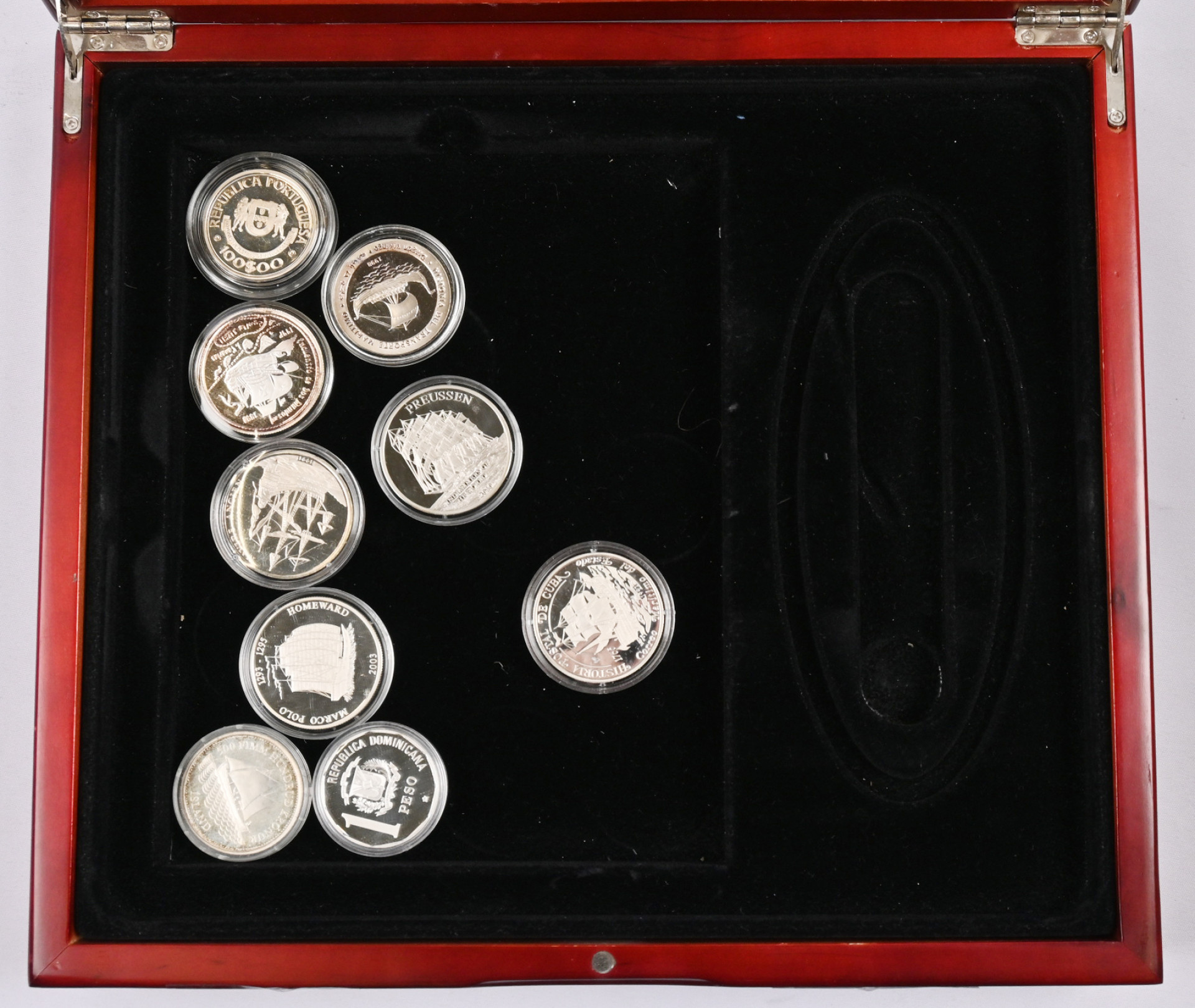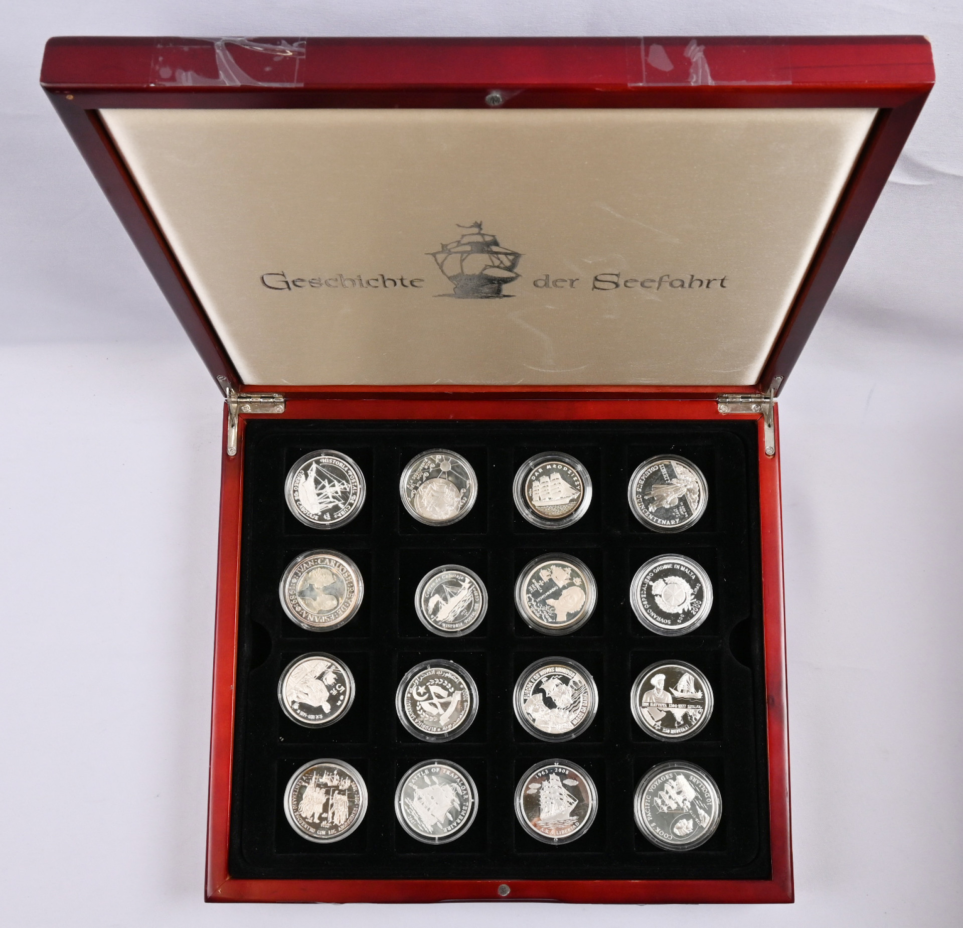 Ulkomaisia merenkulkuun ja laivoihin ym. liittyviä hopeakolikoita hieno erä 25 kappaletta laatikossa. Monista eri maista, paljon isokokoisia arvokkaita.