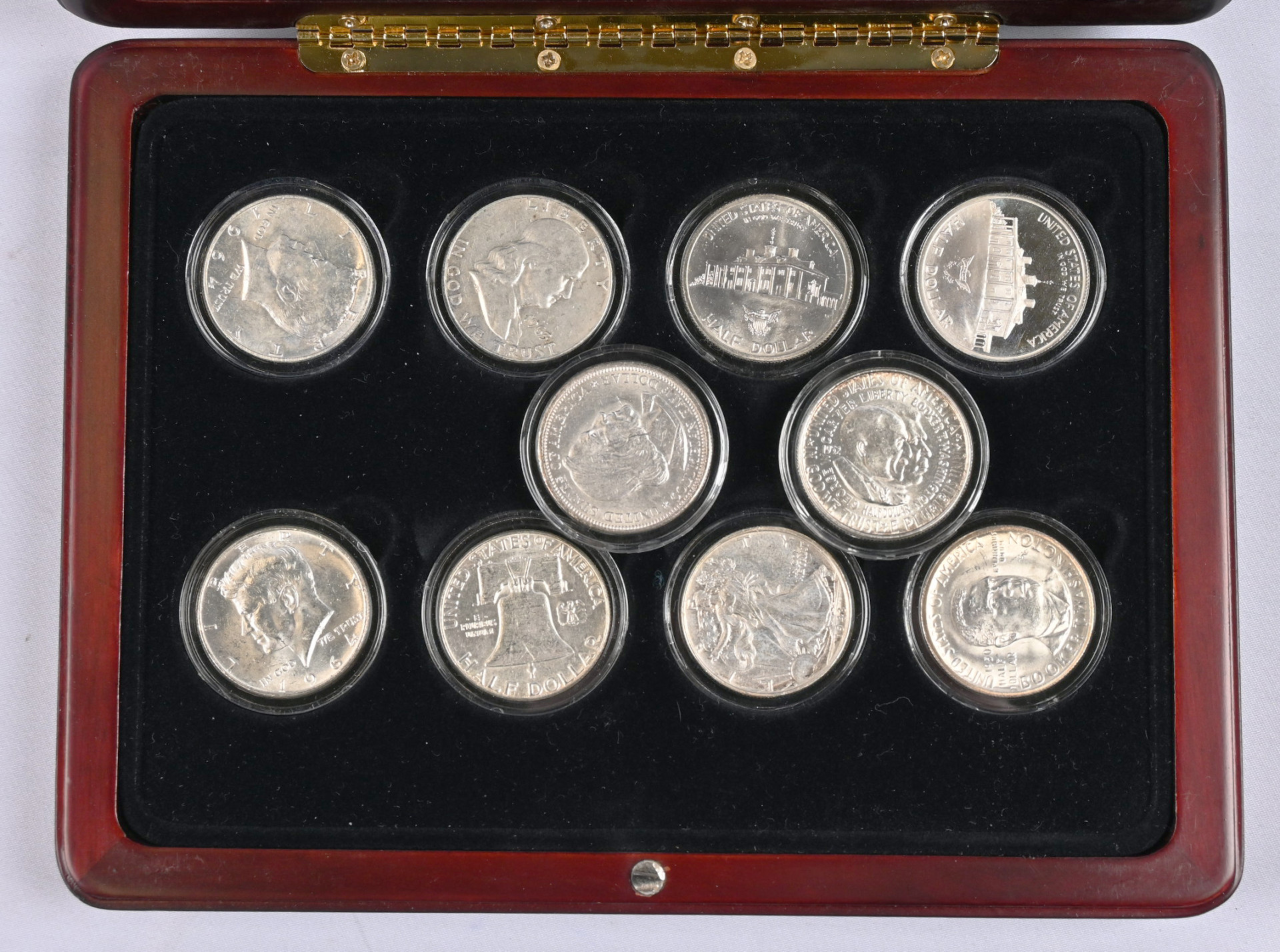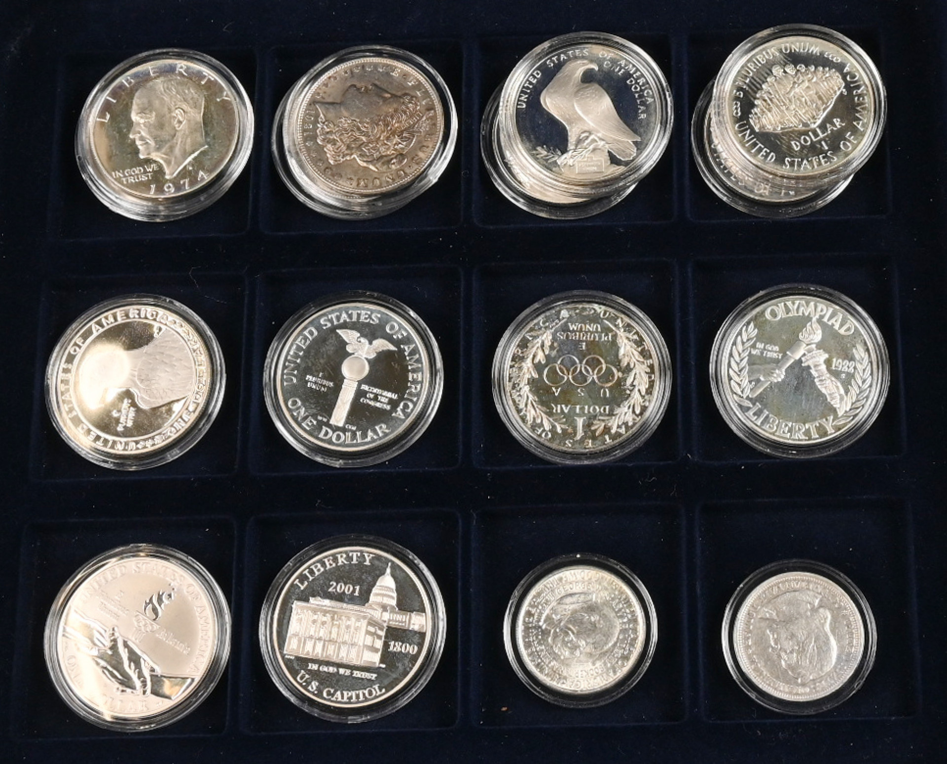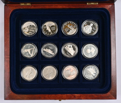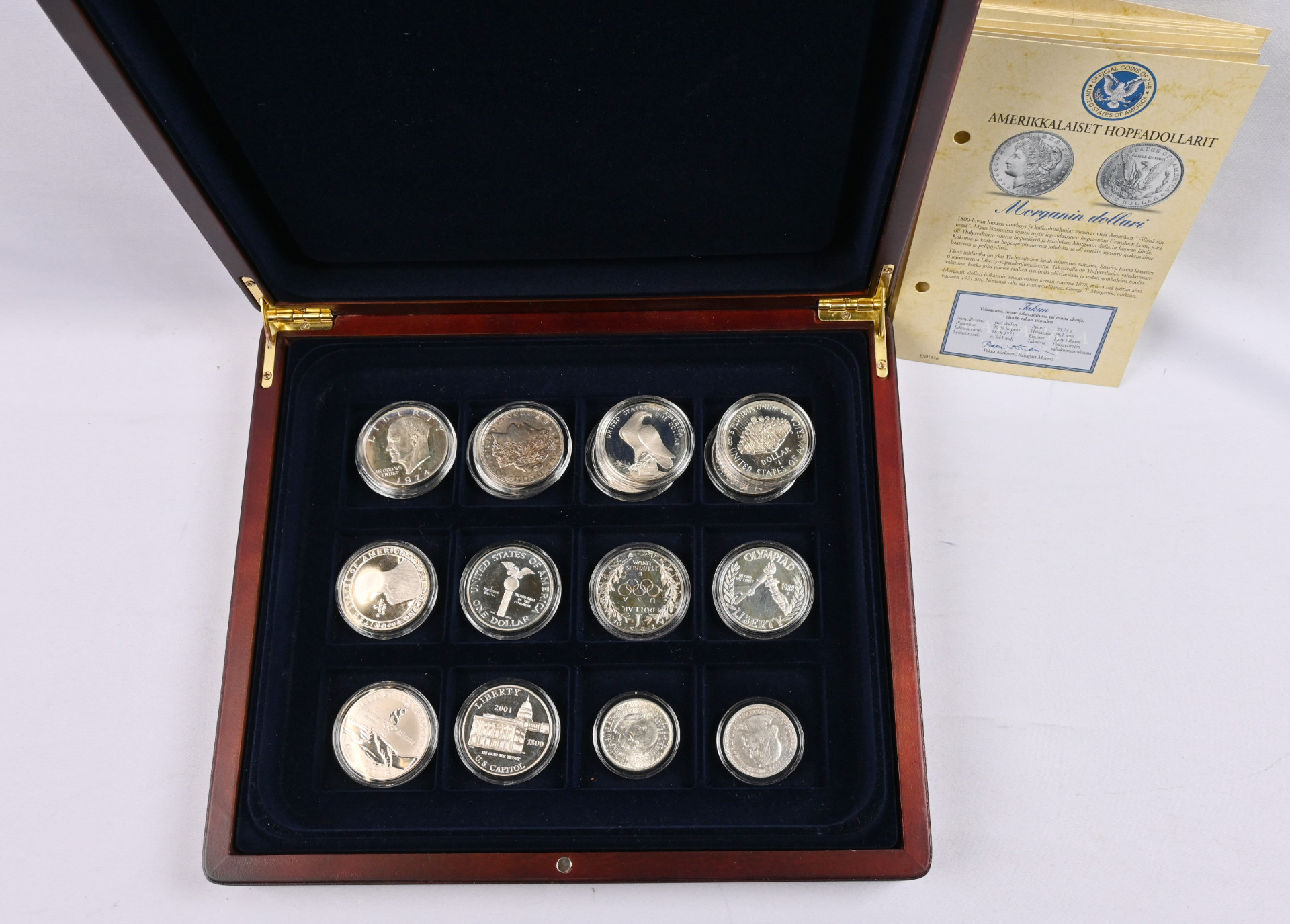 USA, hieno erä yhden dollarin (26) ja ½ dollarin (12) hopearahoja kolmessa puulaatikossa. Aitoustodistukset. Monia arvokkaitakin mukana