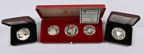 Olympia, Moskovan 1980 kisojen 10 ruplan ja kahden viiden ruplan hopeakolikon sarja rasiassa aitoustodistuksin sekä kaksi kappaletta Itävallan 200 shillingin hopearahoja vuodelta 1995 aitoutuksin