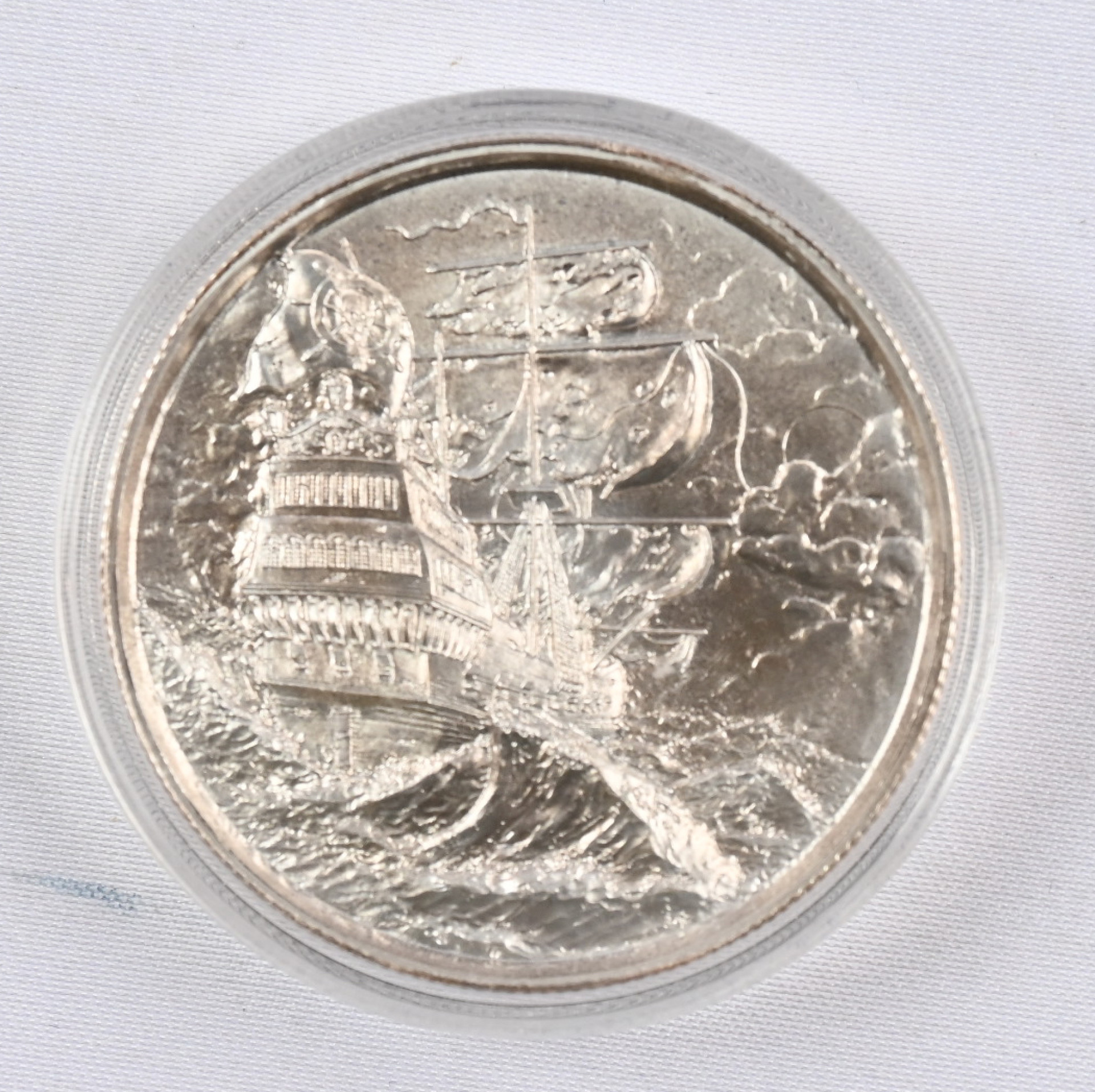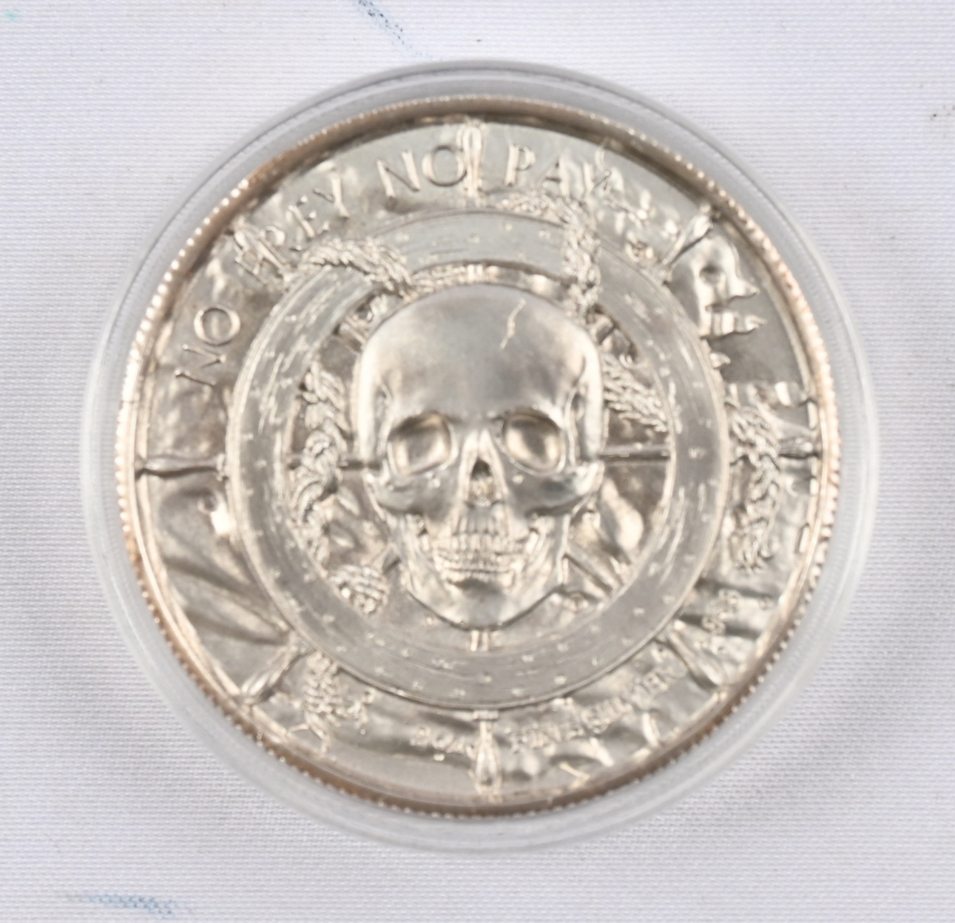 Hopeamitali ”Silver Pirate” 2 unssia (0,999). Teksti ”NO PREY, NO PAY” ja pääkallokuvio. Hieno