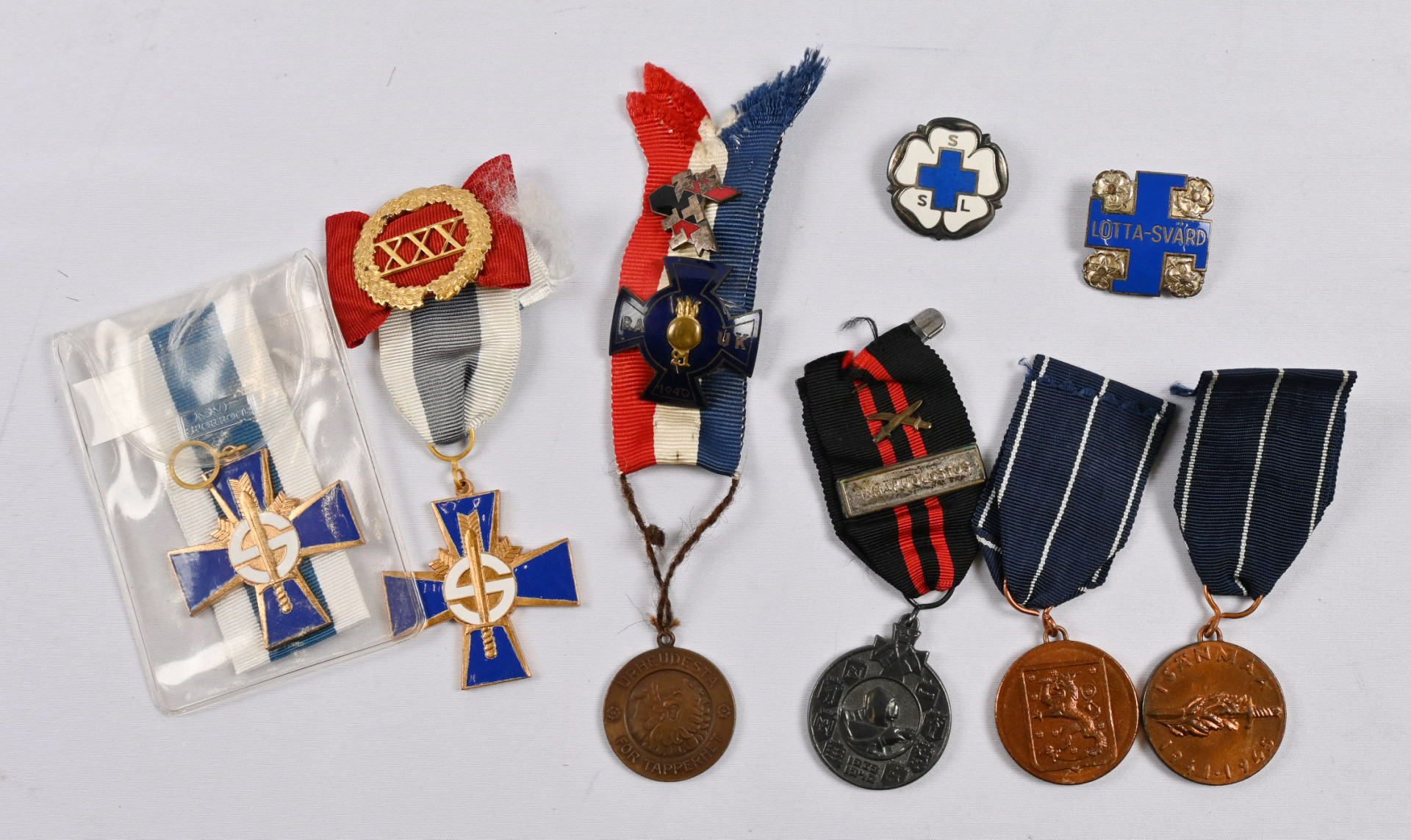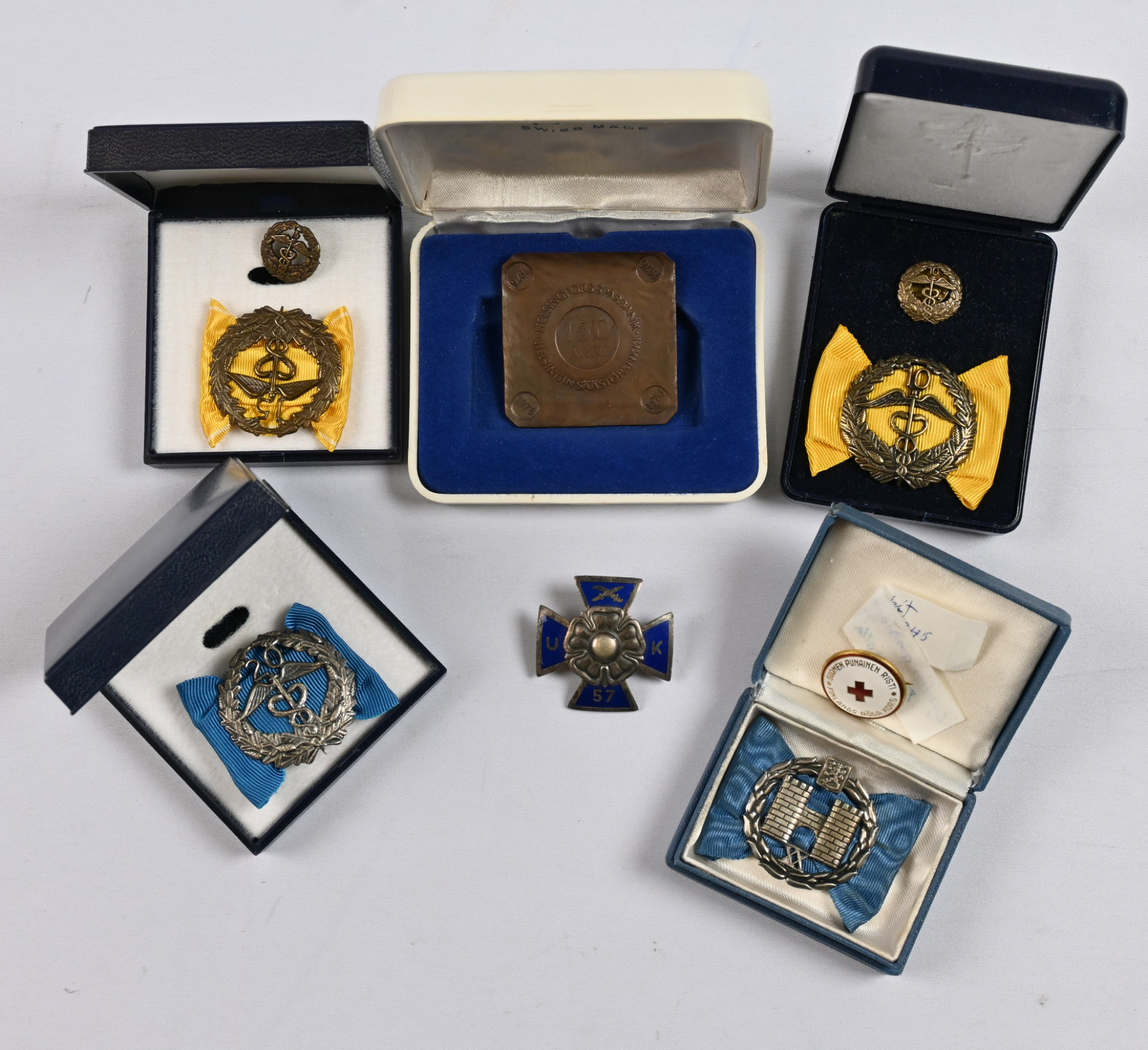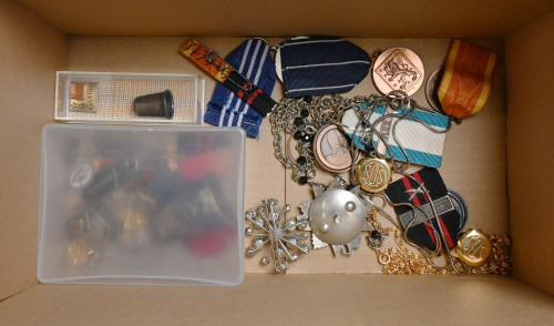 Kiintoisa erä vähän kaikkea mm. kunniamerkkejä 11 kpl, pinssejä, sormusta ym