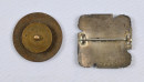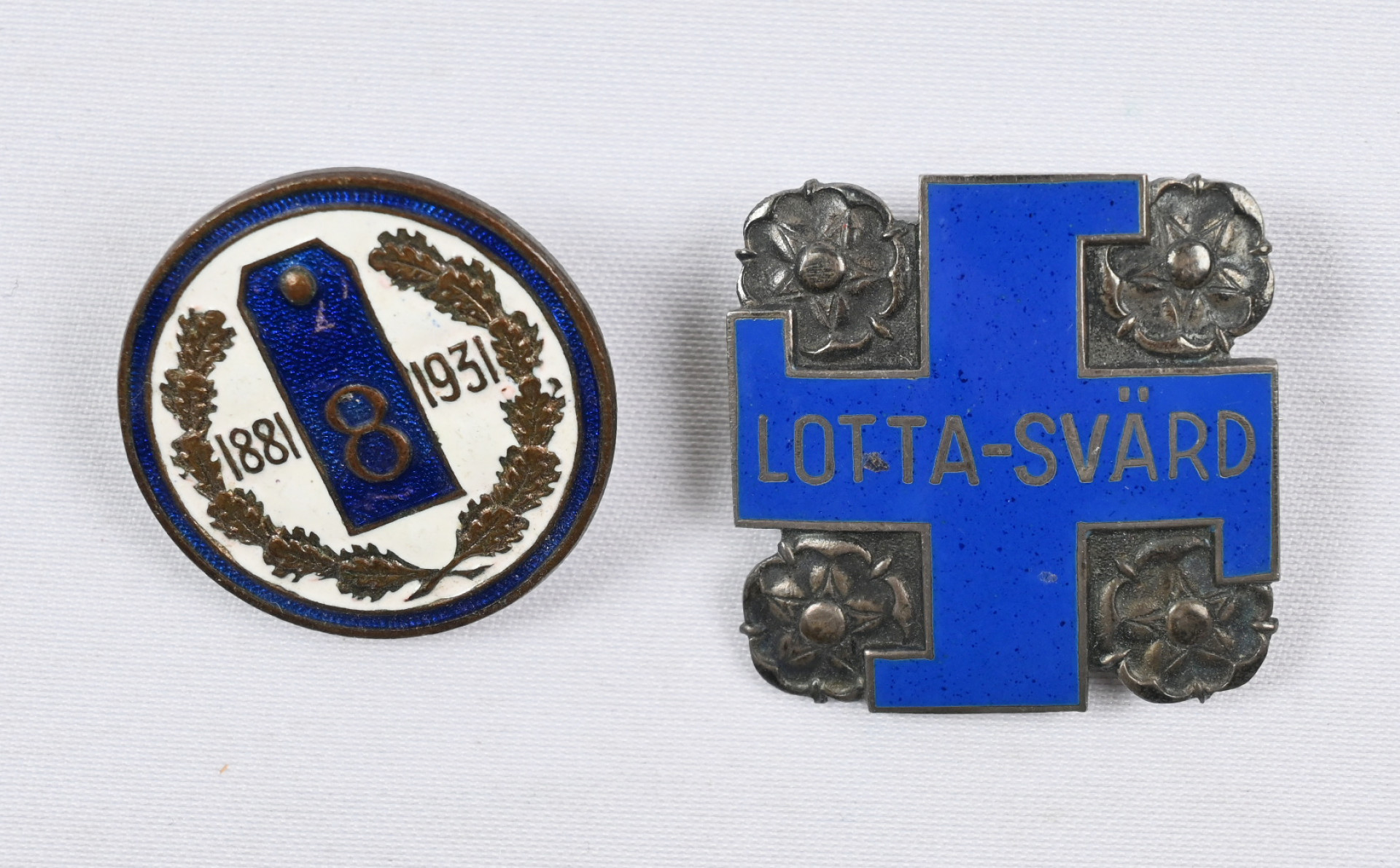 Lotta-Svärd-merkki (neulakiinnitys) ja Viipurin 8. tarkk’ampujapataljonan 50-vuotismerkki (ruuvikiinnitys). Hyväkuntoiset