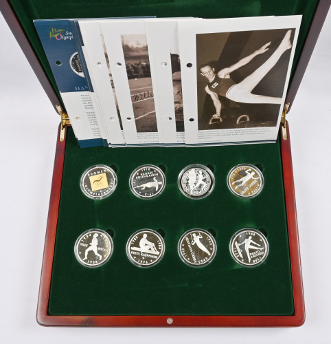 Monetan ”Suomen Olympiasankarit”, kokoelma 8 kappaletta hopeisia mitaleita (925) puulaatikossa. Aitoustodistukset