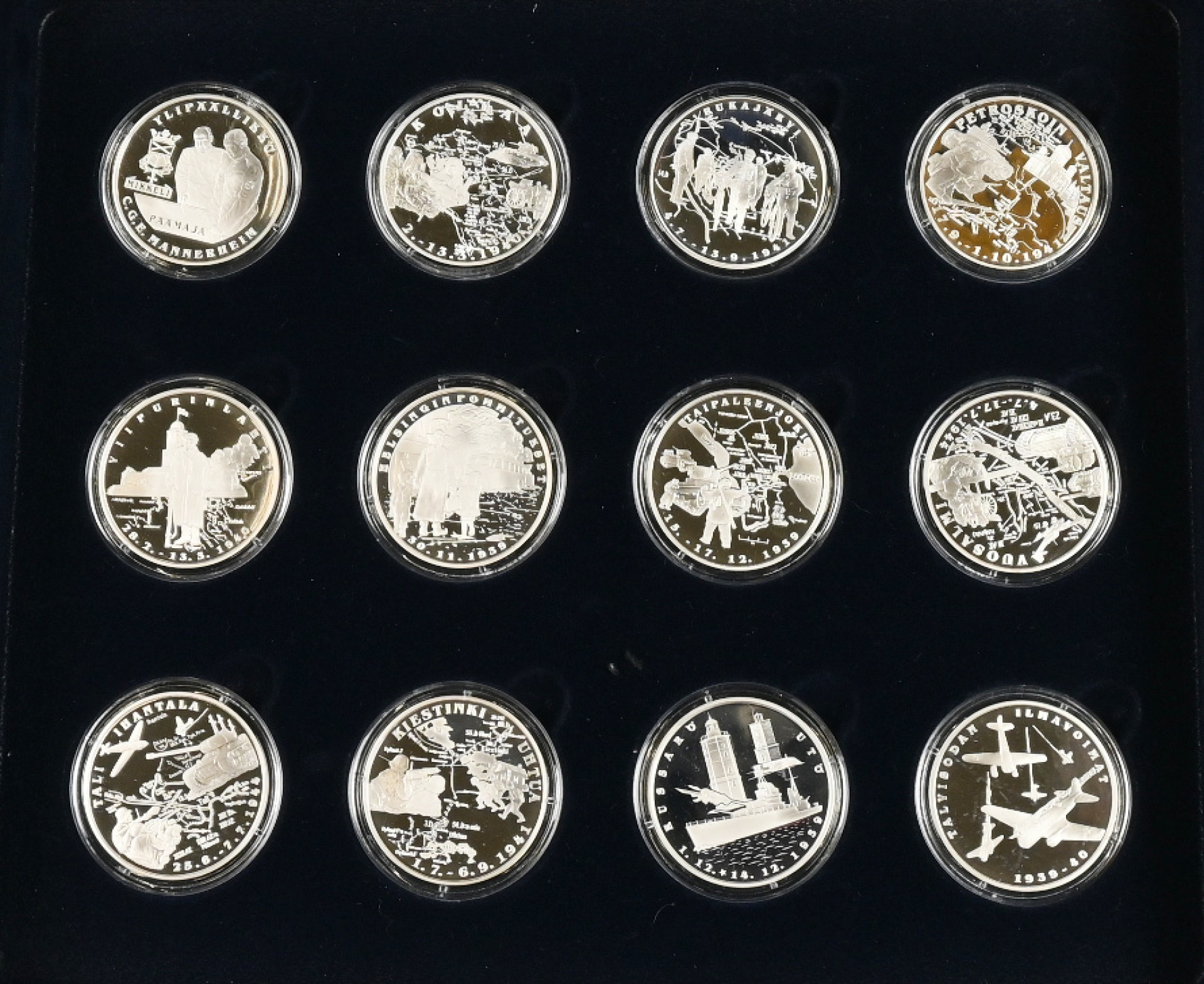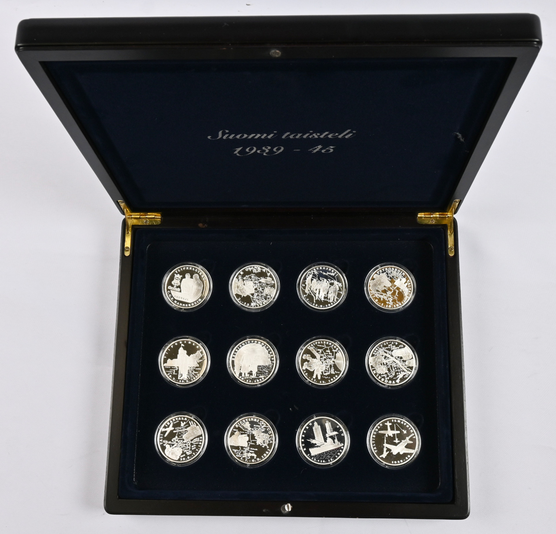 Monetan ”Suomi Taisteli” hopeamitalikokoelma, 12 hopeamitalia (925) laatikossa
