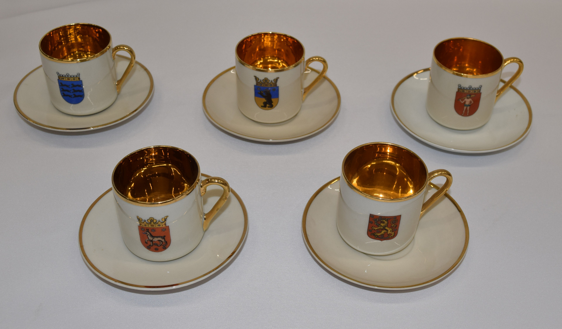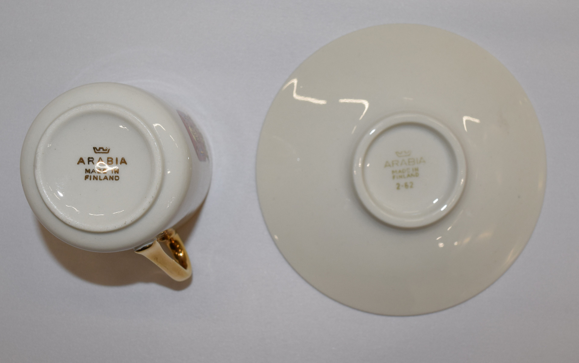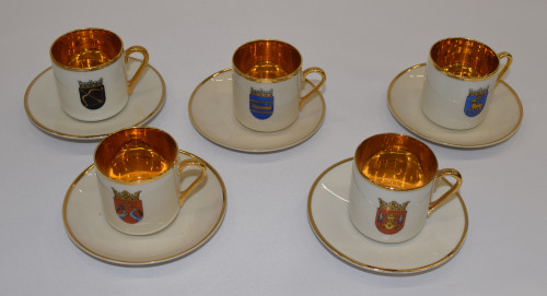 Arabian ”Maakunta” -sarjan mokkakupit lautasineen kymmenen erilaista. Hienot kultaukset, hyvä kunto. VAIN NOUTO