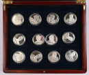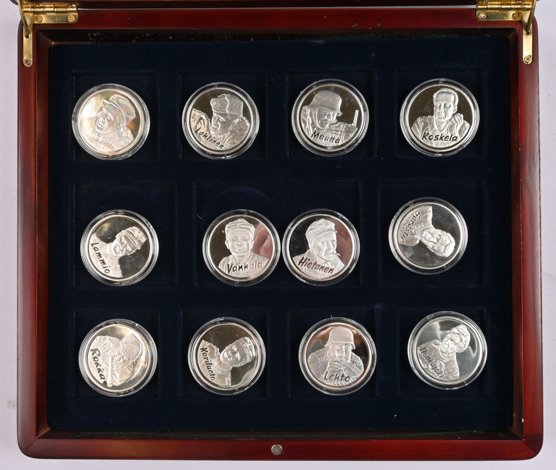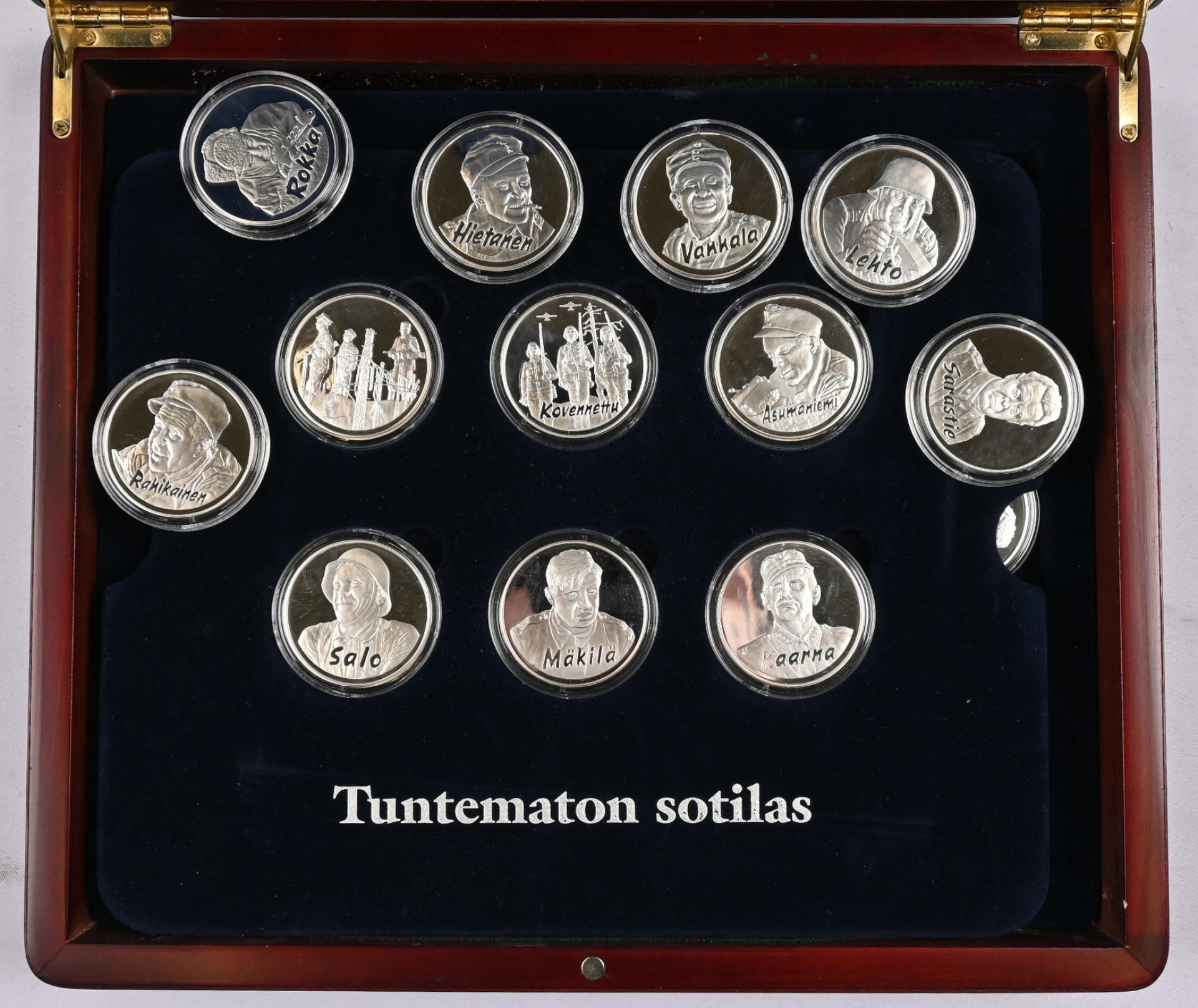 Monetan ”Tuntematon sotilas” hopeisia mitaleita (925) kokoelma laatikossa. 24 mitalia, osin samojakin. Aitoustodistukset