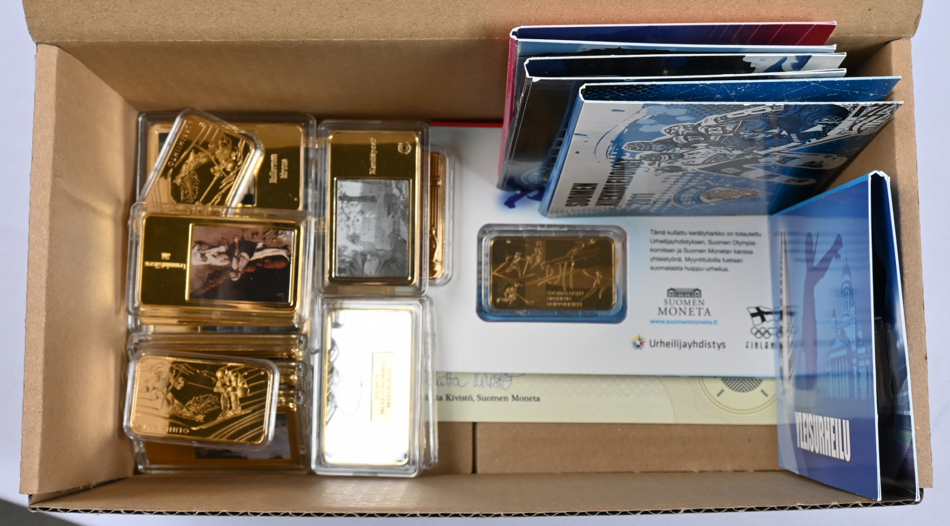 Monetan Kaikuja Kalevalasta keräilyharkkoja 12 kpl kullattua messinkiä + urheilu ym harkkoja 11 kpl
