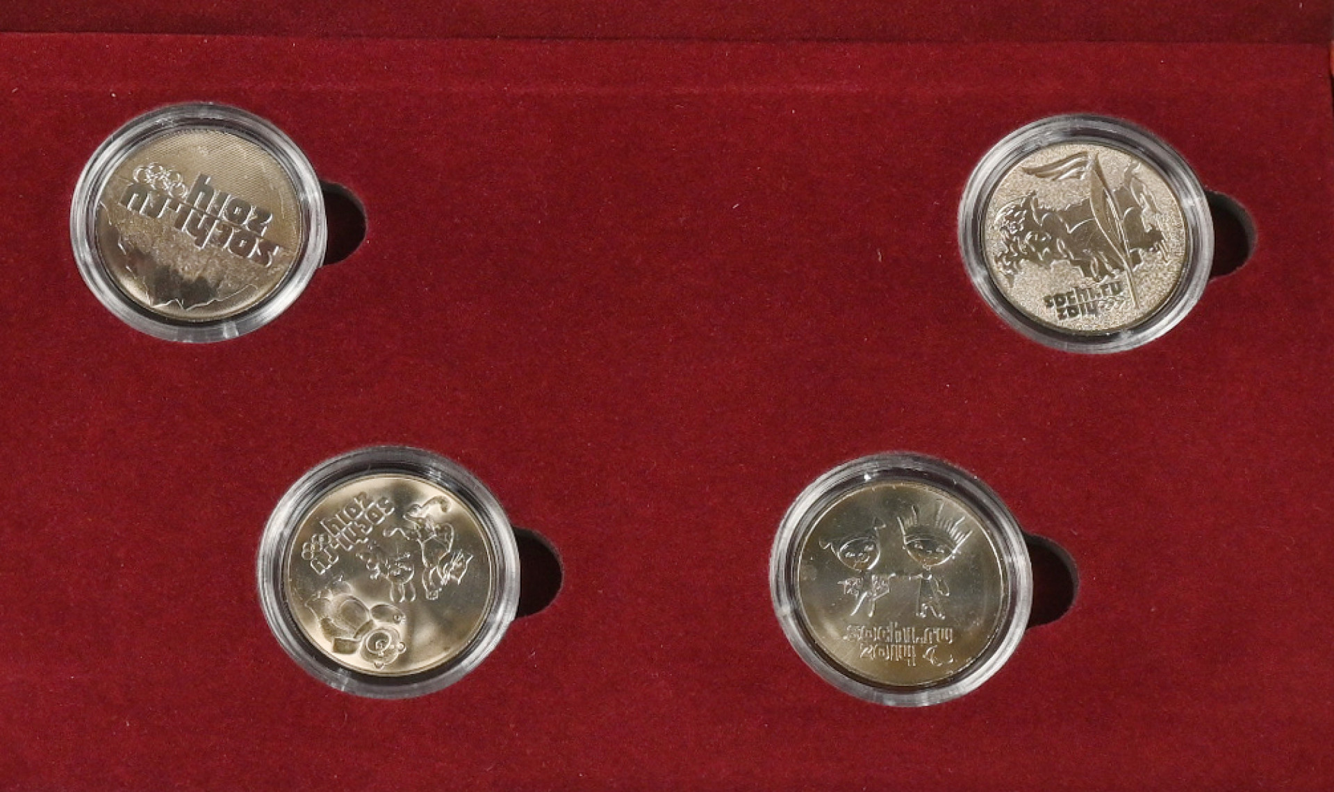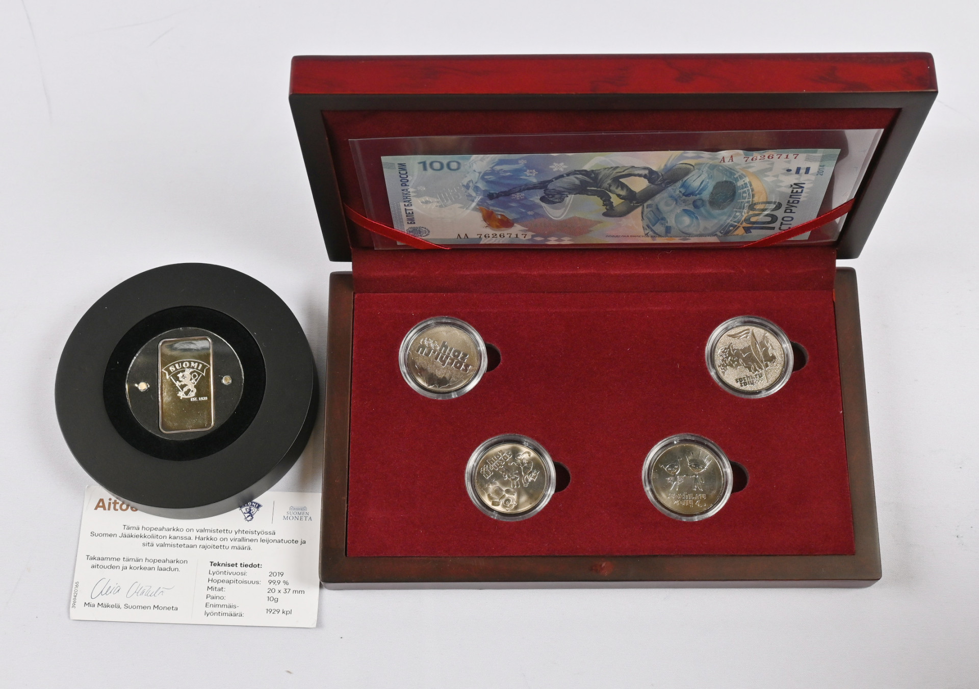 Monetan keräilyharkko 2019 Suomen jääkiekkoliitto, hopeaa 10g. Lisäksi Venäläinen Sotsin Olympilaisten rahasarja neljä erilaista 25 ruplan kolikkoa + seteli