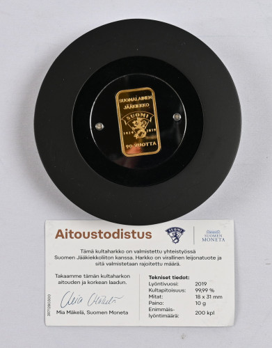 Monetan keräilyharkko: Suomalainen jääkiekko 90 vuotta, kultaa 10g. Max lyöntimäärä 200 kpl