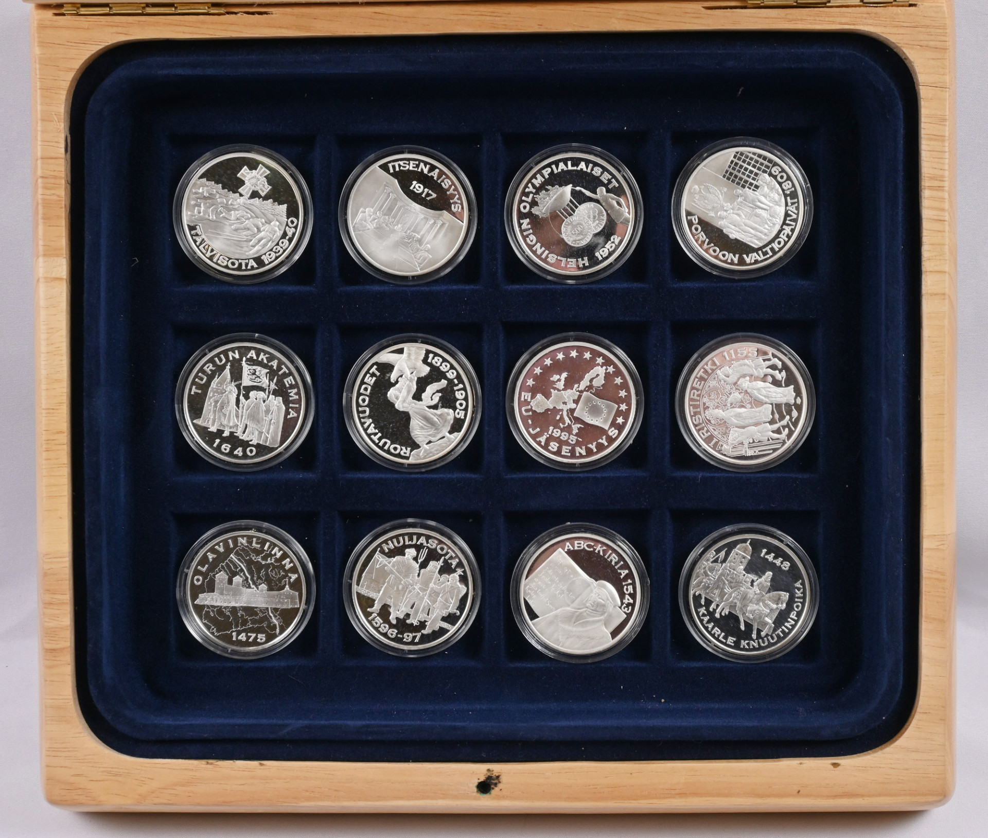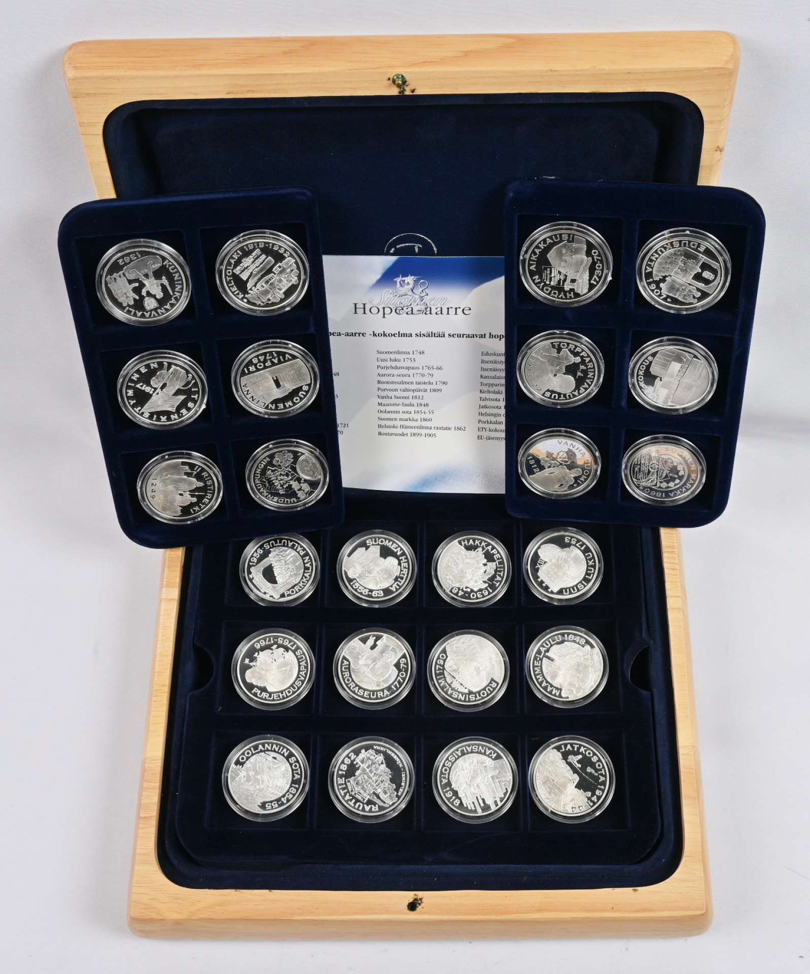 Rahapajan ”Suomen hopea-aarre” mitalikokoelma puulaatikossa. 36 hienoa mitalia (925) aitoustodistuksin.