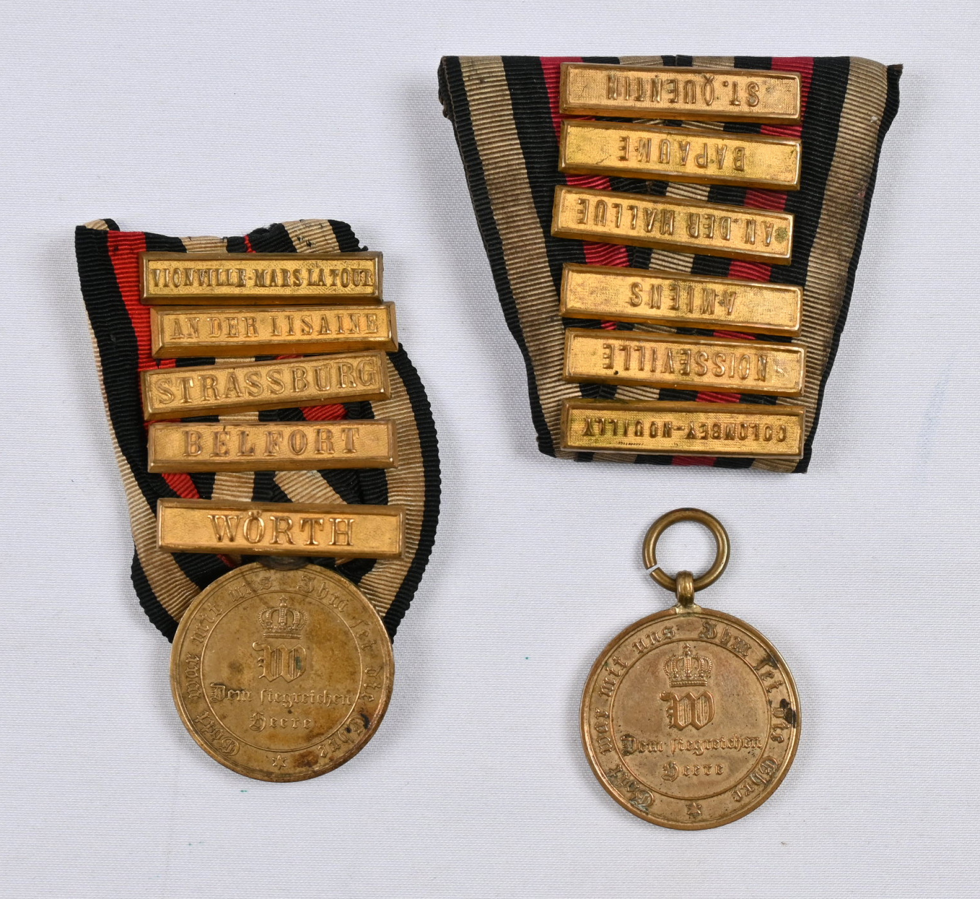 Saksan (Preussi), Ranskan sodan (1870-1871) muistomitaleja kaksi kappaletta joista toinen irti nauhasta. Pronssisten mitalien reunoissa kaiverrettu teksti "AUS EROBERTEM GESCHUETZ", mikä viittaa siihen, että mitalit on valmistettu sulatetuista ranskalaisista tykeistä. Nauhoissa yhteensä 11 taistelupaikkoihin viittaavaa kilpeä. Nimmergut 1941.