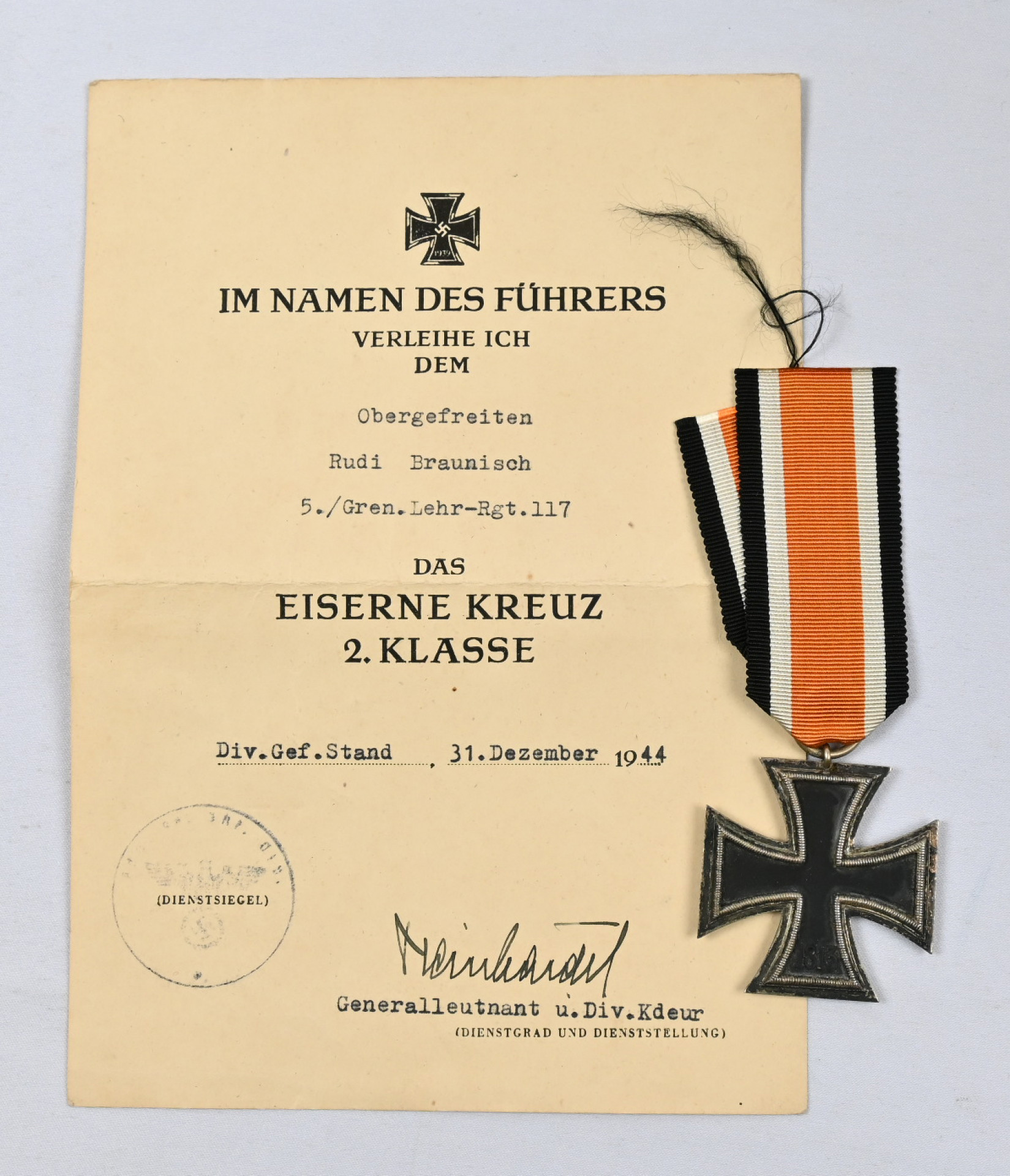 Saksan 2. luokan rautaristi nauhalla. Myöntökirja (Obergefreiten Rudi Braunisch) 31.12.1944