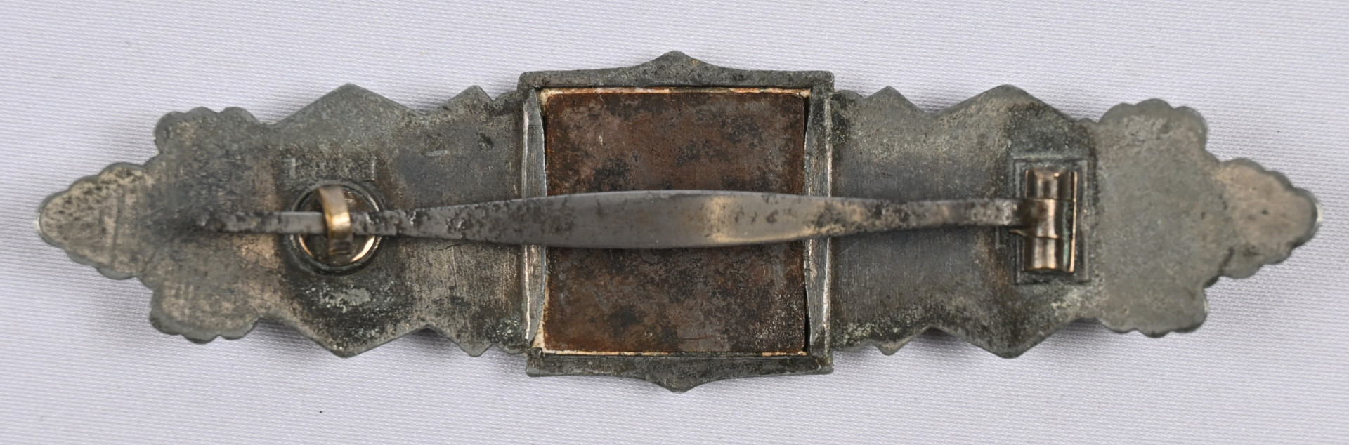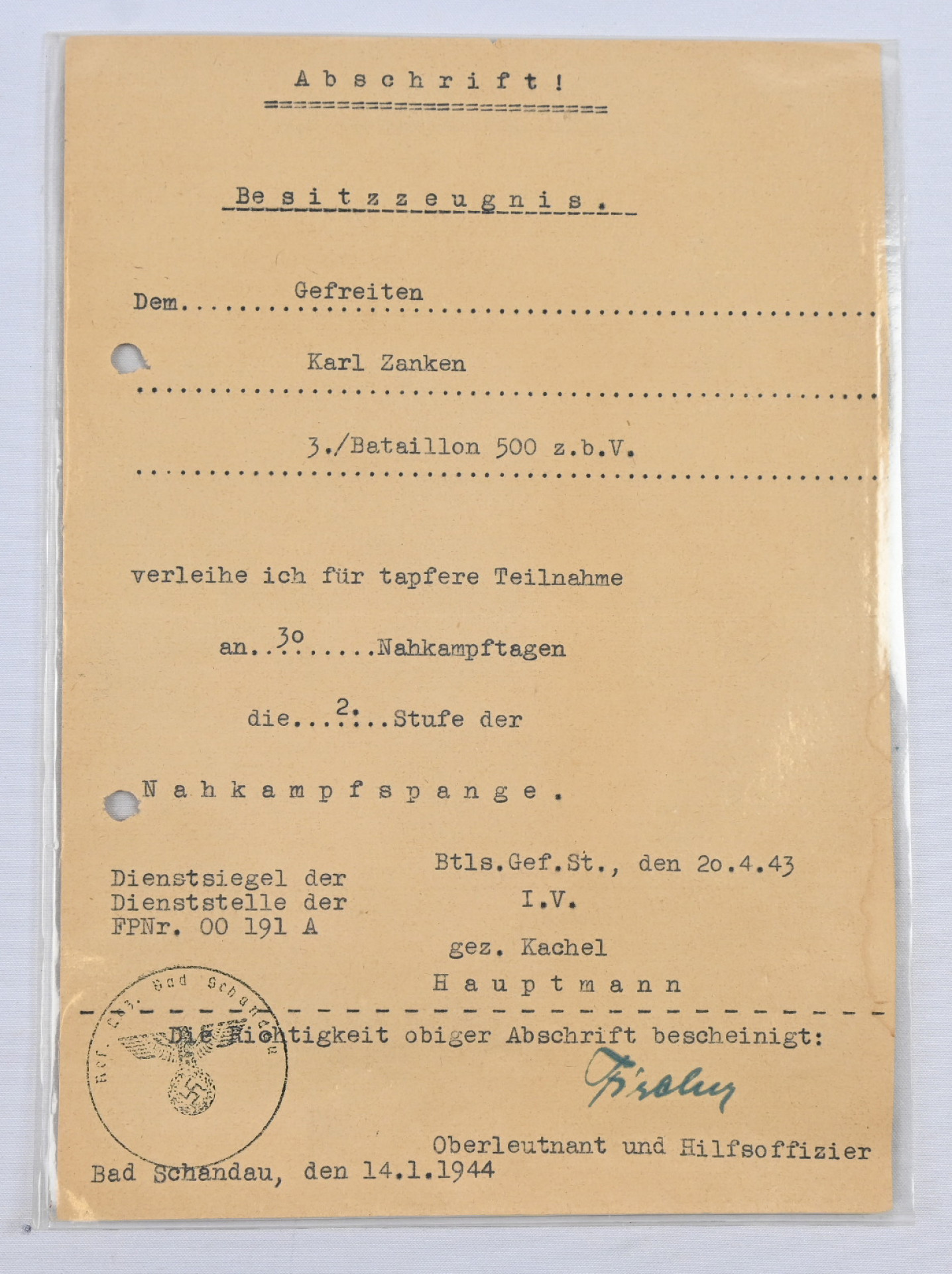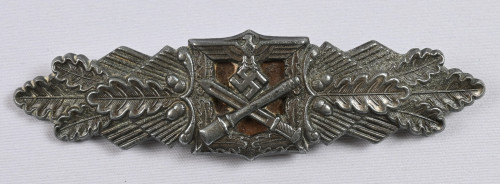 Saksan Armeijan Lähitaistelusolki, hopeinen luokka. Nimmergut 3888. Materiaalit sinkki ja hopea, jossa päällys hopeoitu. Neulakiinnitys. Oikealla valmistajan merkki F & B. L (Funke & Brüninghaus, Lüdenscheid). Neula ei ole magneettinen, musta taustalevy on. Mukana alkuperäinen myöntötodistus pv. 14.1.1944 ja leima + allekirjoitus. Myöntäjä U.gez. Kachel Hauptmann and Oberleutnant und Hilfoffizier, Bad Schandau.Btls.Gef.St.I.V. Myönnetty 9 500 kpl.
